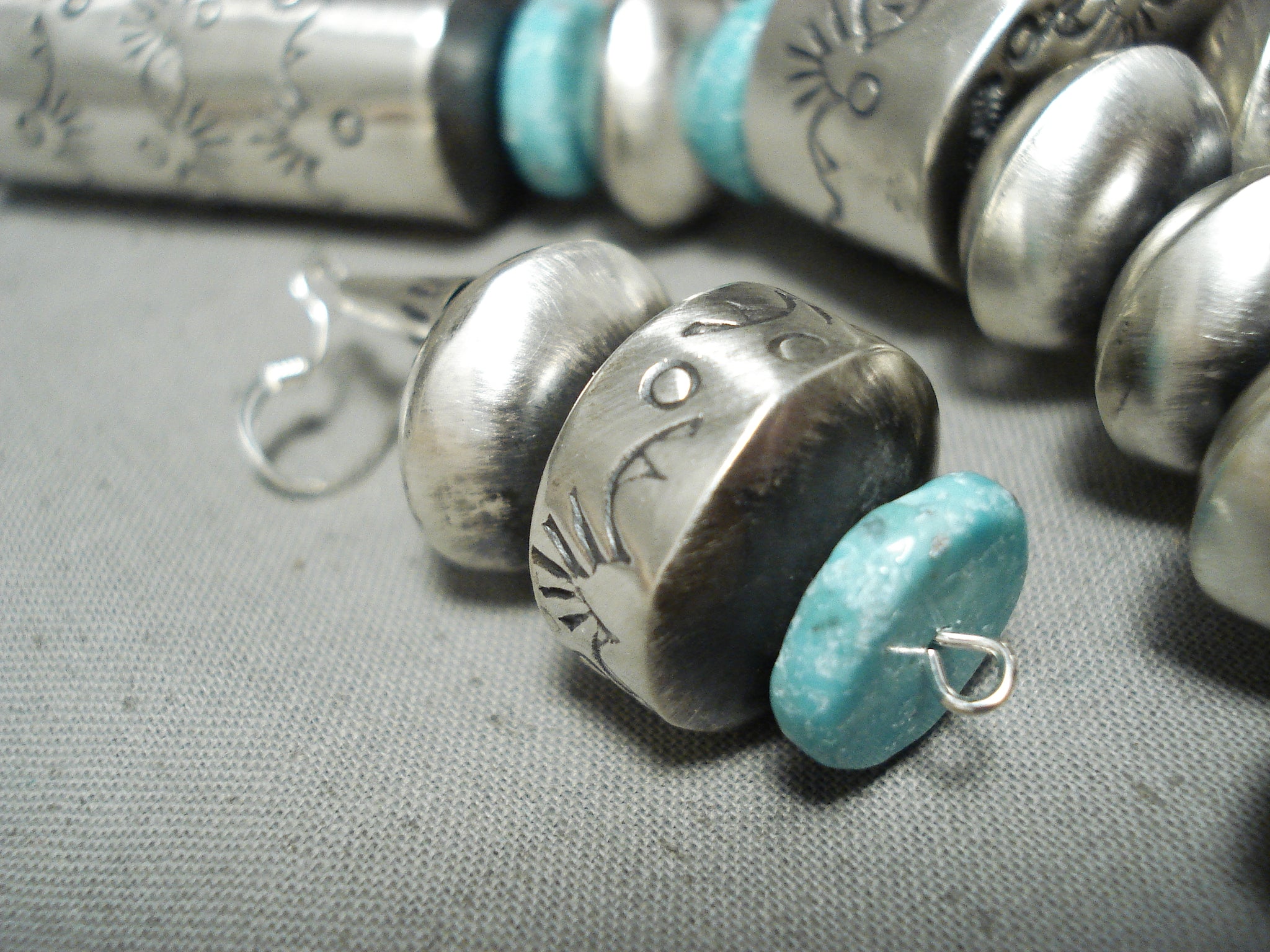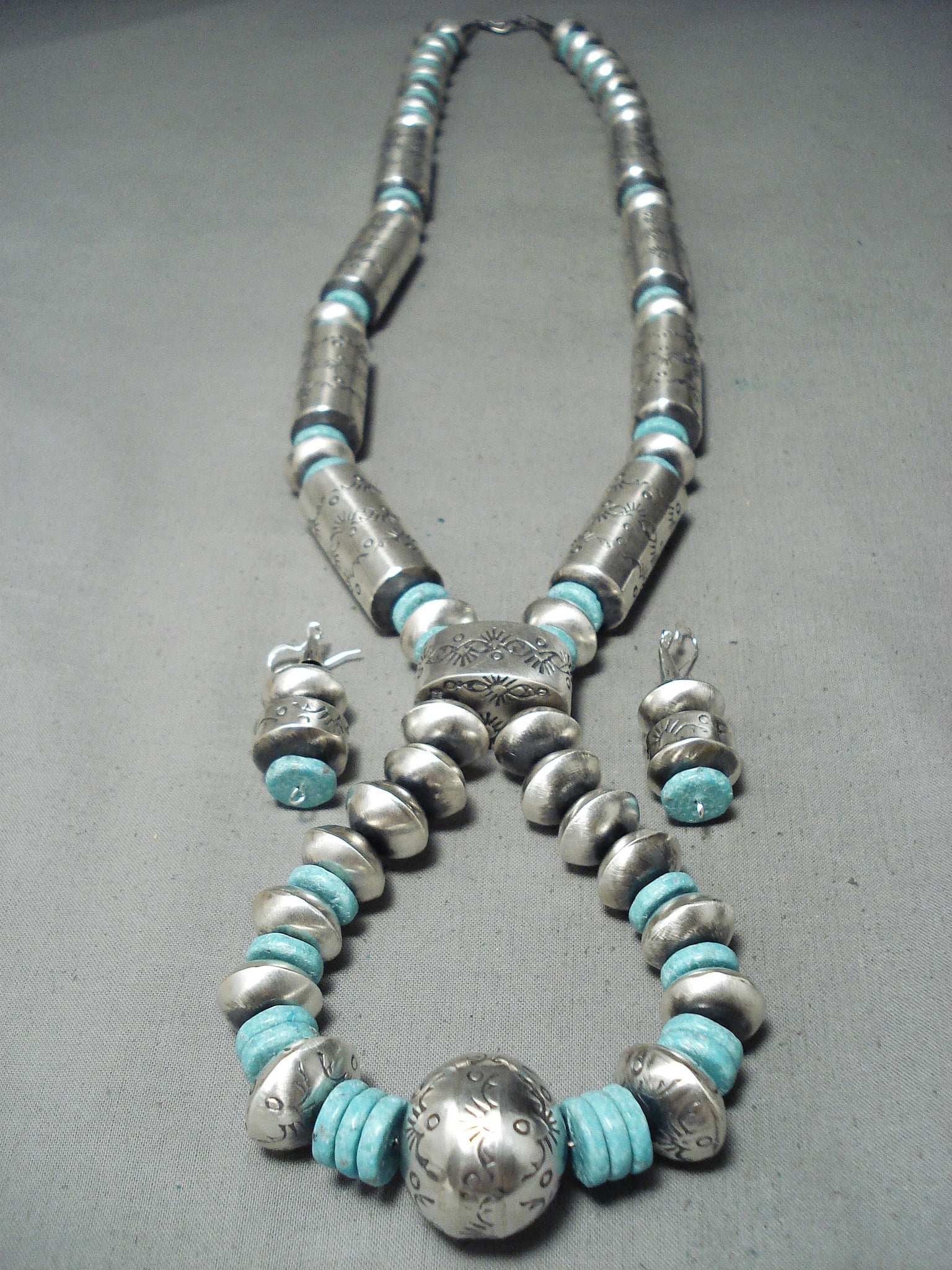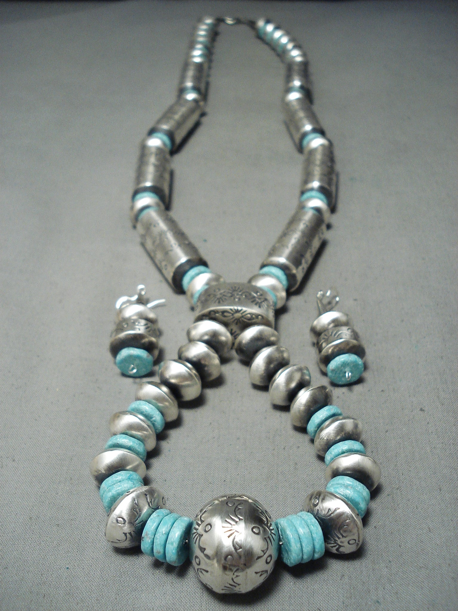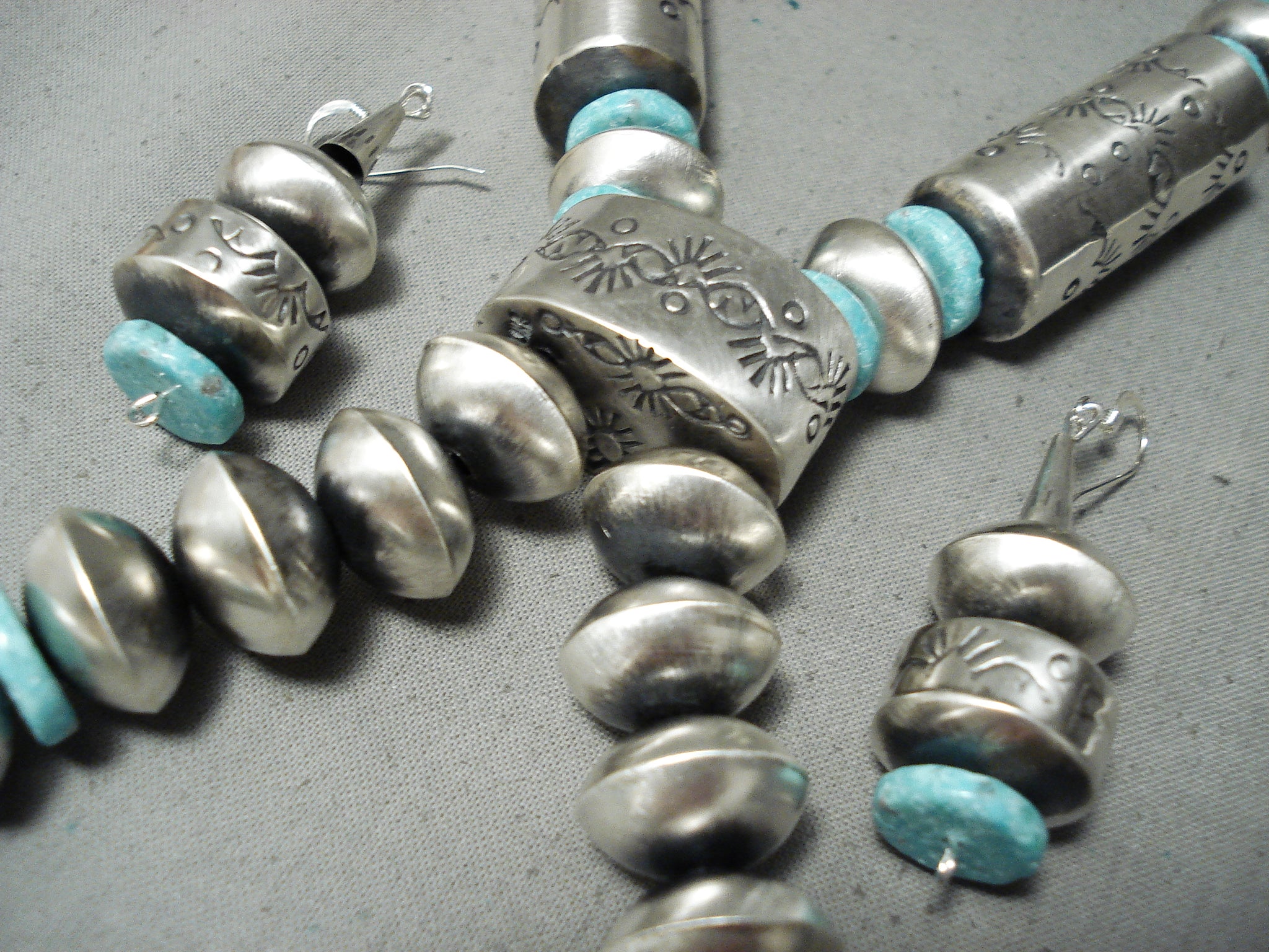 Massive Tubule Hand Tooled Native American Navajo Turquoise Sterling Silver Necklace Earrings
