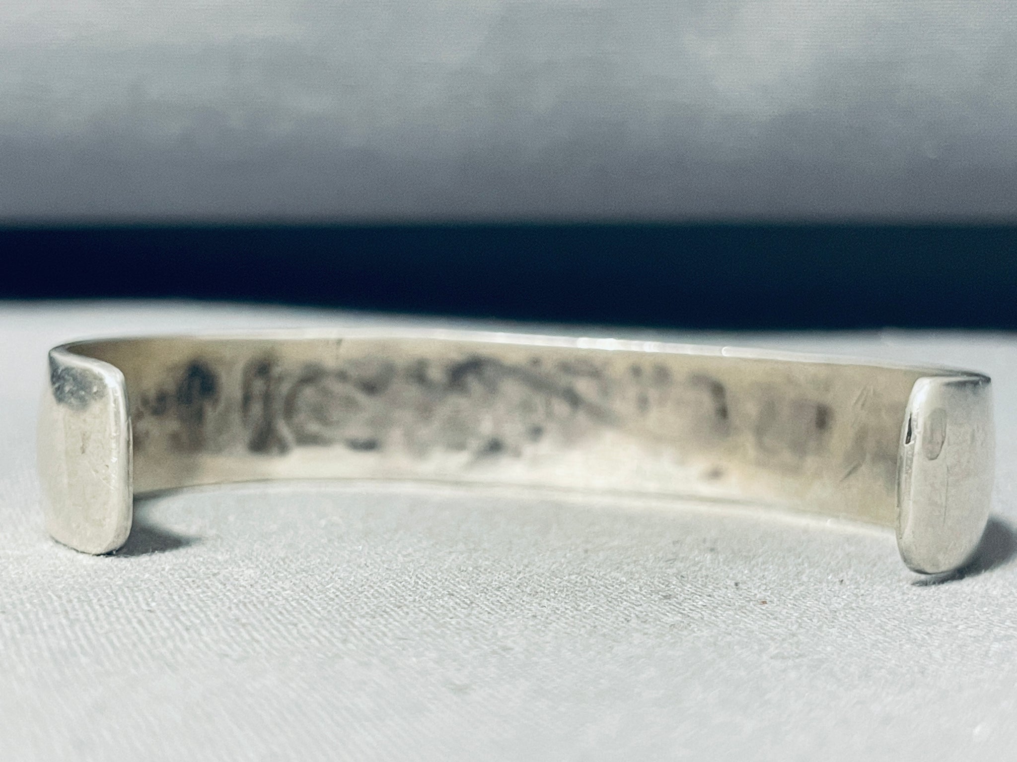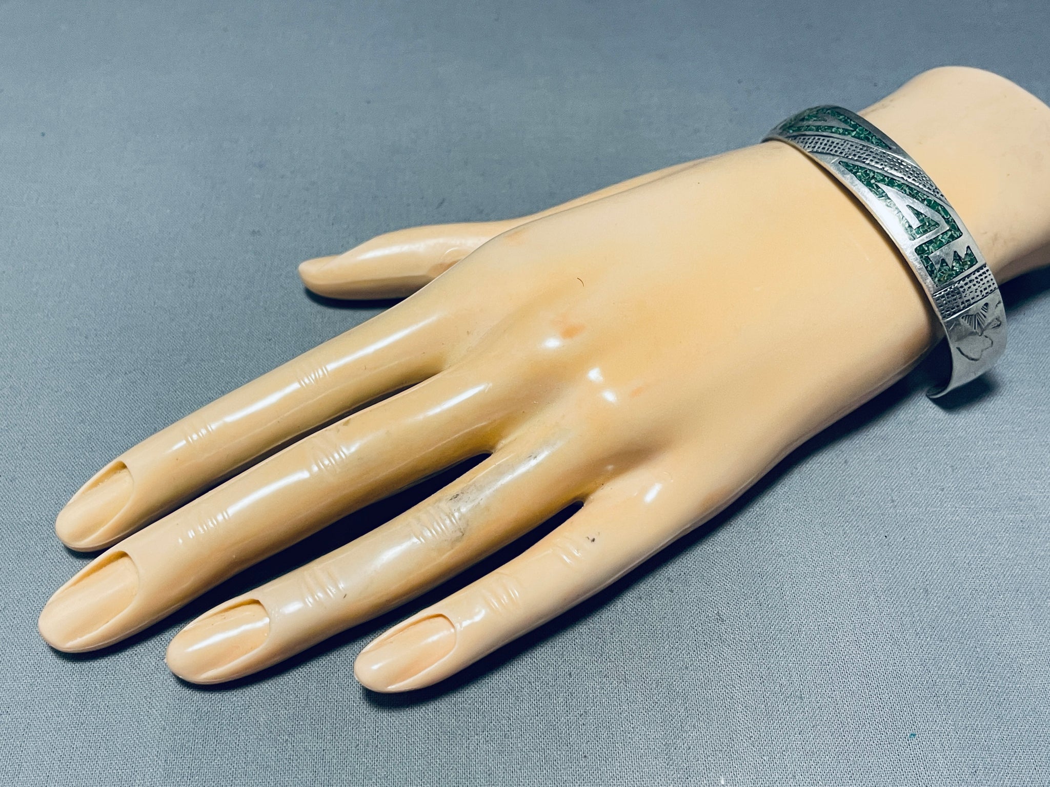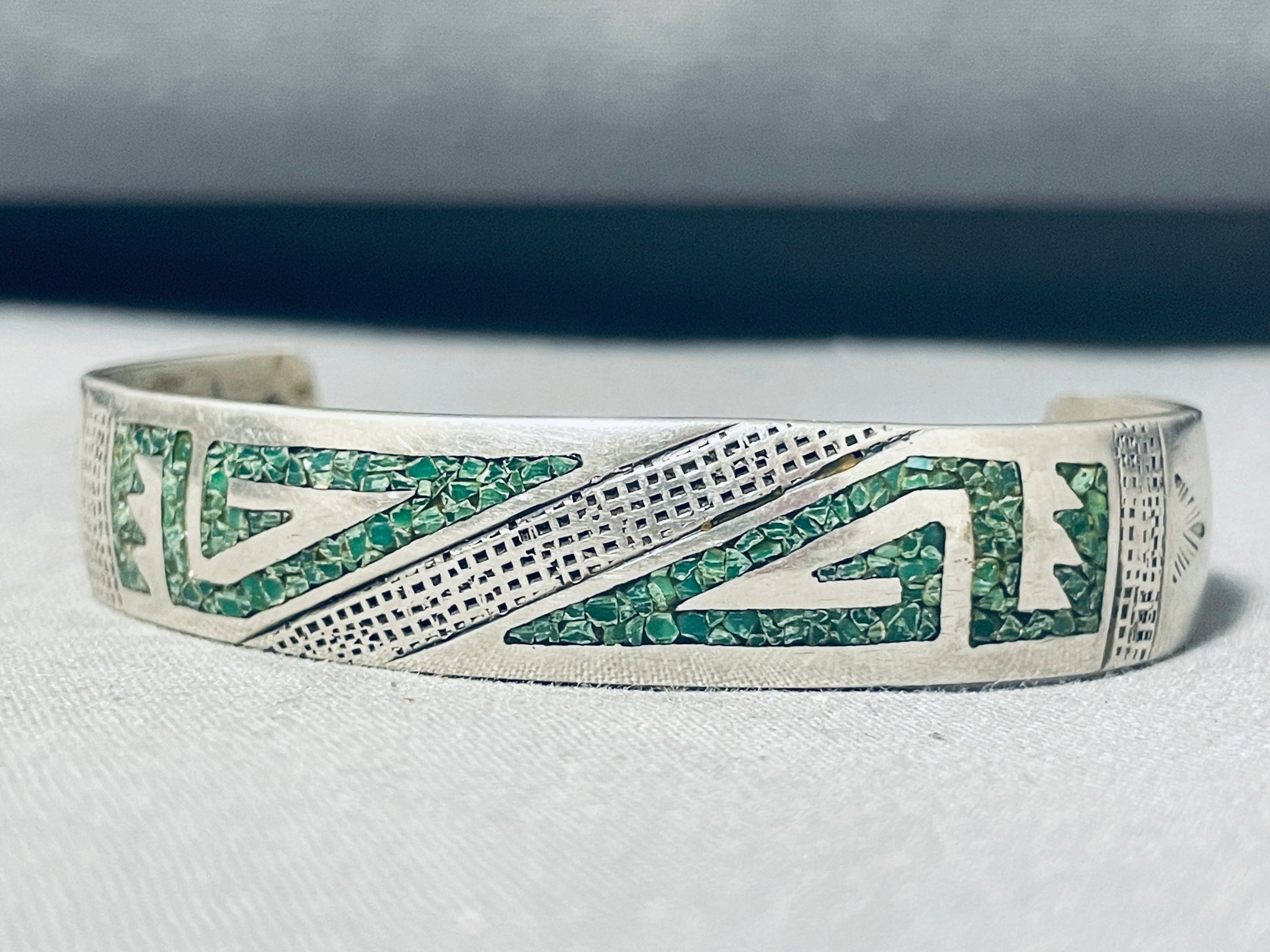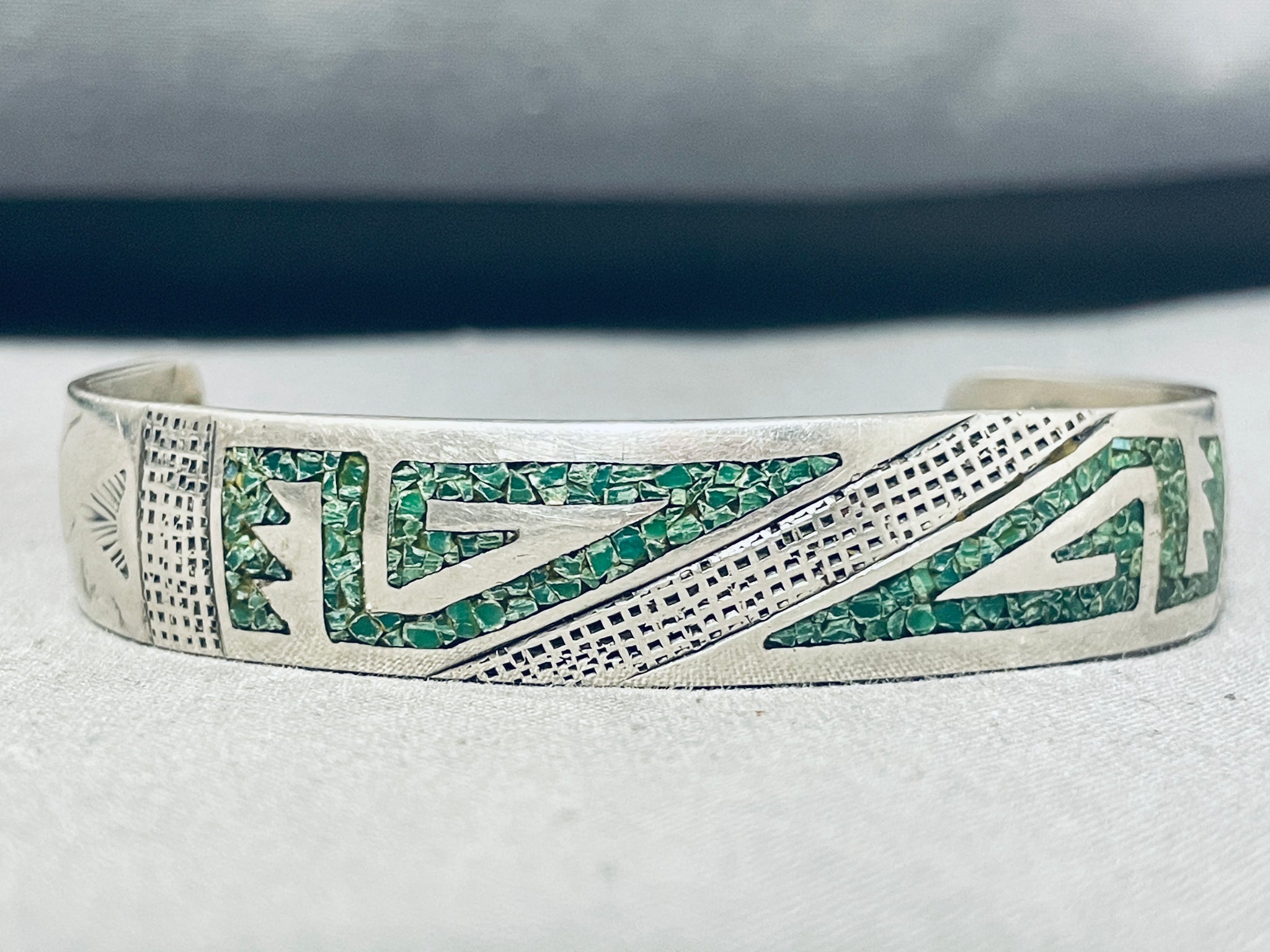 This is an impressive vintage Navajo silver bracelet featuring turquoise chip inlay rug designs and handstamped silver diagonals across the handcarved, convex, solid silver cuff! Truly Hypnotic! The width of the bracelet measures around 1/2". Signed by Navajo artist, S.B. Sterling silver. Cir Mid Century +. The inside end to end measures around 4-7/8" with an additional 1-7/8" gap. Sturdy 20 grams.