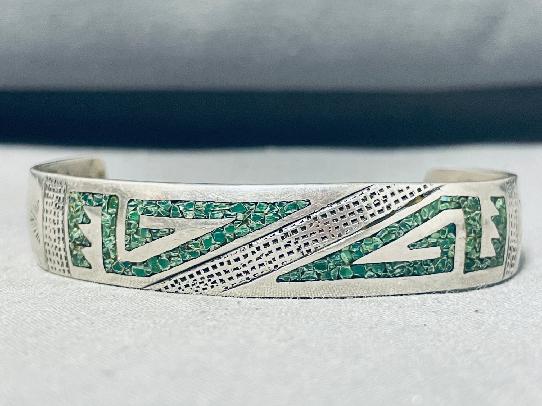 Mesmerizing Vintage Native American Navajo Turquoise Chip Inlay Sterling Silver Bracelet
