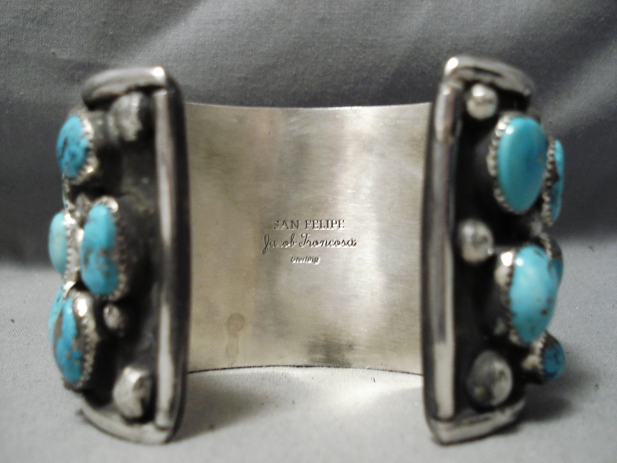 This is a tremendous Native American huge silver bracelet. This remarkable piece contains a large hand carved silver buffalo with surrounding large chunky blue turquoise stones. The bracelet is incredibly heavy and thick. The stones measure around 5/8" x 3/8". The width of the bracelet measures around 2". Signed by Native American artist, Jake Troncosa . Sterling silver, marked. Cir. 1970's+. The inside end to end measures around 5-3/4" with an additional 1-1/4" gap. Sturdy 211 grams.