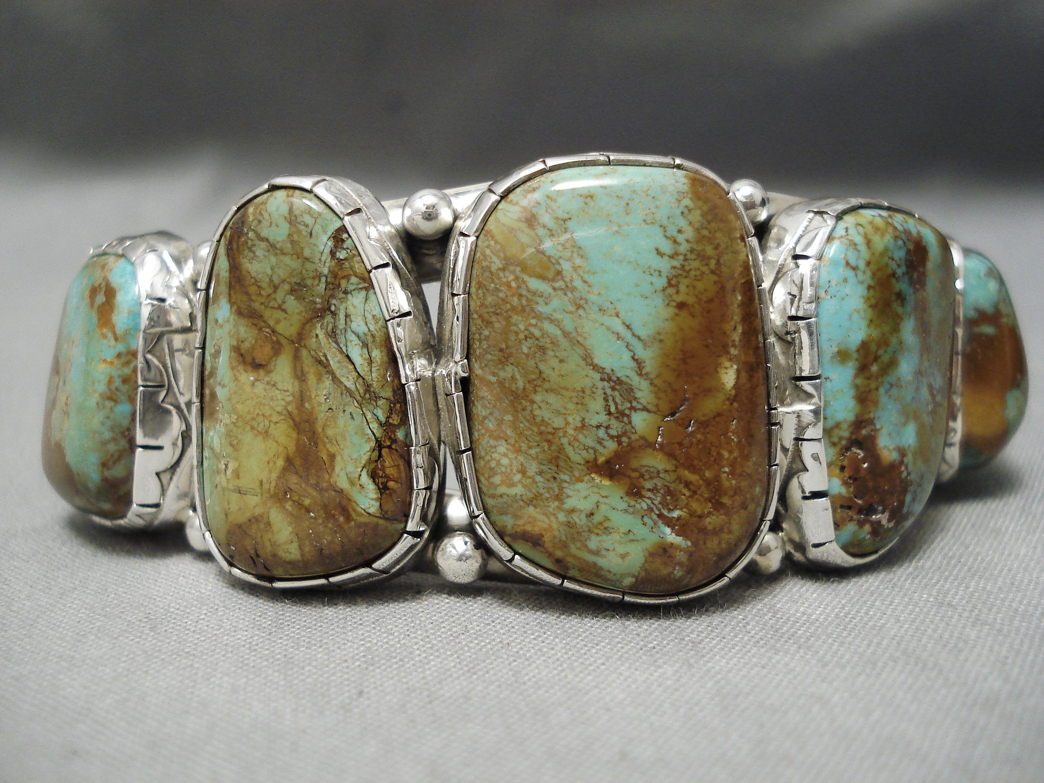 This is a tremendous vintage Navajo five stone silver bracelet. This incredible piece contains five large green turquoise stones that appear to be from the old Royston turquoise mine. Situated around the stones are wonderful silver raindrops. This bracelet contains a stunning double silver shank cuff. The center stone measures around 1" x 3/4". The width of the bracelet measures around 1". Signed by Navajo artist, B. Sterling silver, marked. The inside end to end measures around 5-3/4" with an additional 1" gap. Sturdy 62 grams.