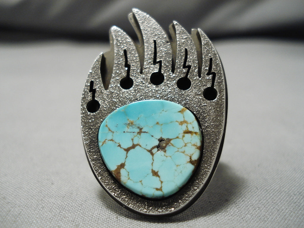 This is a museum quality Navajo single stone silver ring. This ring is absolutely phenomenal as the face is hand carved into a remarkable bear paw. Located in the paw is a wonderful turquoise stone with amazing spiderweb matrix. The stone appears to be from the amazing Number 8 turquoise mine. This ring is extremely heavy and thick with marvelous zig zag patterns that go all the way around the wide silver shank. Check out the incredible lightning bolt patterns that rest on each finger. The center stone measures around 5/8" x 5/8". The ring face measures around 1-5/8" x 1-1/8". Signed by Navajo artist, Aaron John . The ring size is around 12. Sterling silver, marked. Sturdy 36 grams.
