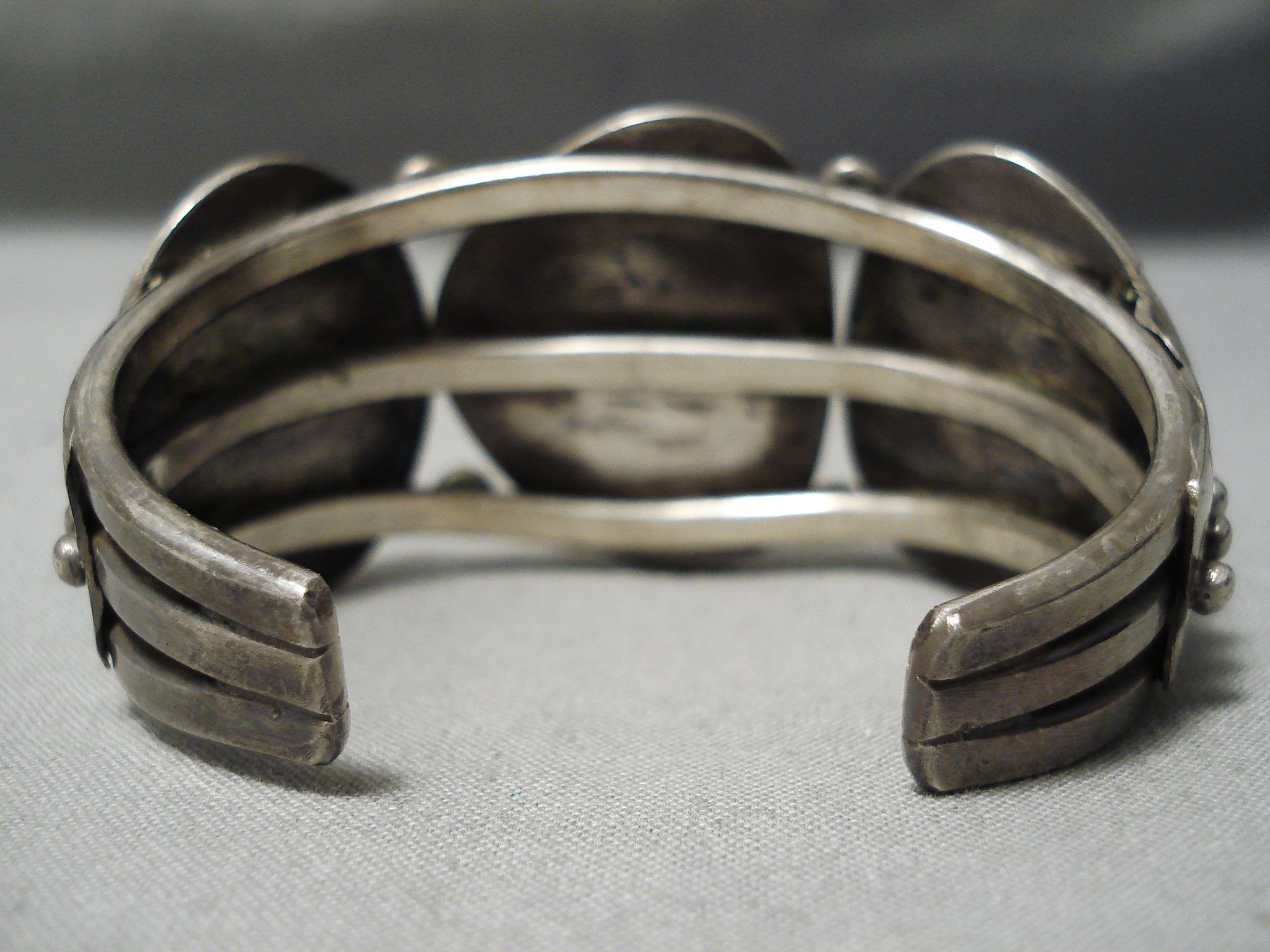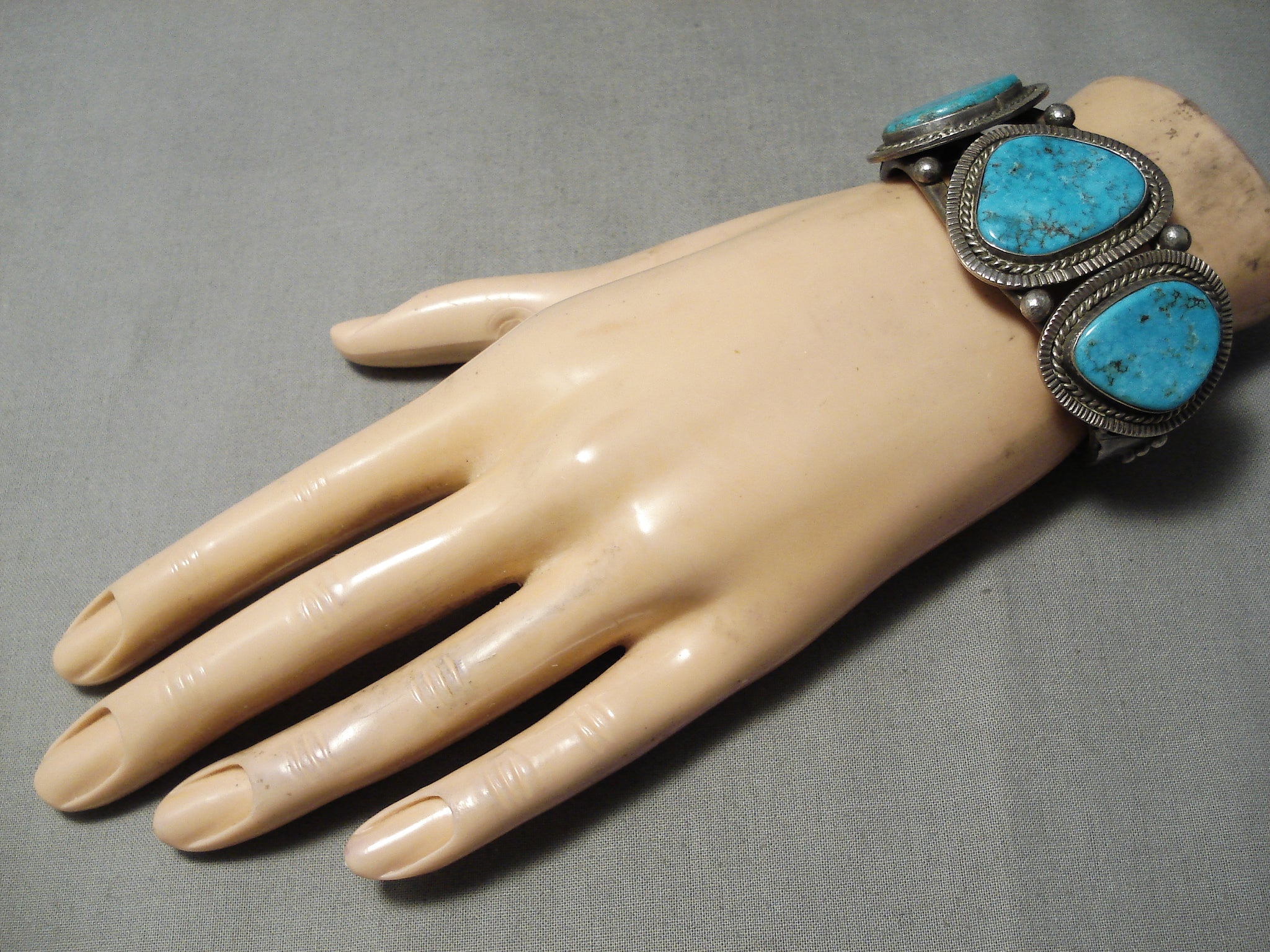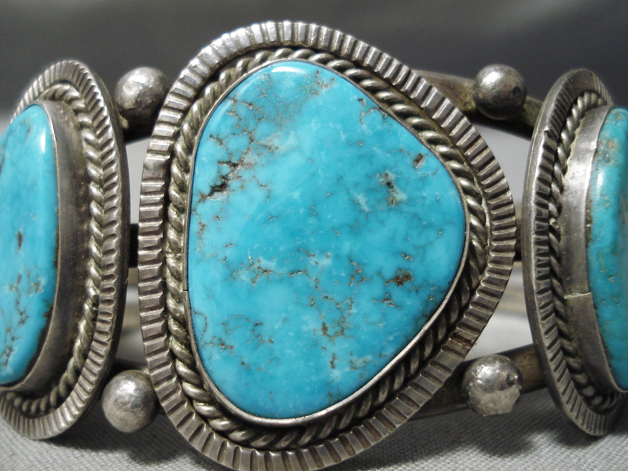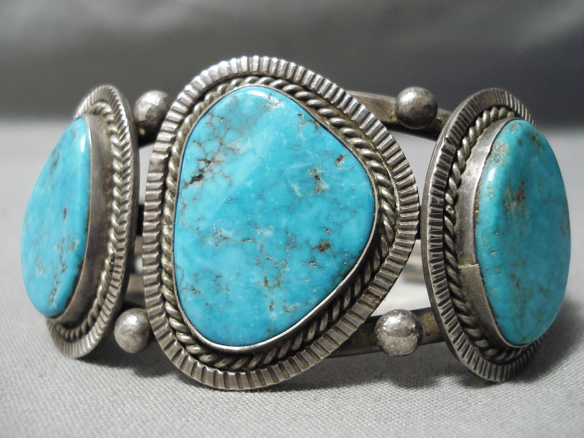 This is an impressive vintage Navajo three stone silver bracelet. This piece contains three amazing blue turquoise stones that appear to be from the very rare earlier Number 8 turquoise mine. Surrounding the stones are incredible silver ropes with channeled patterns. Resting throughout the stones are wonderful silver raindrops. Situated at the ends of the heavy and thick triple silver shank cuff are phenomenal silver fan flanks with accenting raindrops. The center stone measures around 1" x 7/8". The width of the bracelet measures around 1-1/8". Sterling silver. Cir. Mid century . The inside end to end measures around 5" with an additional 1" gap. Sturdy 66 grams.