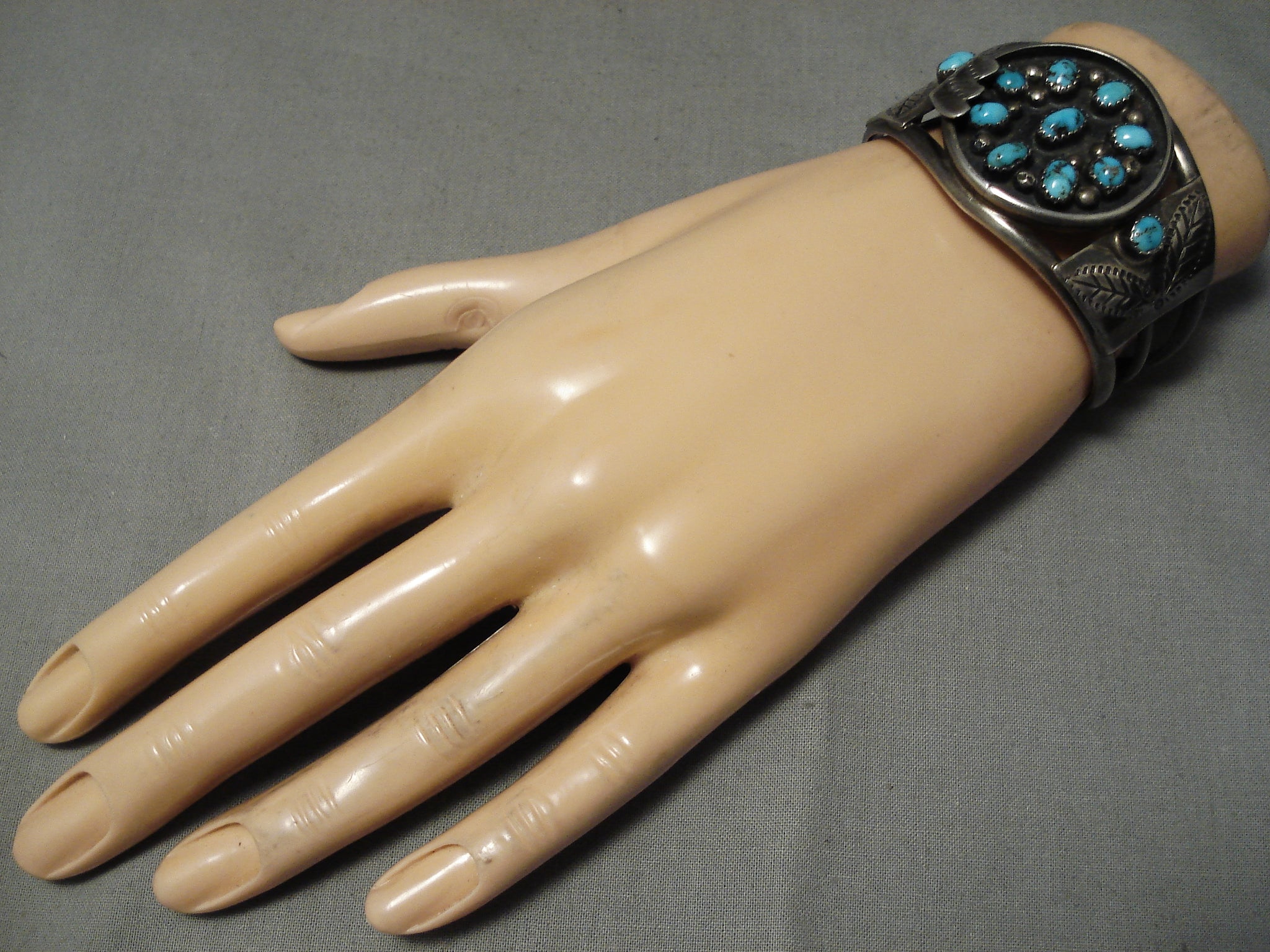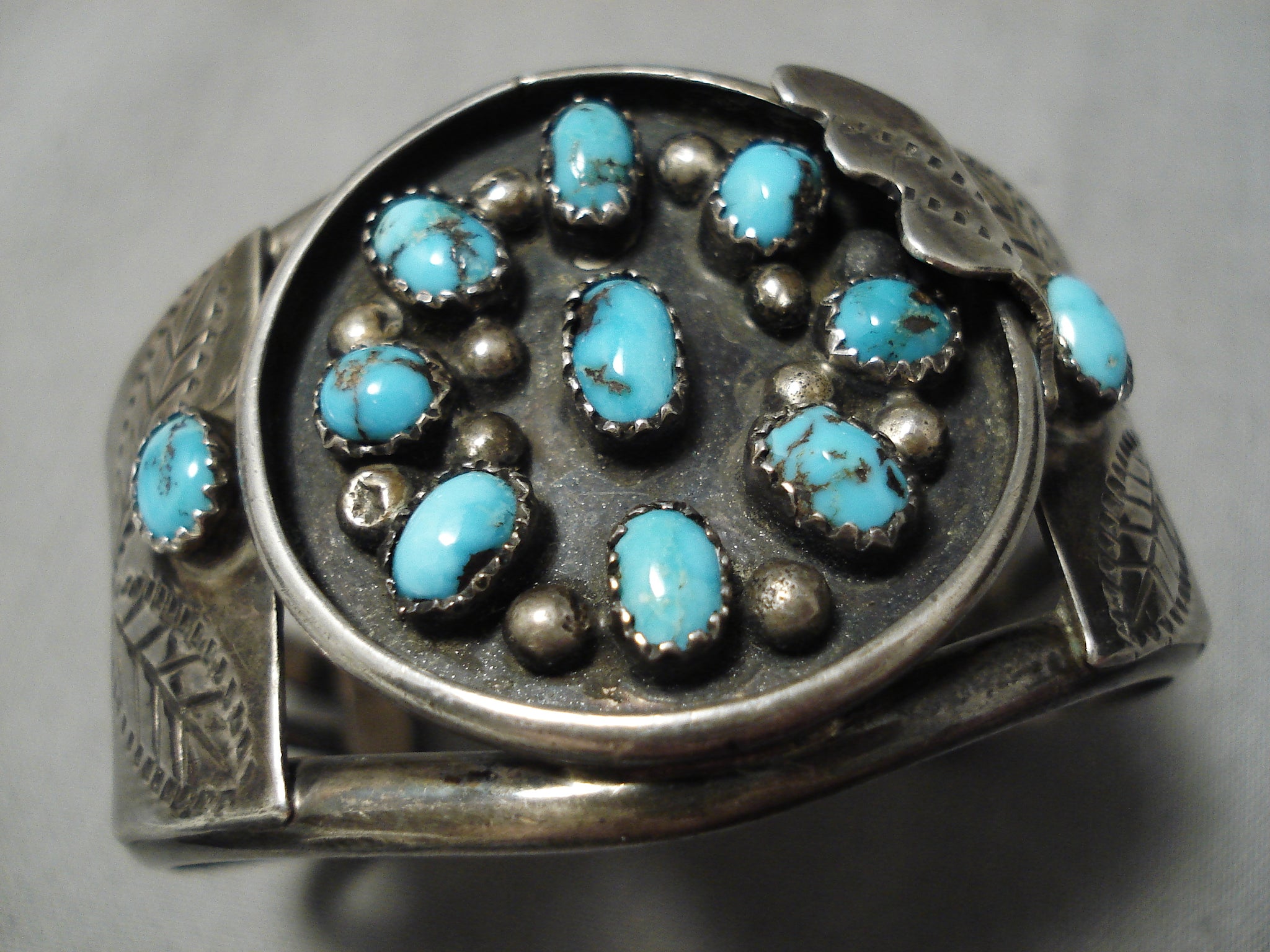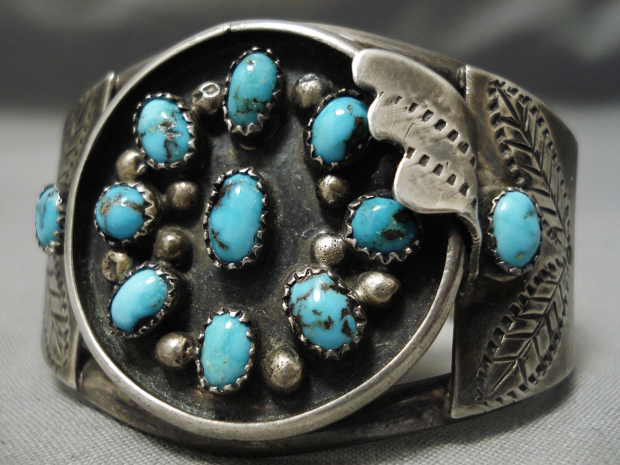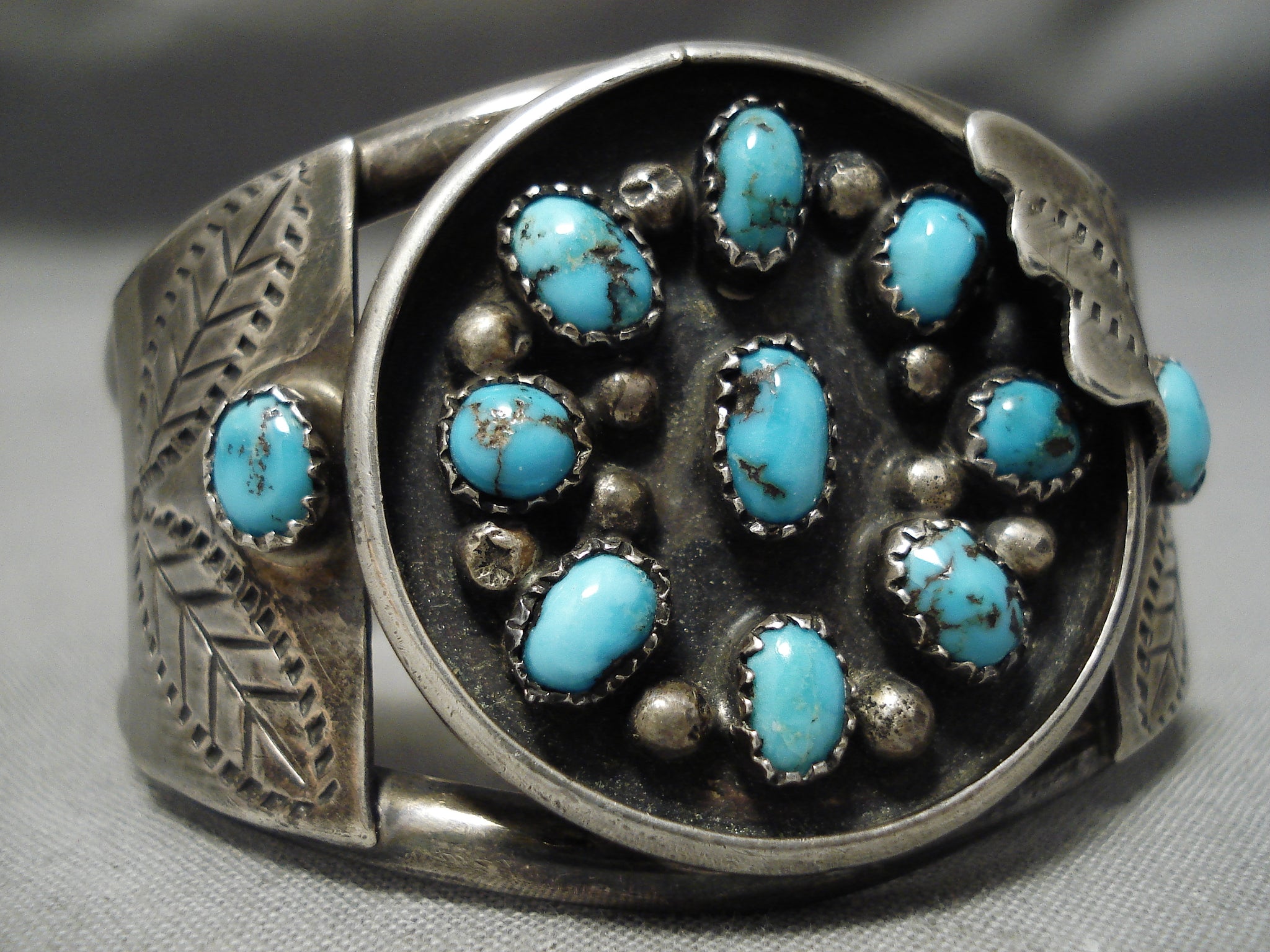 This is a superlative vintage Navajo satellite turquoise silver bracelet. This museum quality outstanding piece contains a beautiful collection of dome shaped turquoise stones. The stones appear to be either old Bisbee or old Morenci turquoise. Situated throughout the stones are stunning silver raindrops. Located at the sides of the triple silver shank cuff are incredible silver leaf stamped flanks with a single accenting silver fan. The stones measure around 1/4" x 1/8". The width of the bracelet measures around 1-1/2". Signed by Navajo artist, E. Spencer . Sterling silver. Cir. 1970's+. The inside end to end measures around 4-3/4" with an additional 1-1/4" gap. Sturdy 43 grams.