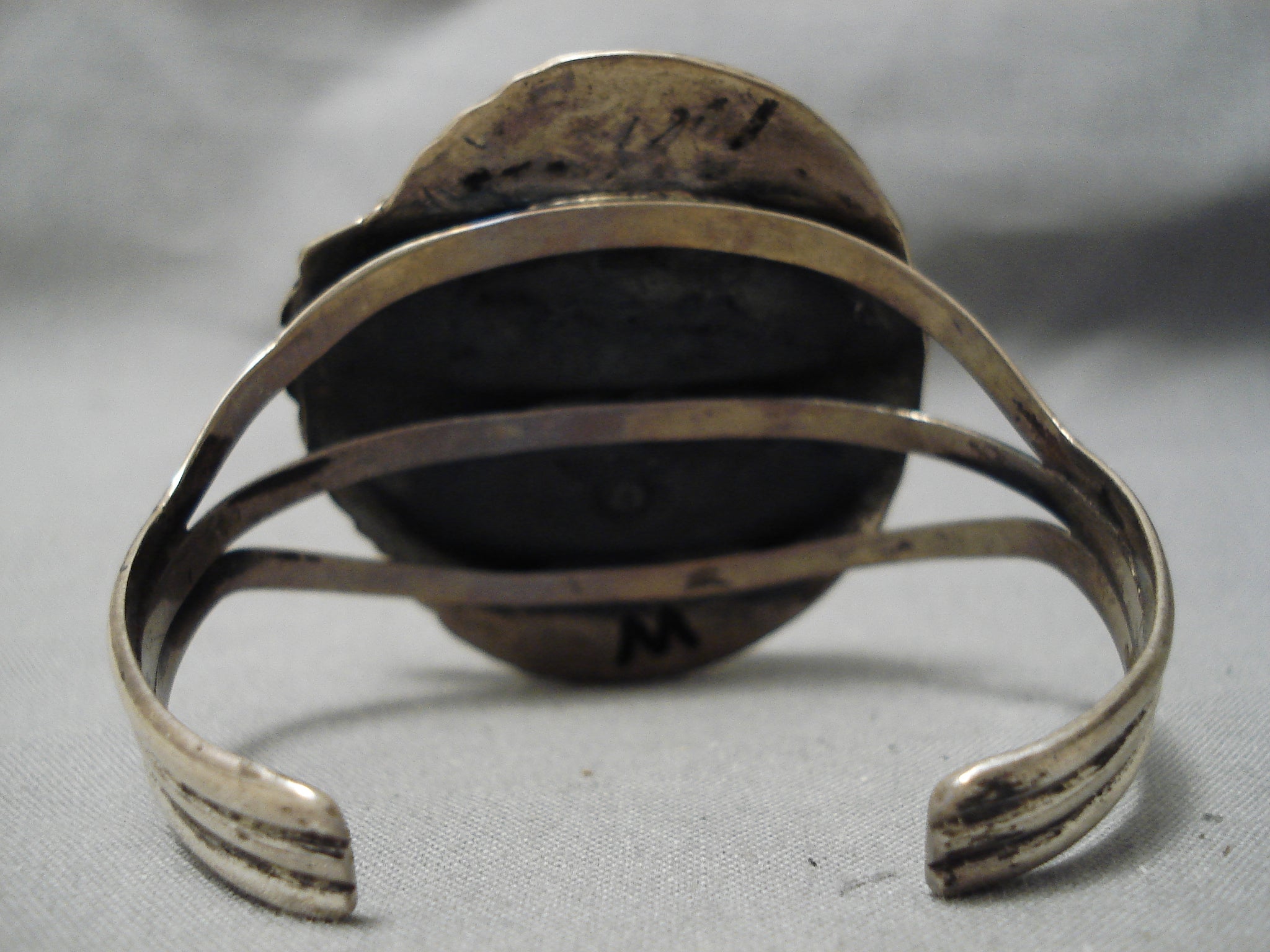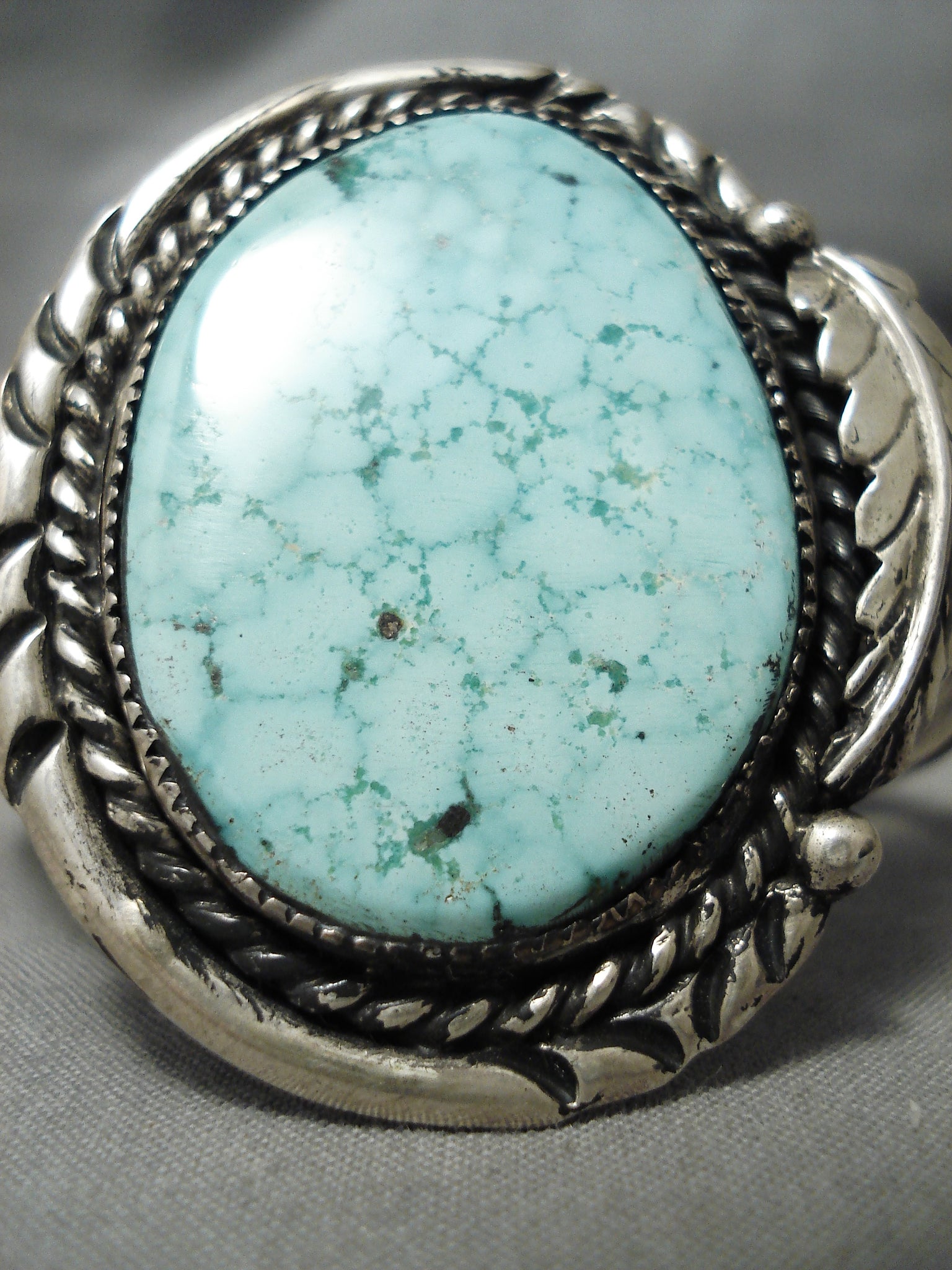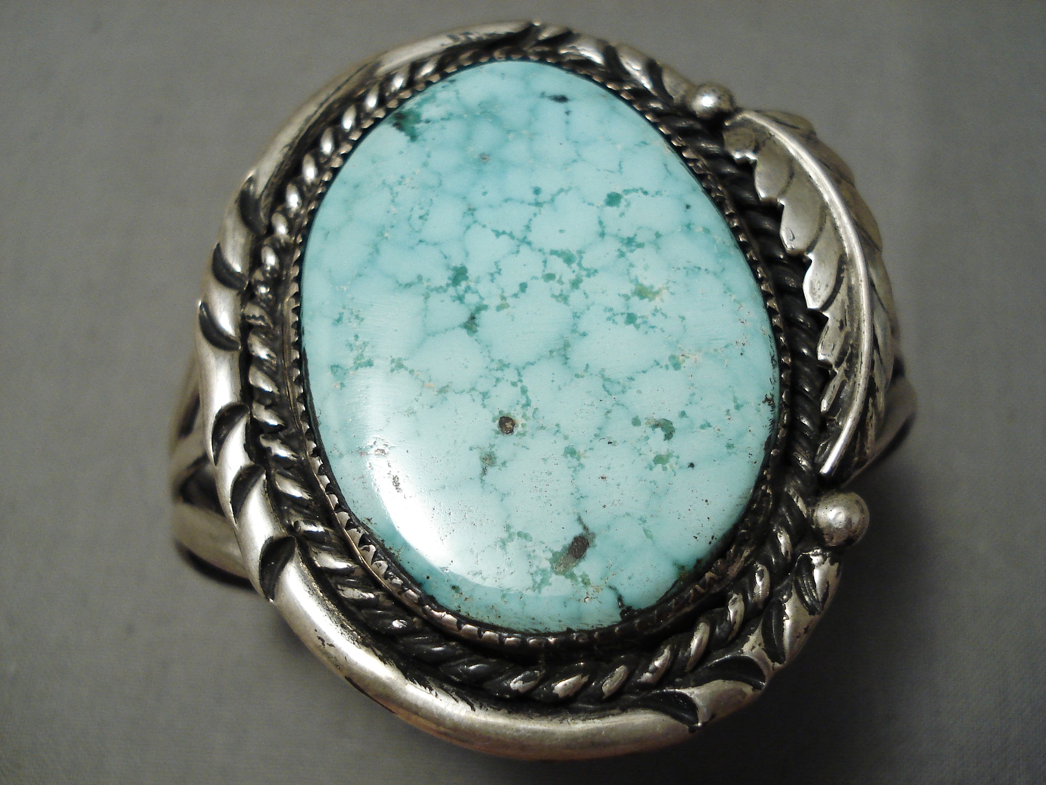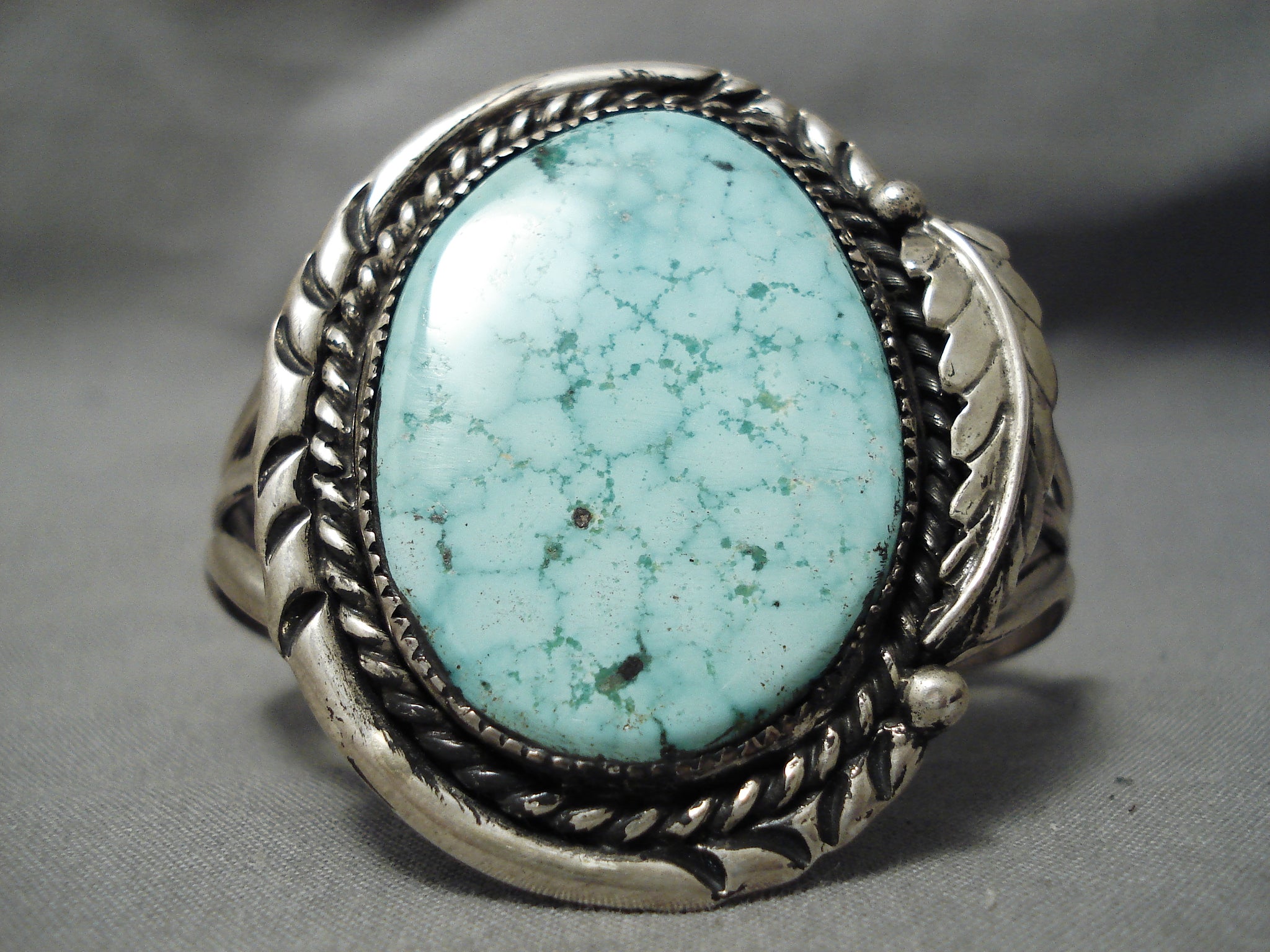 This is a magnificent vintage Navajo single stone silver bracelet. This piece contains a large dome shaped turquoise stone that appears to be from the old Carico Lake turquoise mine. This bracelet is one of the finest old Carico Lake turquoise bracelets we have collected. Surrounding the stone is a thick silver rope with accenting wave works, hand carved silver leaf and raindrops. This bracelet consists of a superior triple silver shank cuff. The center stone measures around 1-1/2" x 1-1/8". The width of the bracelet measures around 1-1/4". Sterling silver, marked. Cir. 1970's+. The inside end to end measures around 5" with an additional 1" gap. Sturdy 45 grams.