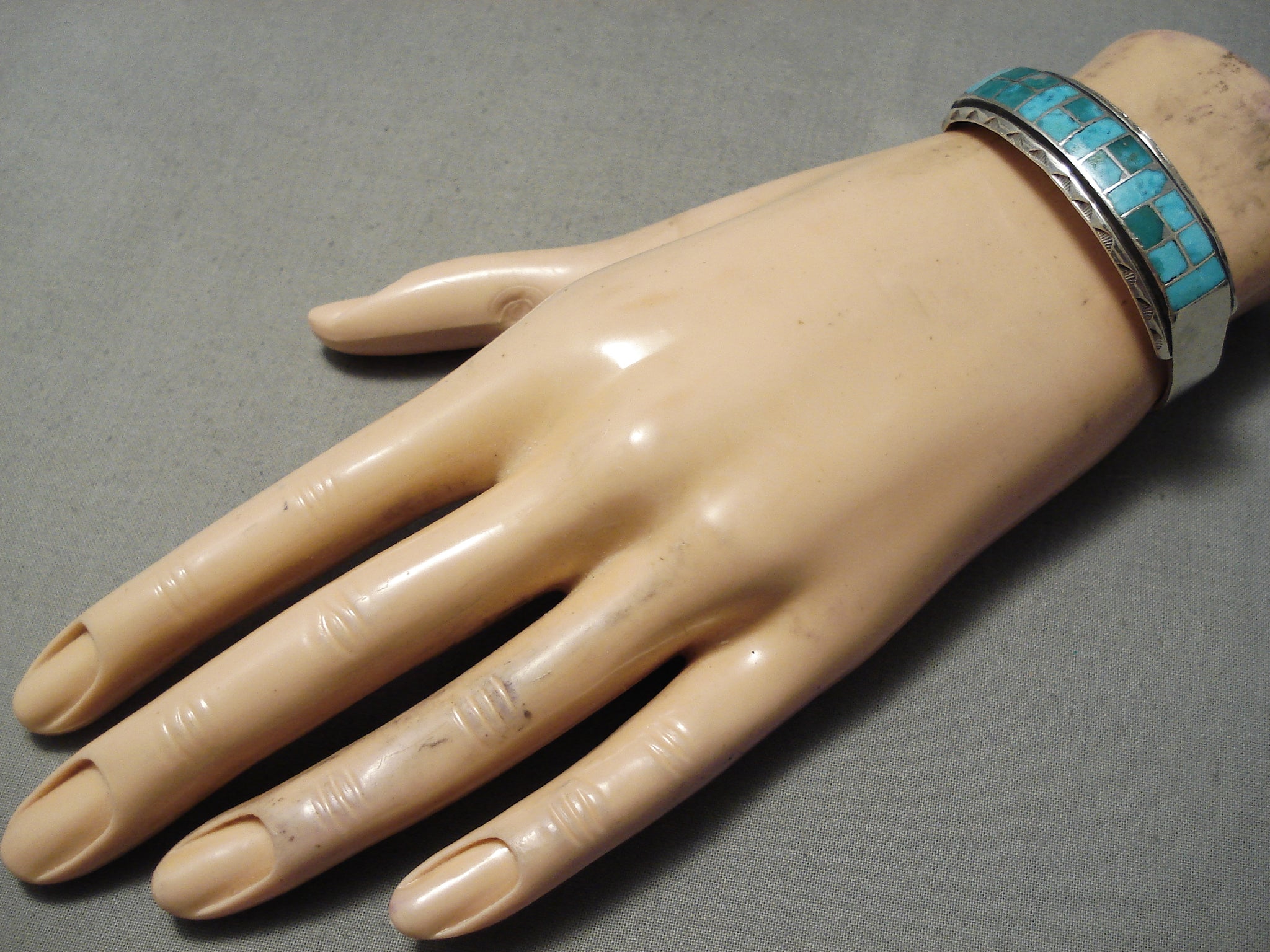 Museum Vintage Native American Navajo Carico Lake Turquoise Inlay Sterling Silver Bracelet Old