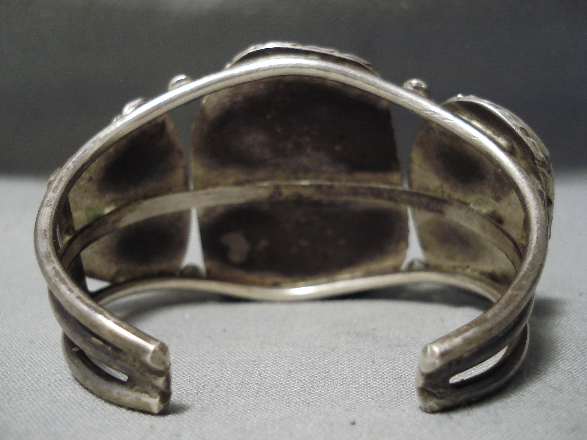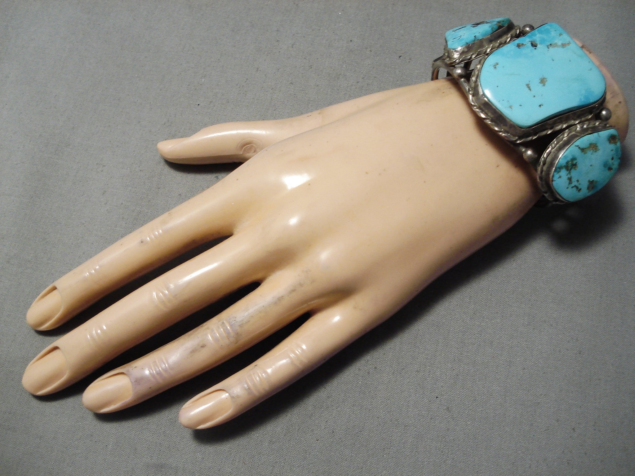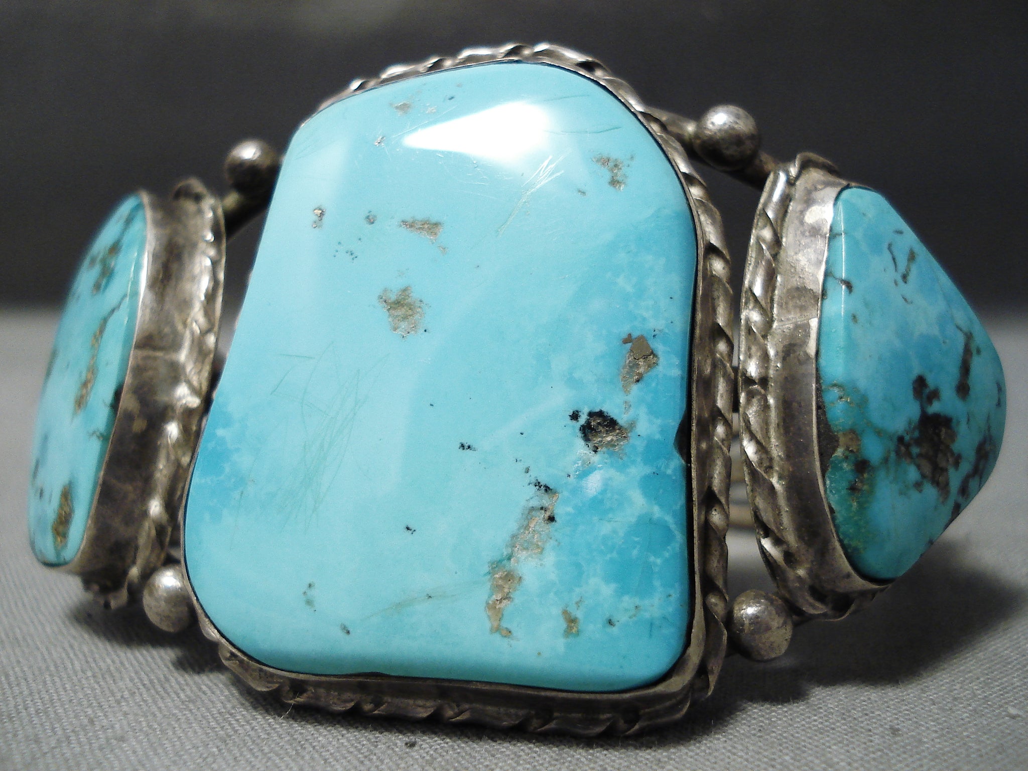 This is a magnificent vintage Navajo three stone silver bracelet. These are the rare old pieces that you just dont see anymore. Collectors are holding them because they know how much they're going up in value. This piece contains three huge chunky rare natural sky blue turquoise stones. Surrounding the stones are wonderful silver ropes and accenting silver raindrops. This bracelet includes a remarkable triple silver shank cuff with accenting end silver flanks with old natural patina. The center stone measures around 1-1/2" x 1-1/8". The width of the bracelet measures around 1-1/2". Sterling silver. Cir. Mid century . The inside end to end measures around 5-1/4" with an additional 1" gap. Sturdy 62 grams.