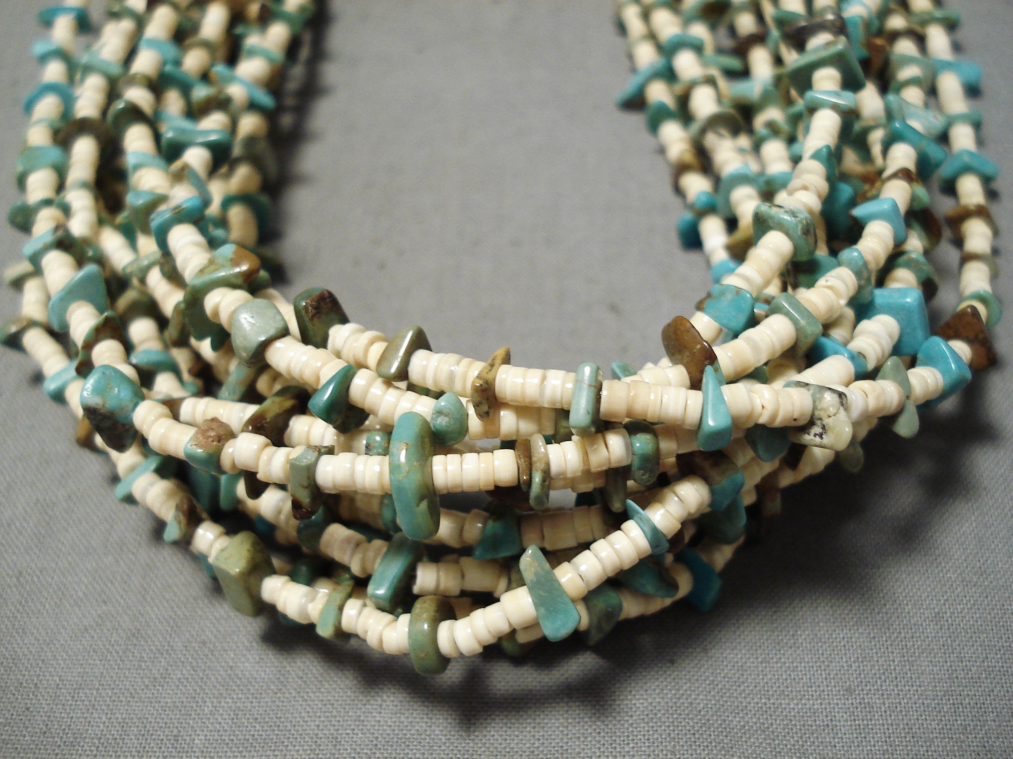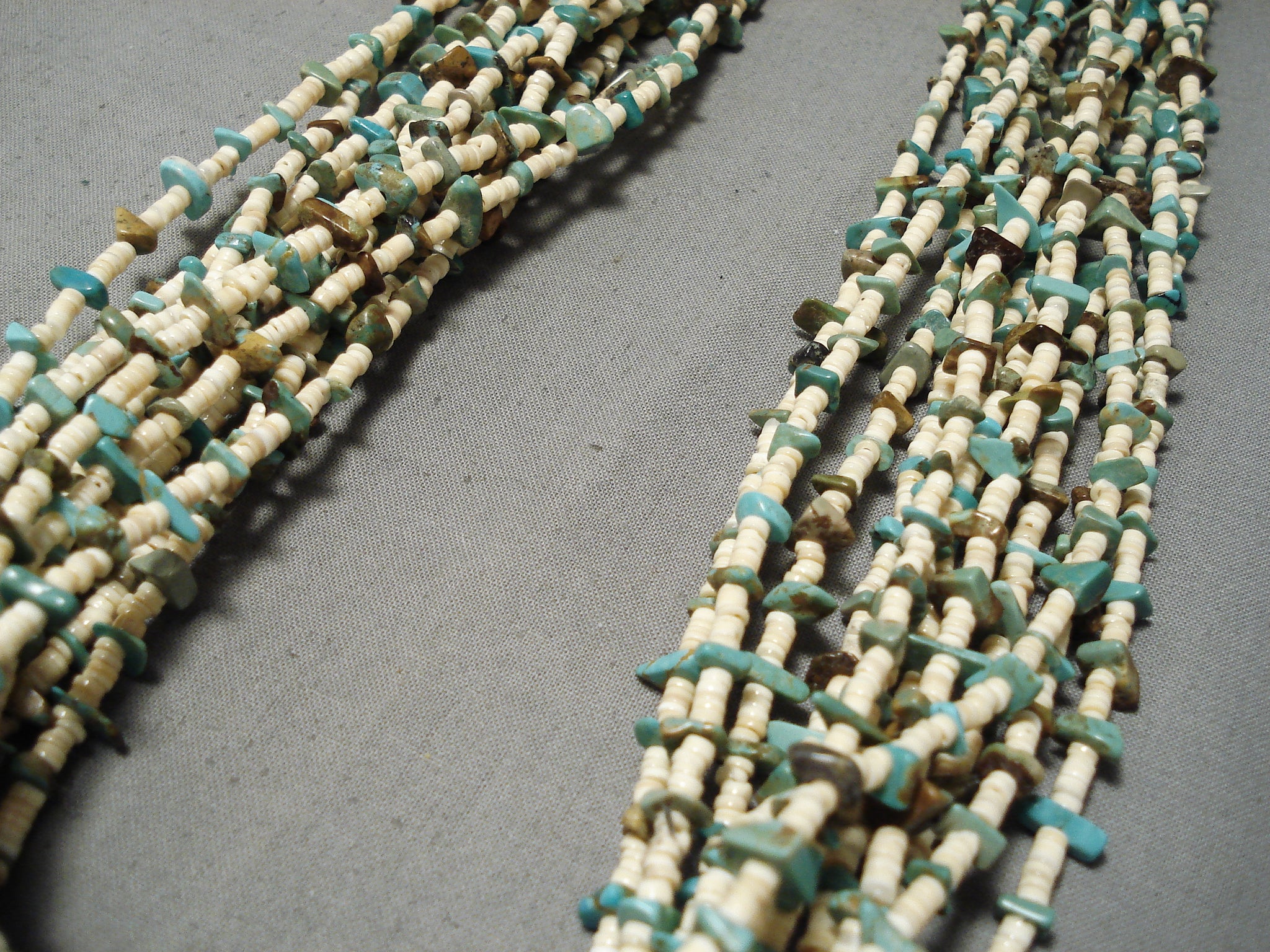 We are proud to offer this marvelous vintage Navajo necklace. This is such an exceptional lengthy necklace of 12 strands of mega amounts of fabulous Royston turquoise stones strung among beautiful tan heishi! The strands end with additional heishi as they gather at the silver cones and braided cord that can also be adjusted for some length adjustability. The largest of turquoise is about ½” x 3/16”. The length of the necklace measures around 40". Sturdy 180 grams. Cir Mid century.