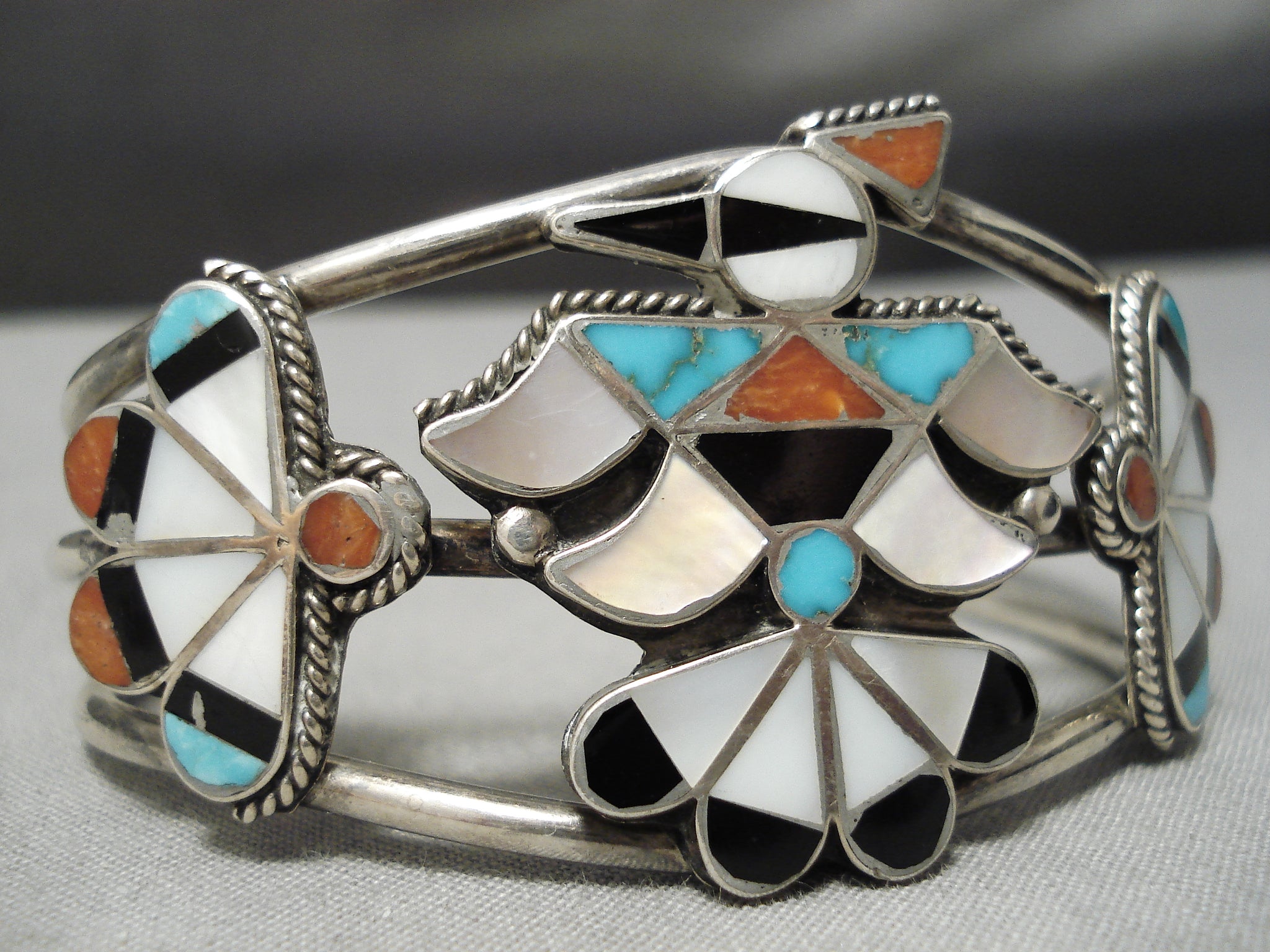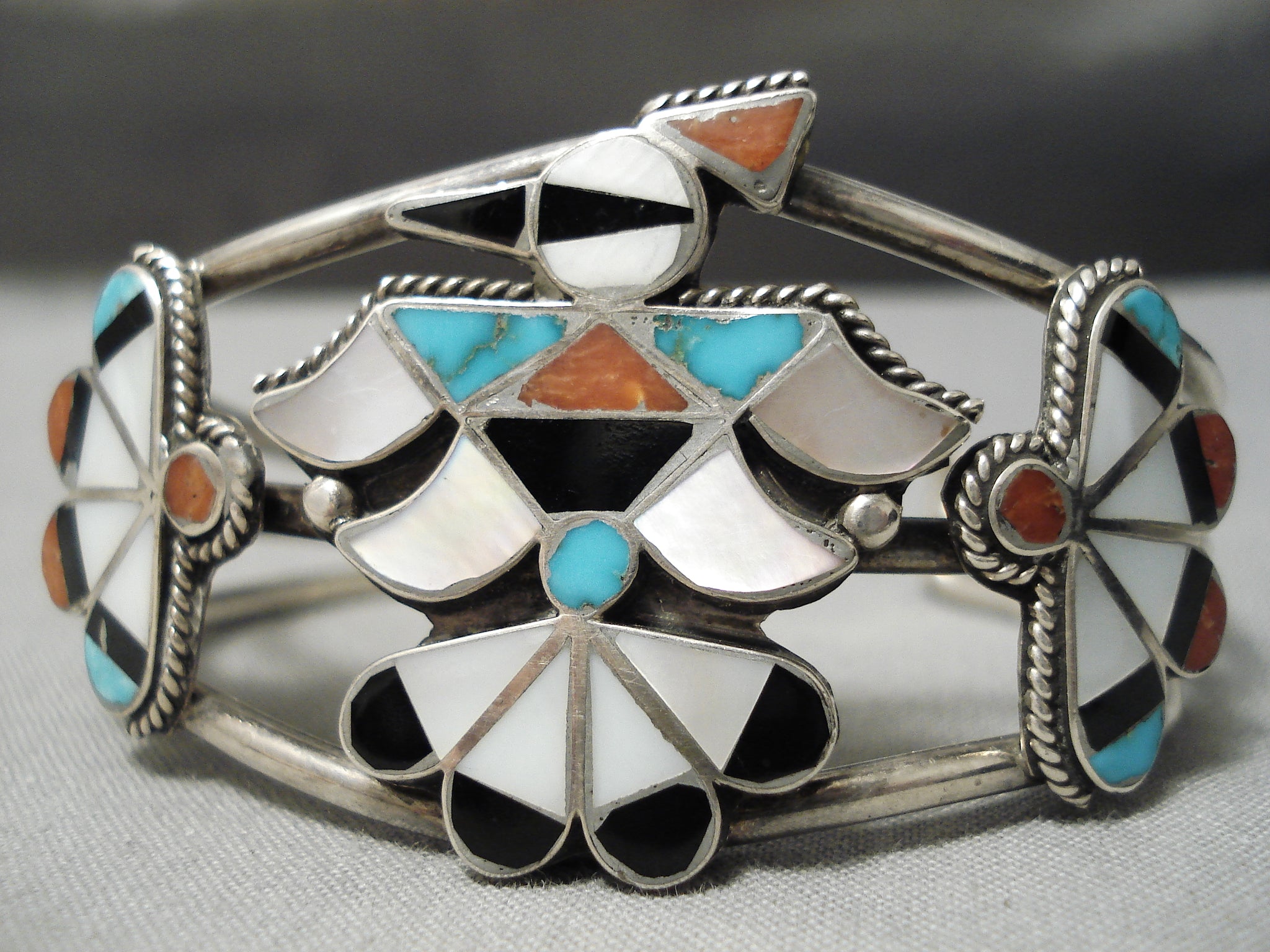 Museum Vintge Zuni Native American Navajo Turquoise Coral Sterling Silver Bird Bracelet