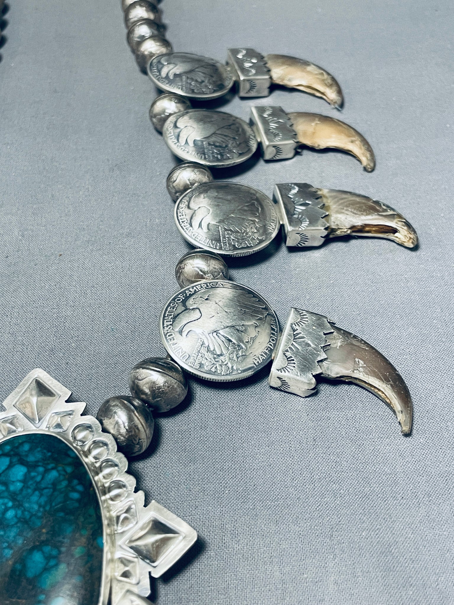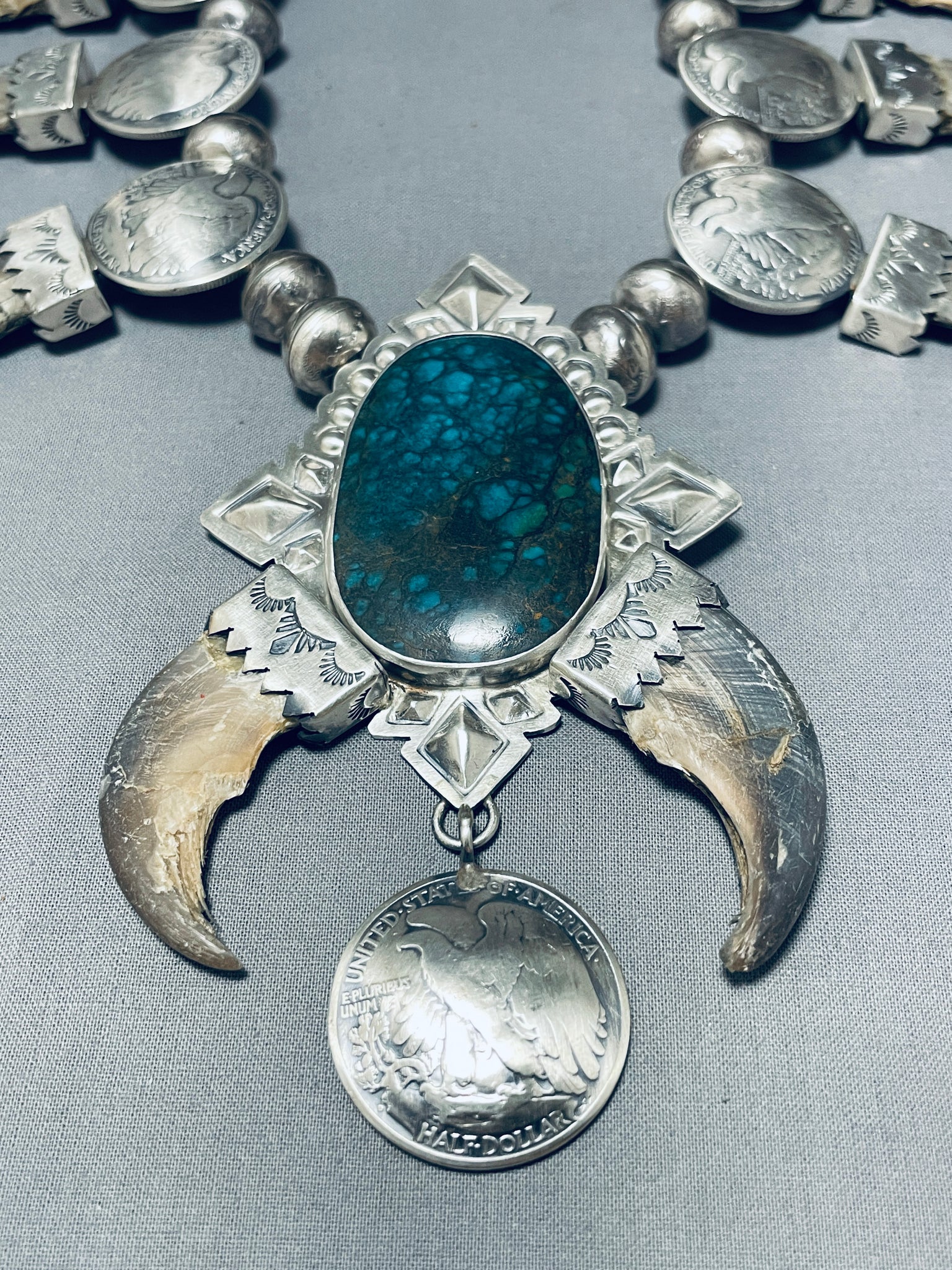 Native American 368 Gram Bear San Felipe Turquoise Sterling Silver Squash Blossom Necklace