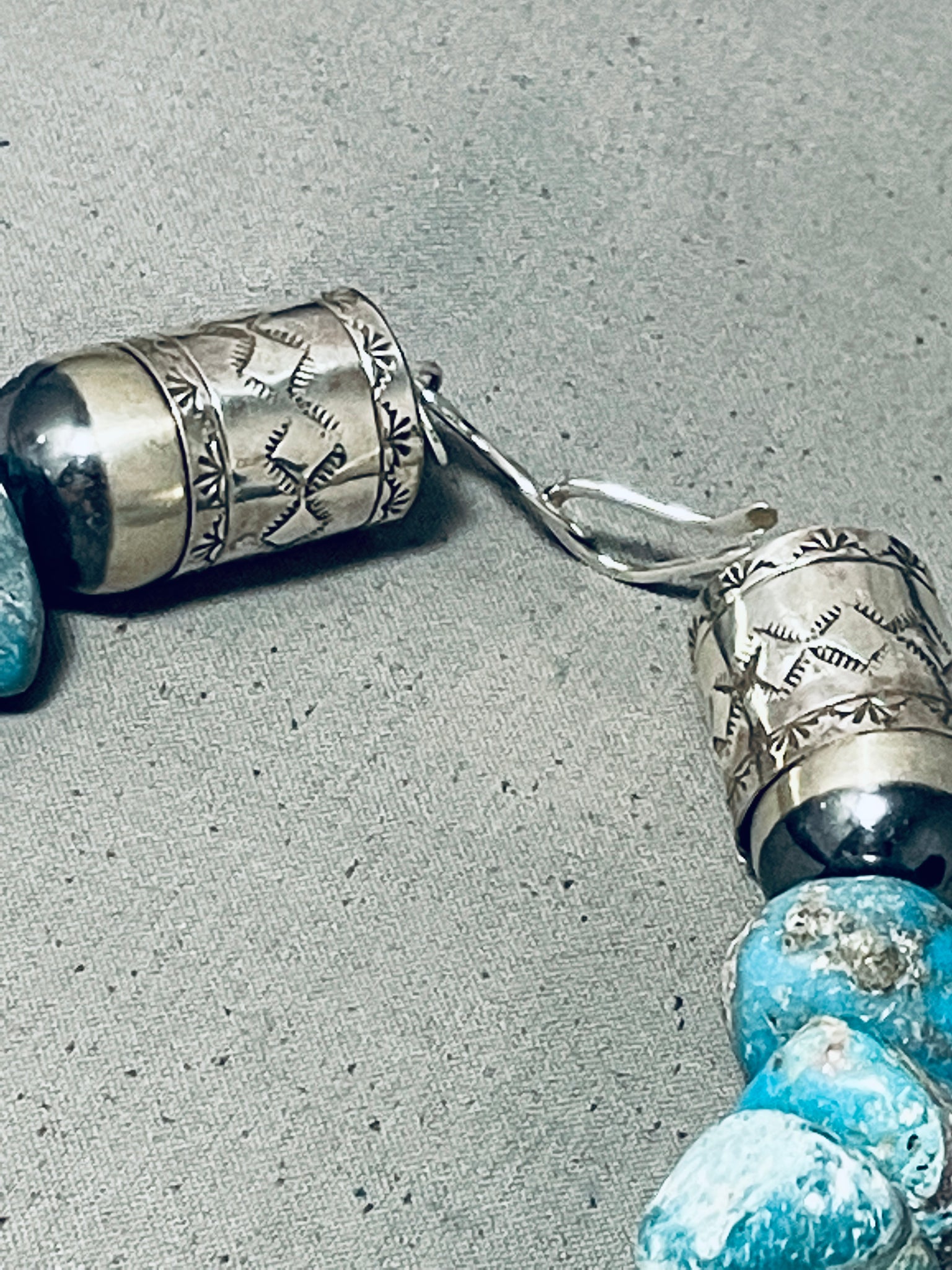 We are proud to offer this magnificent Navajo necklace having a single strand of large turquoise chunks, handcarved silver barrel pendants with silver handstampings and a handmade silver hook and eye clasp! Absolutely Stunning! The largest turquoise stone measures about 1-1/2" x 5/8". Sterling silver. The length of the necklace measures around 28". Sturdy 426 grams.