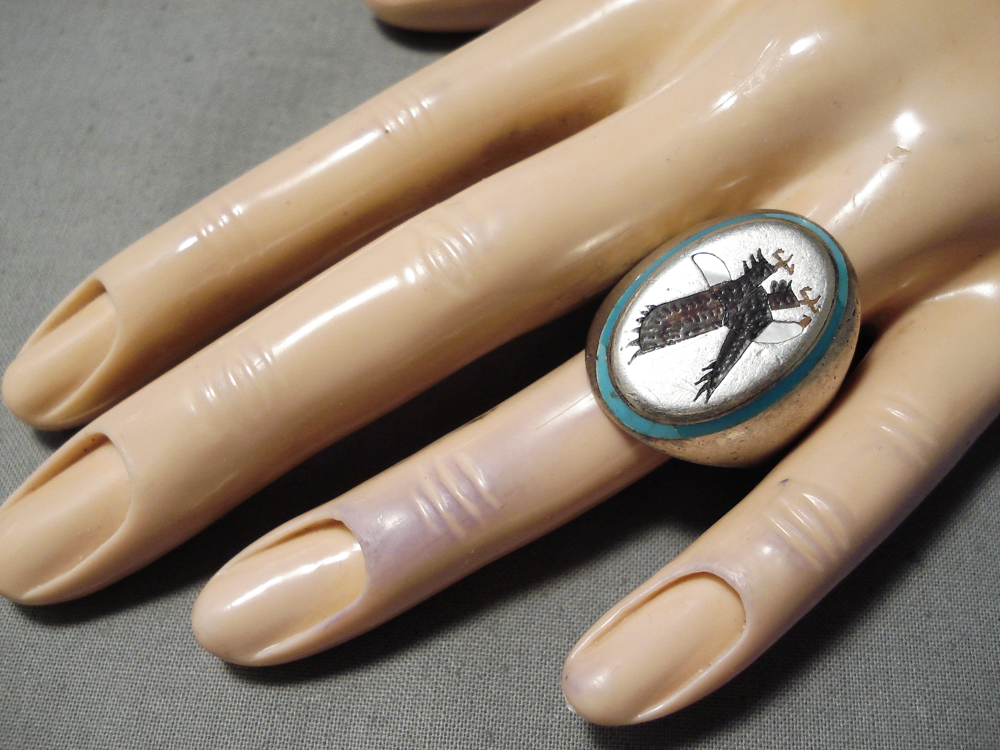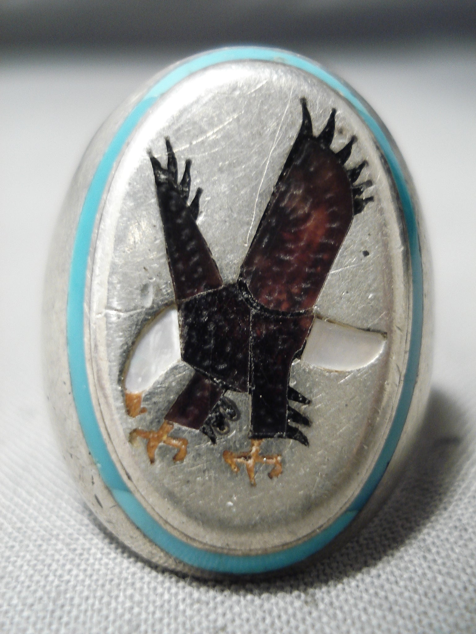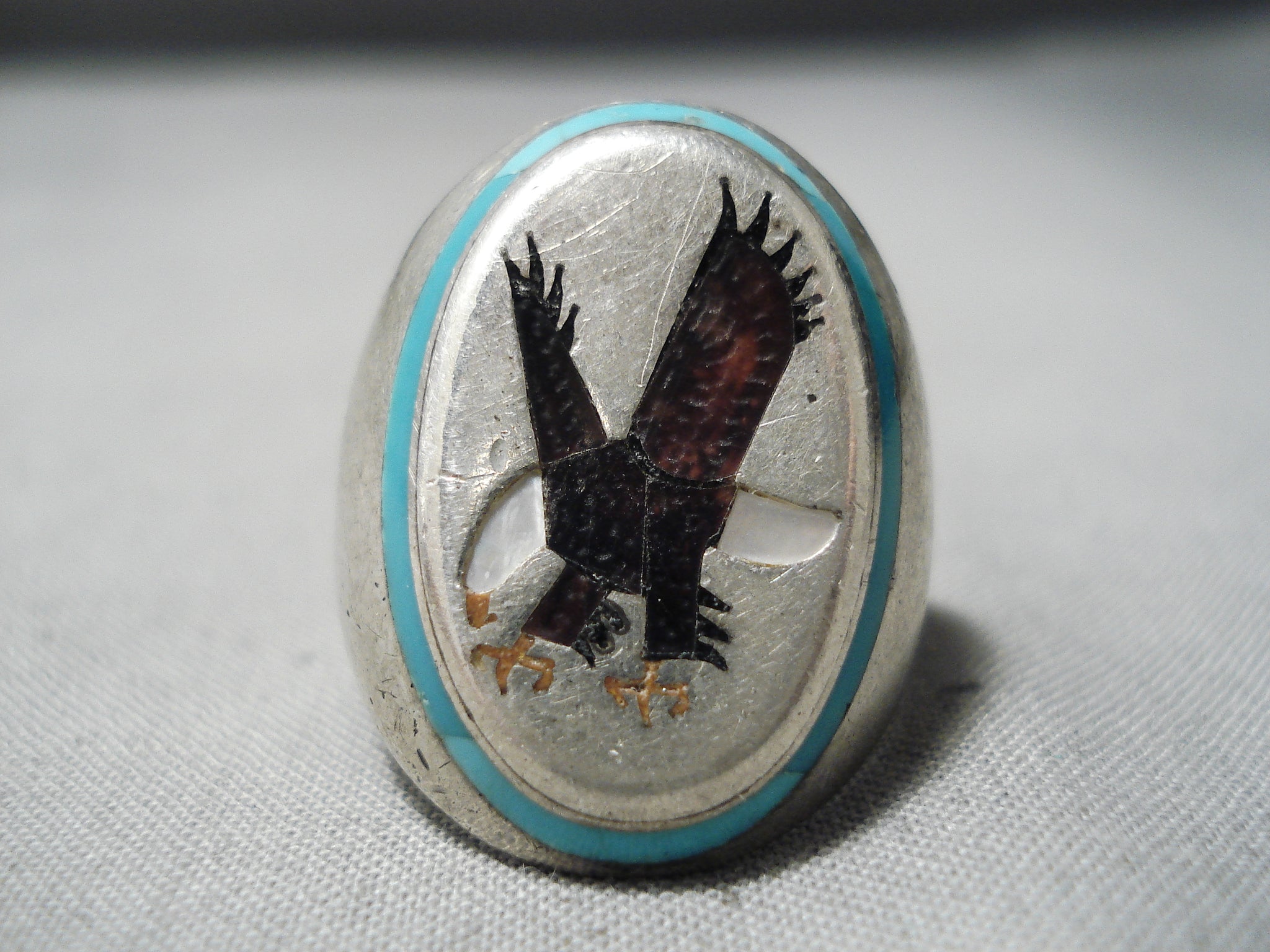 Native American Amazing Vintage Cochiti Inlay Turquoise Eagle Sterling Silver Ring Old