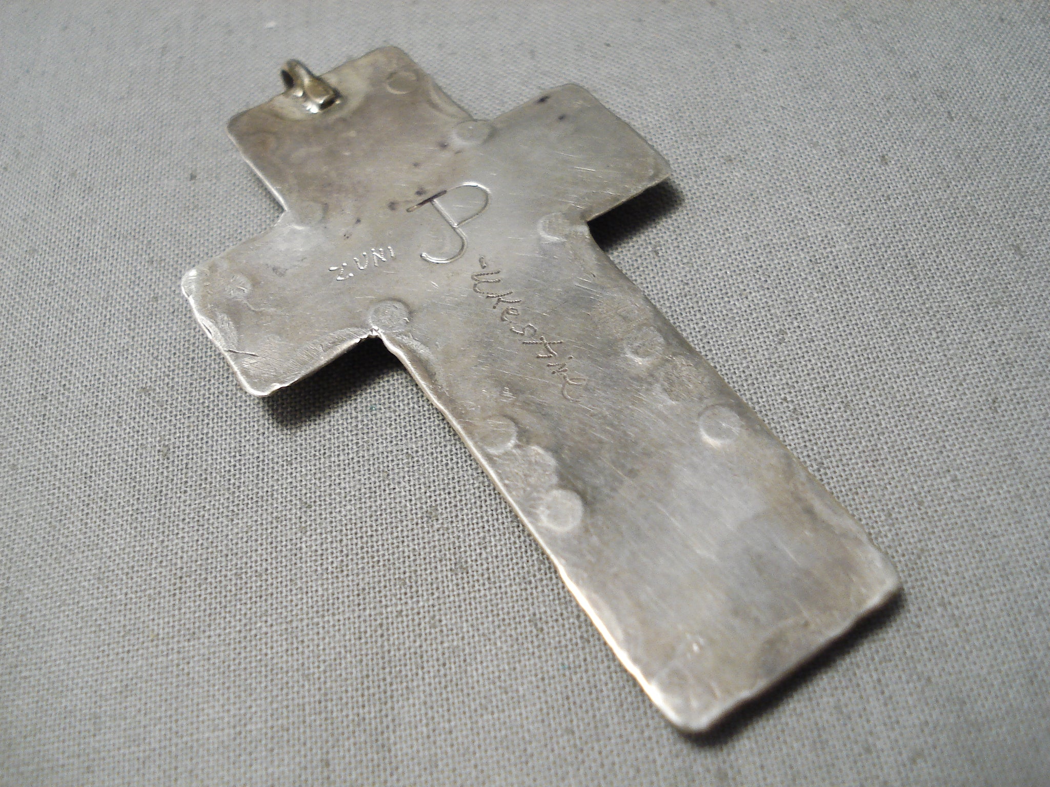 This is a fascinating vintage Zuni silver pendant. Don't you just love the arrangement of these 18 turquoise rounds as they're surrounded with silver rope and beads, before coming to life against the ornately handstamped silver cross backdrop?! It has a 1/8" bail opening. Sterling silver. Signed by Zuni artist, J. Ukestine. The pendant measures around 2-3/4" x 1-1/2". Sturdy 10 grams.