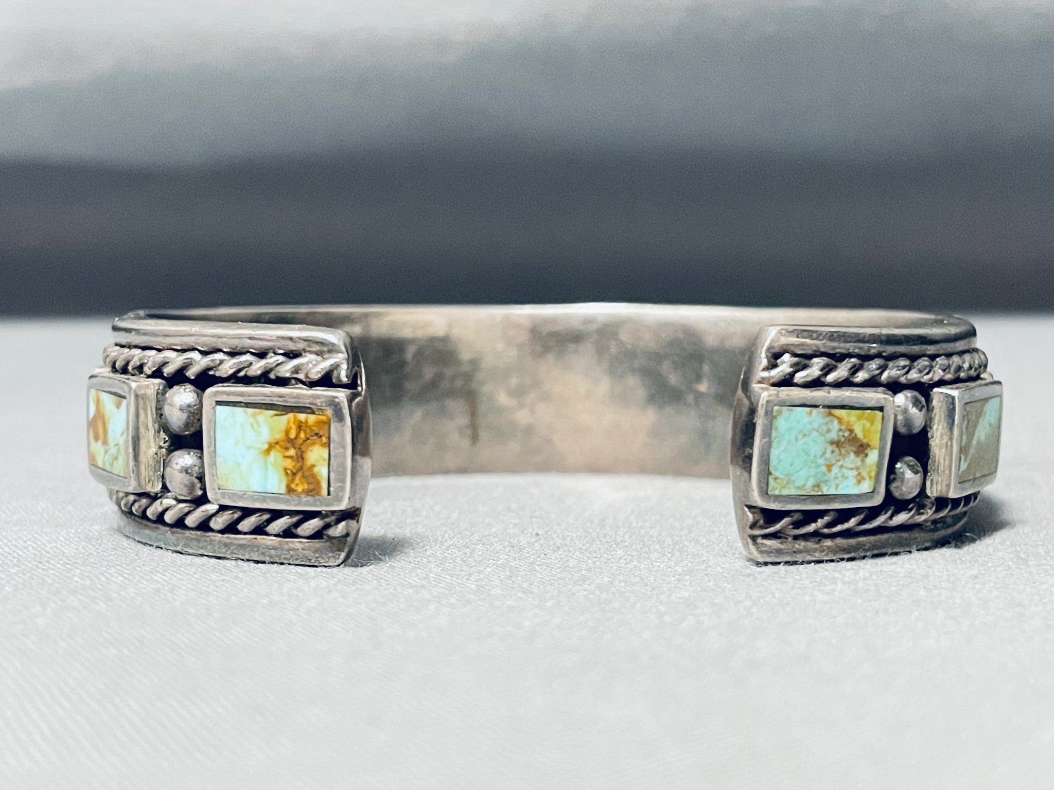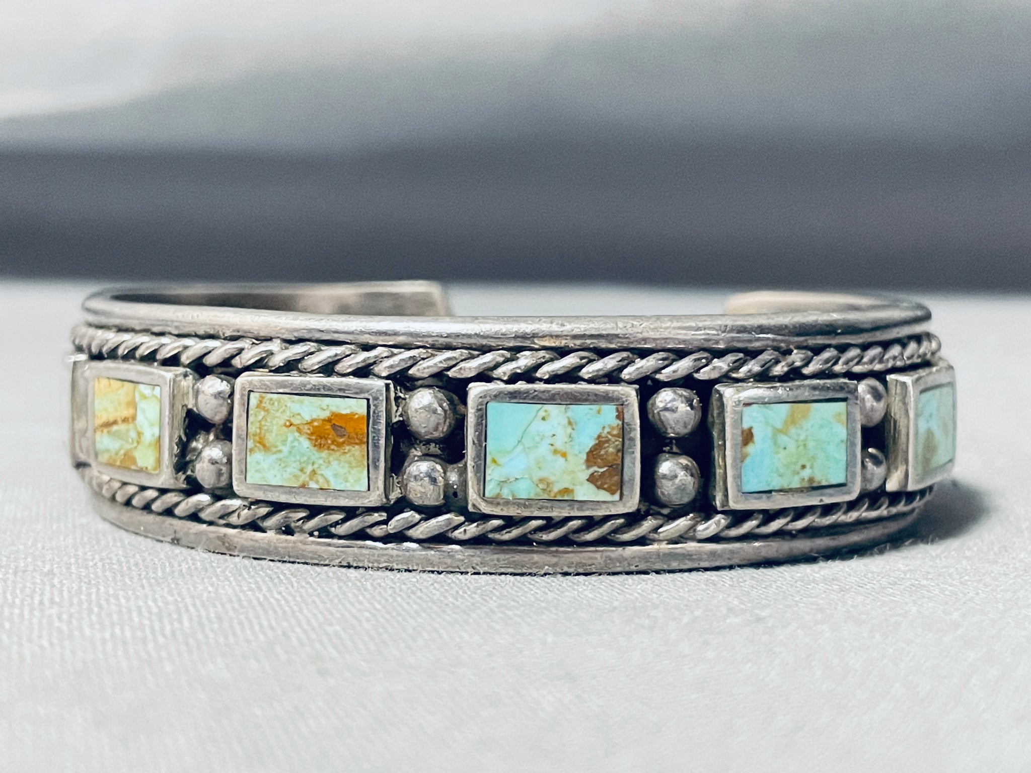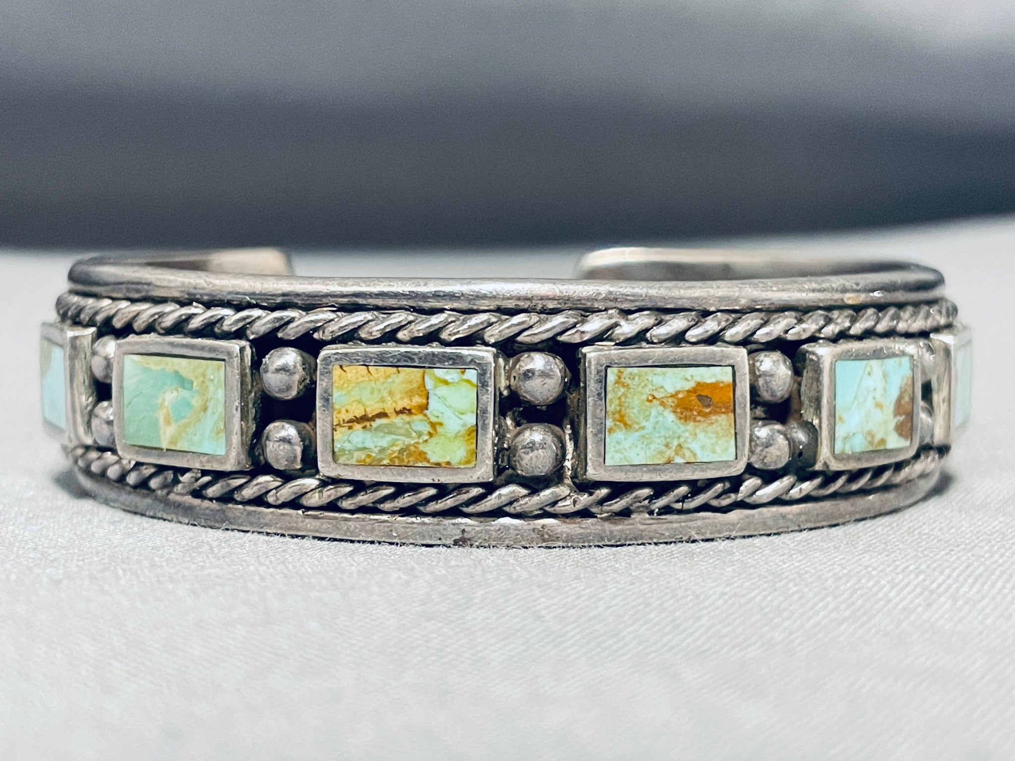 This is a wonderful vintage Southwestern inlaid silver cuff bracelet. This remarkable bracelet contains 11 stunning inlaid rectangular shaped Royston turquoise stones that wrap completely around the cuff. Situated throughout the stones are impressive silver raindrops with bordering very thick silver ropes. This bracelet is very thick and sturdy and contains stunning old natural patina. The stones measure around 3/8" x 1/4". The width of the bracelet measures around 5/8". Sterling silver. Cir. Mid century . The inside end to end measures around 5-3/4" with an additional 1" gap. Sturdy 69 grams.