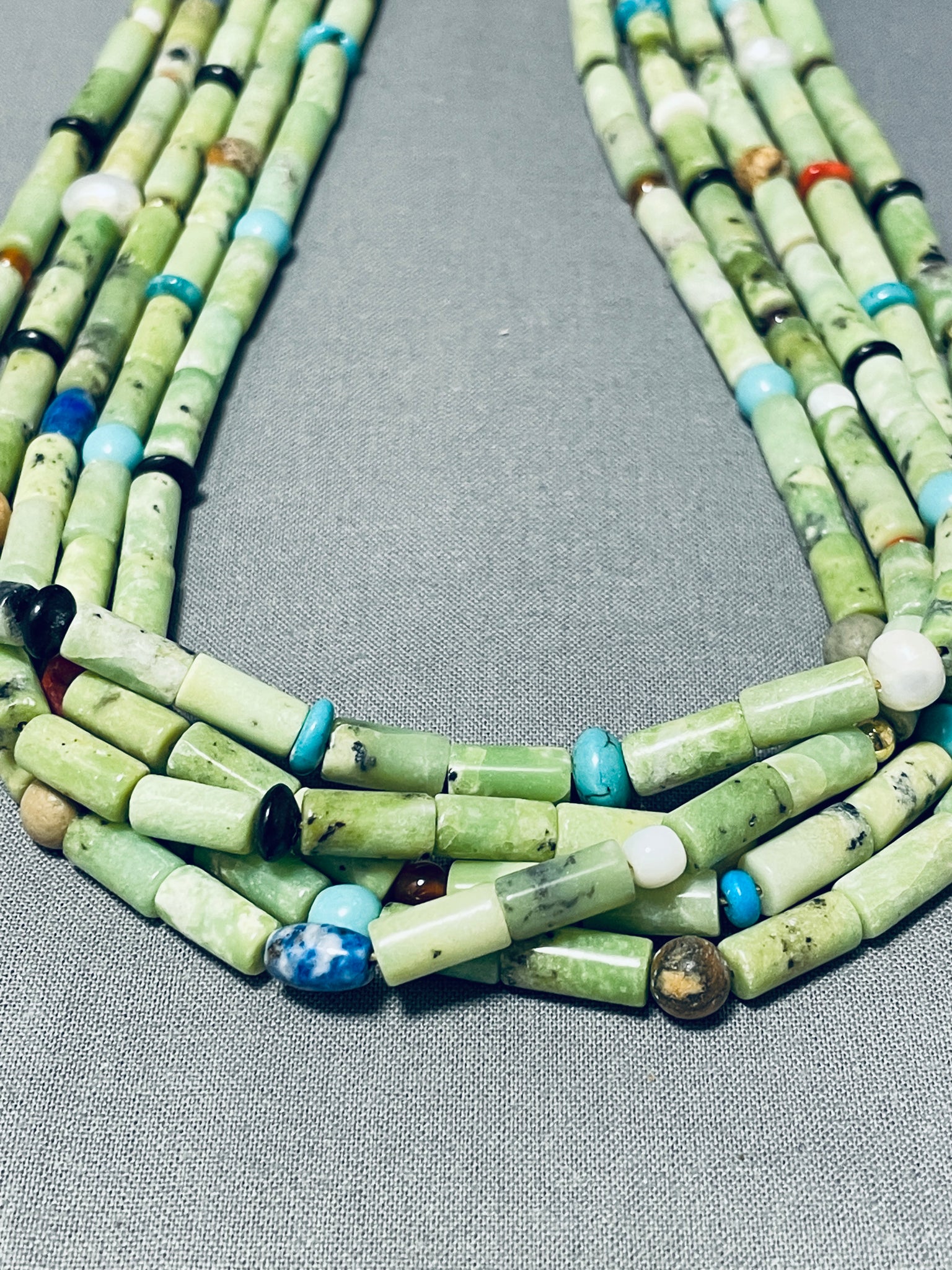 This is an impressive vintage Santo Domingo five strand very long green stone necklace. This necklace contains 5 outstanding strands that consist of tubule shaped serpentine stones that each measure around 3/8" X 1/8". Resting throughout the entire necklace are impeccable stones and shells that consist of turquoise stones, mother pearl shells, onyx stones, and lapis stones. The neck piece is wonderfully braided for a comfortable fit. Cir. Mid century . The length of the necklace measures around 37". Sturdy 194 grams.