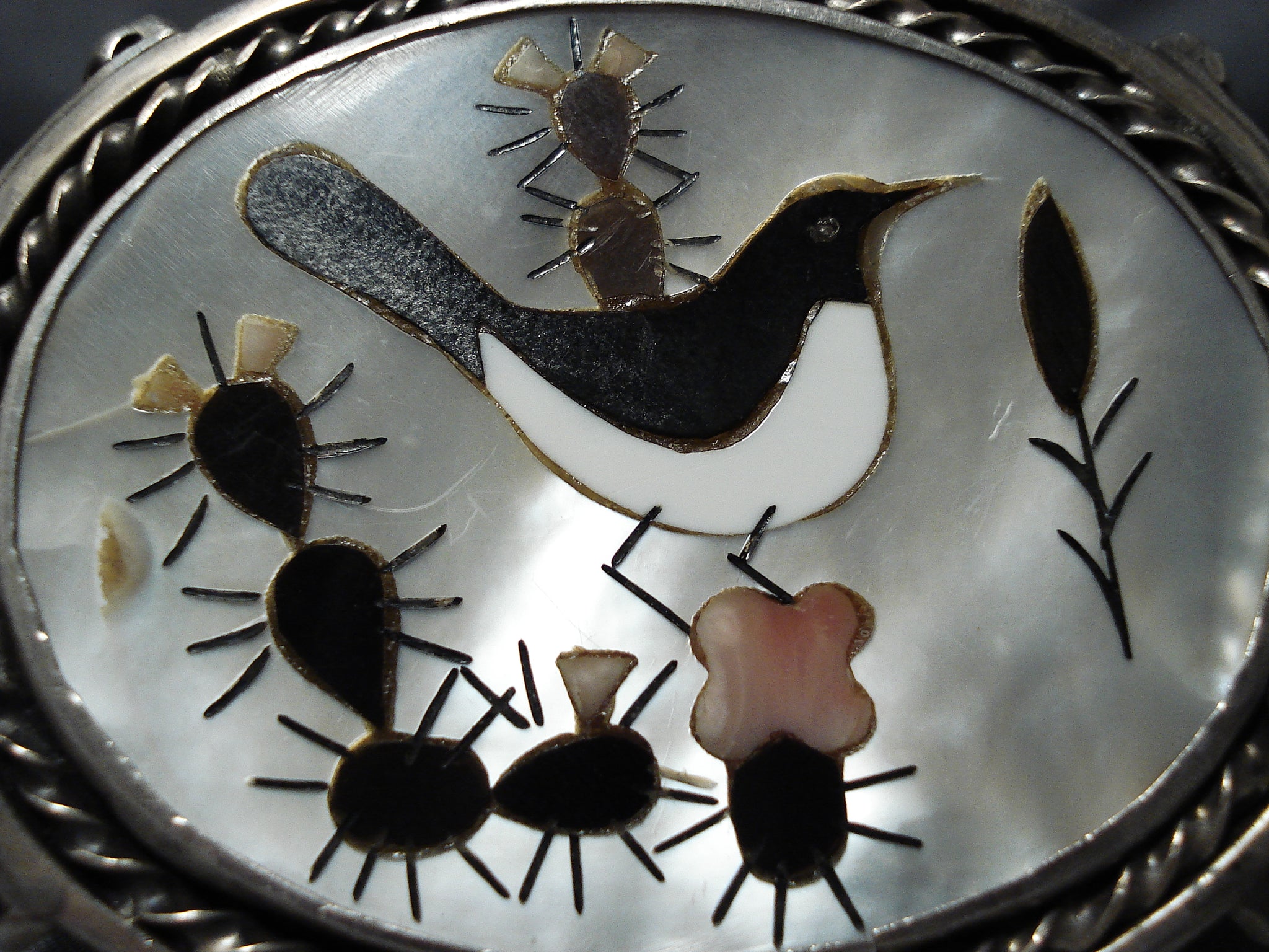 This is a tremendous vintage Zuni inlaid bird silver bracelet being the biggest and best bird inlaid bracelet we have ever collected. This bracelet just sits incredible on the wrist. Check out those huge accenting side silver shield flanks that rest at the ends of the thick and sturdy double silver shank cuff. Also located throughout the bracelet are wonderful thick silver ropes with accenting silver raindrops. The inlay on this bracelet is absolutely remarakble as it contains brown shell, tan shell and mother of pearl. The width of the bracelet measures around 2". Sterling silver. Cir. Mid century . The inside end to end measures around 5-3/4" with an additional 1-1/2" gap. Sturdy 116 grams.