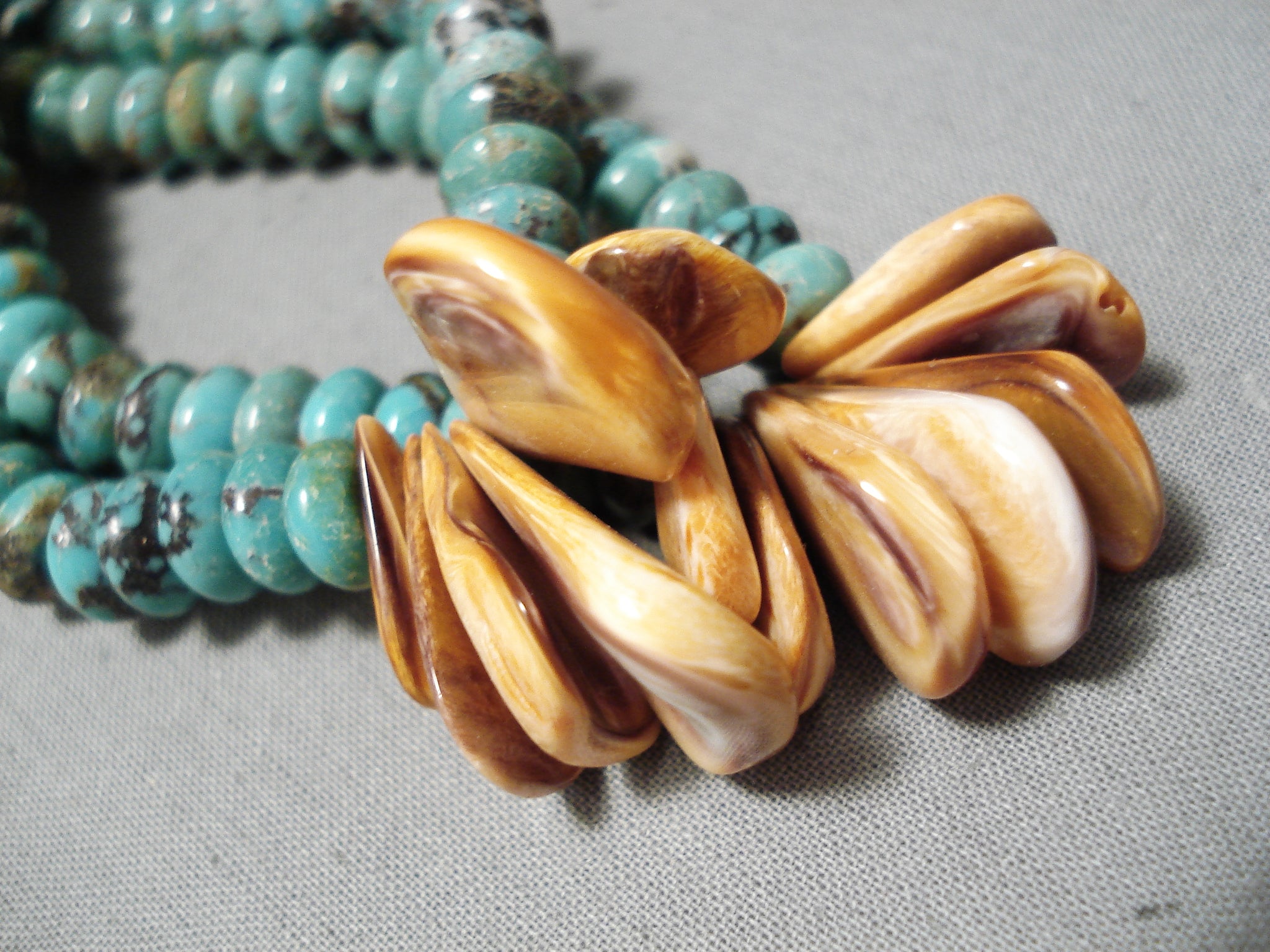This is a magnificent vintage Santo Domingo huge turquoise slab necklace. This impressive necklace contains three very long strands of gigantic Royston slabs with the largest stone measuring around 1-1/8" X 1-1/8". This is the finest Royston slab necklaces we have collected, this necklace includes absolutely incredible top notch workmanship. Resting throughout the large nuggest are fabulous large Royston turquoise stones with end silver cones and a traditional silver clasp. Situated at the bottom of the necklace is a mind blowing double strand jacla pendant that consists of more fabulous Royston stones that are rounded. Accenting the bottom of the jacla pendant are wonderful graduating teardrop shaped spiny oyster shells. Sterling silver. Cir. Mid century. The length of the necklace measures around 44". Sturdy 369 grams.