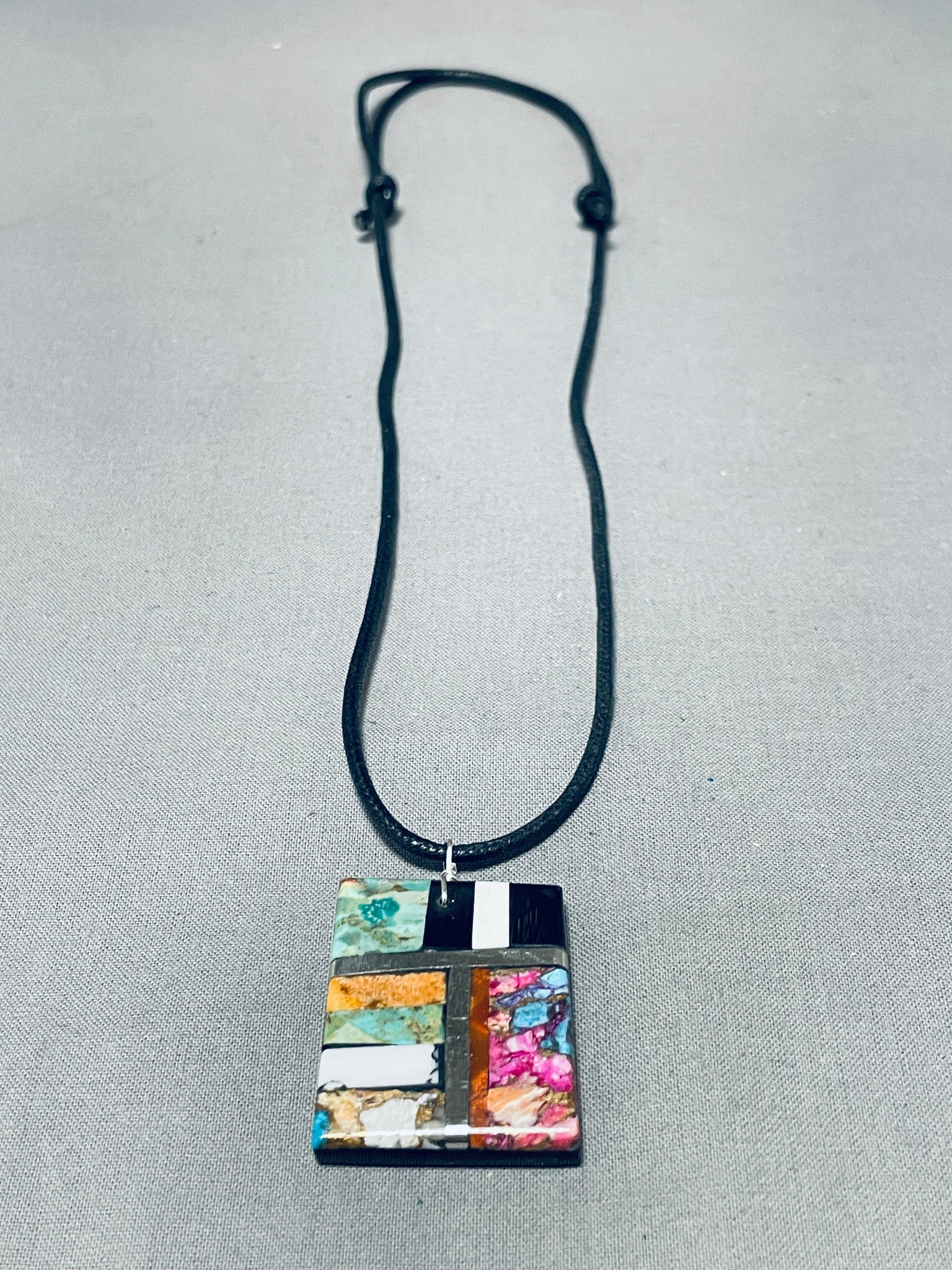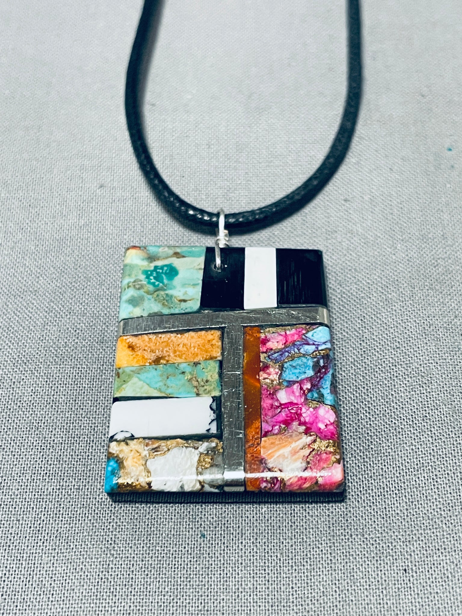 Here we have an exceptional Santo Domingo necklace featuring a square pendant with turquoise and silver inlay, and an adjustable black leather cord! So Appealing! Sterling silver. The length of the necklace measures around 27". Sturdy 10 grams.