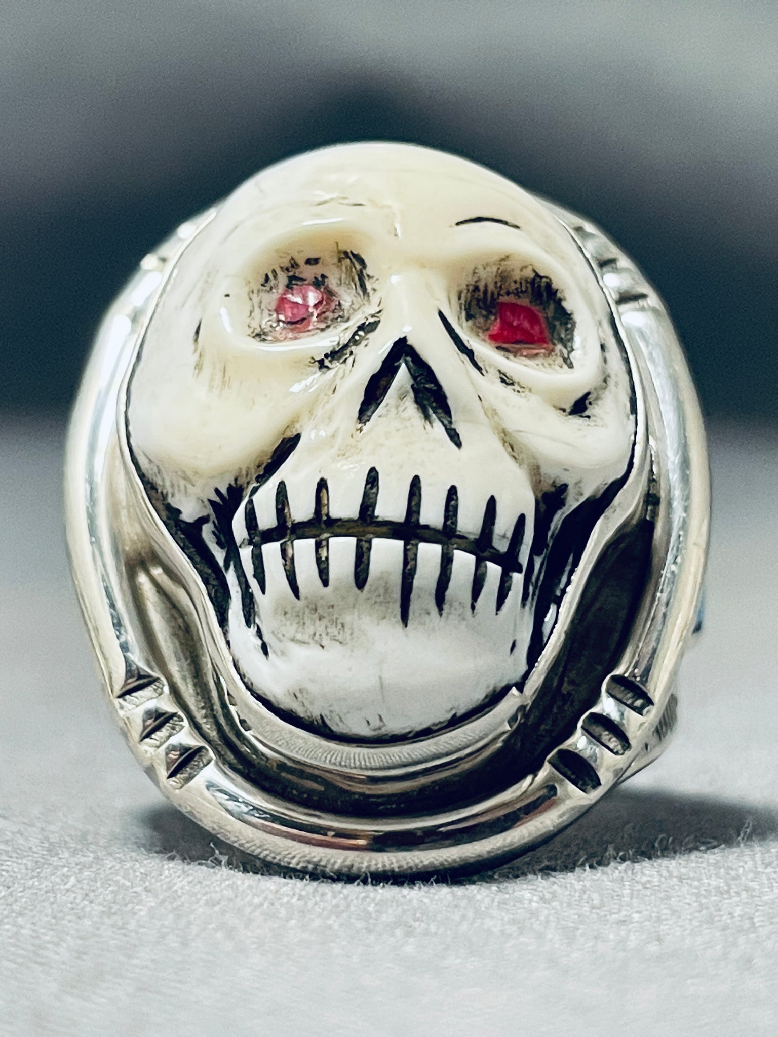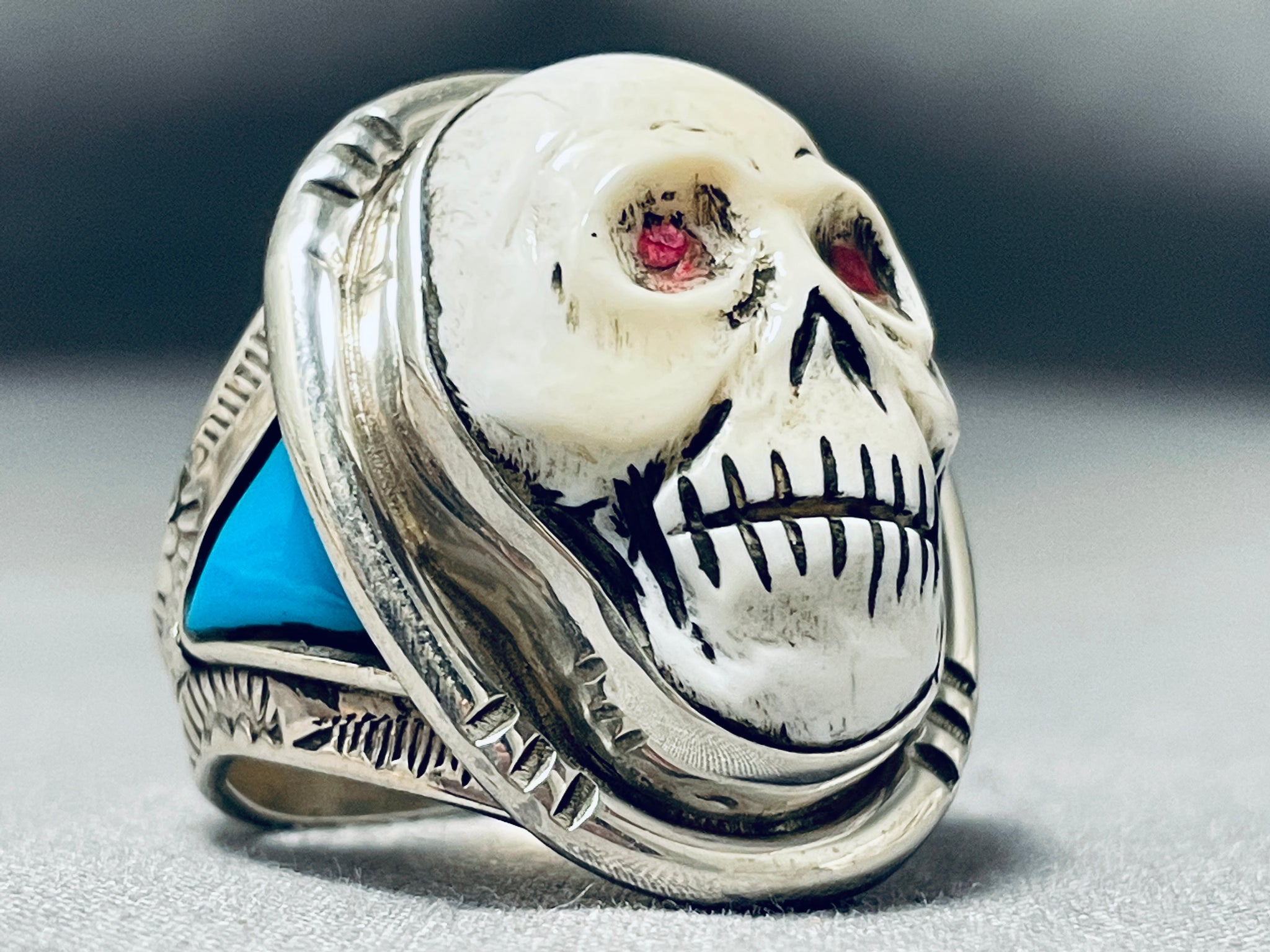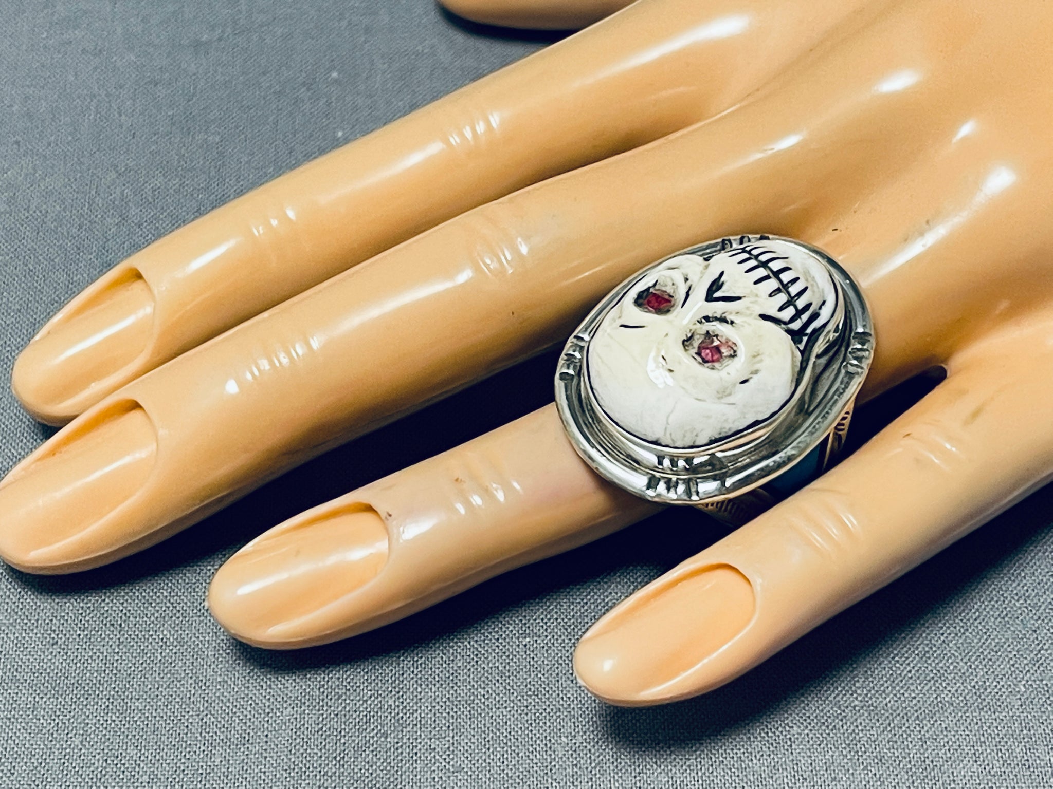 This is a magnificent hand carved multiple stone skeleton mens silver ring handmade by the famous artist, Fran Gomez. This ring contains a mind blowing detailed center hand carved skeleton that is a beautiful white stone. The eyes consist of inlaid corals. Running down the sides of the very thick silver ring are triangular shaped inlaid Sleeping Beauty turquoise stones. I just love the detailing on this ring. The center stone measures around 1" x 3/4". The ring face measures around 1-1/8" x 3/4". Signed by artist, Fran Gomez. The ring size is around 11. Cir. 1970's+. Sterling silver, marked. Sturdy 19 grams.