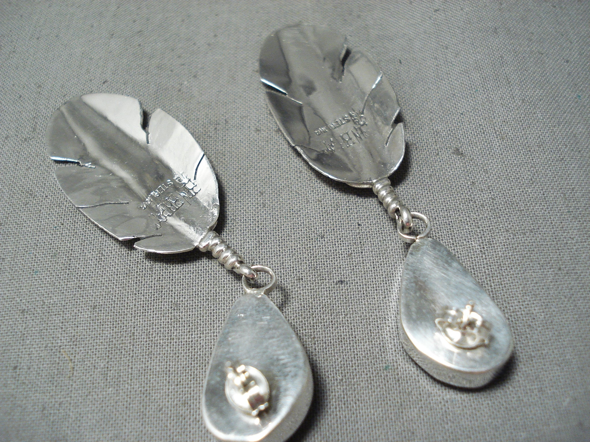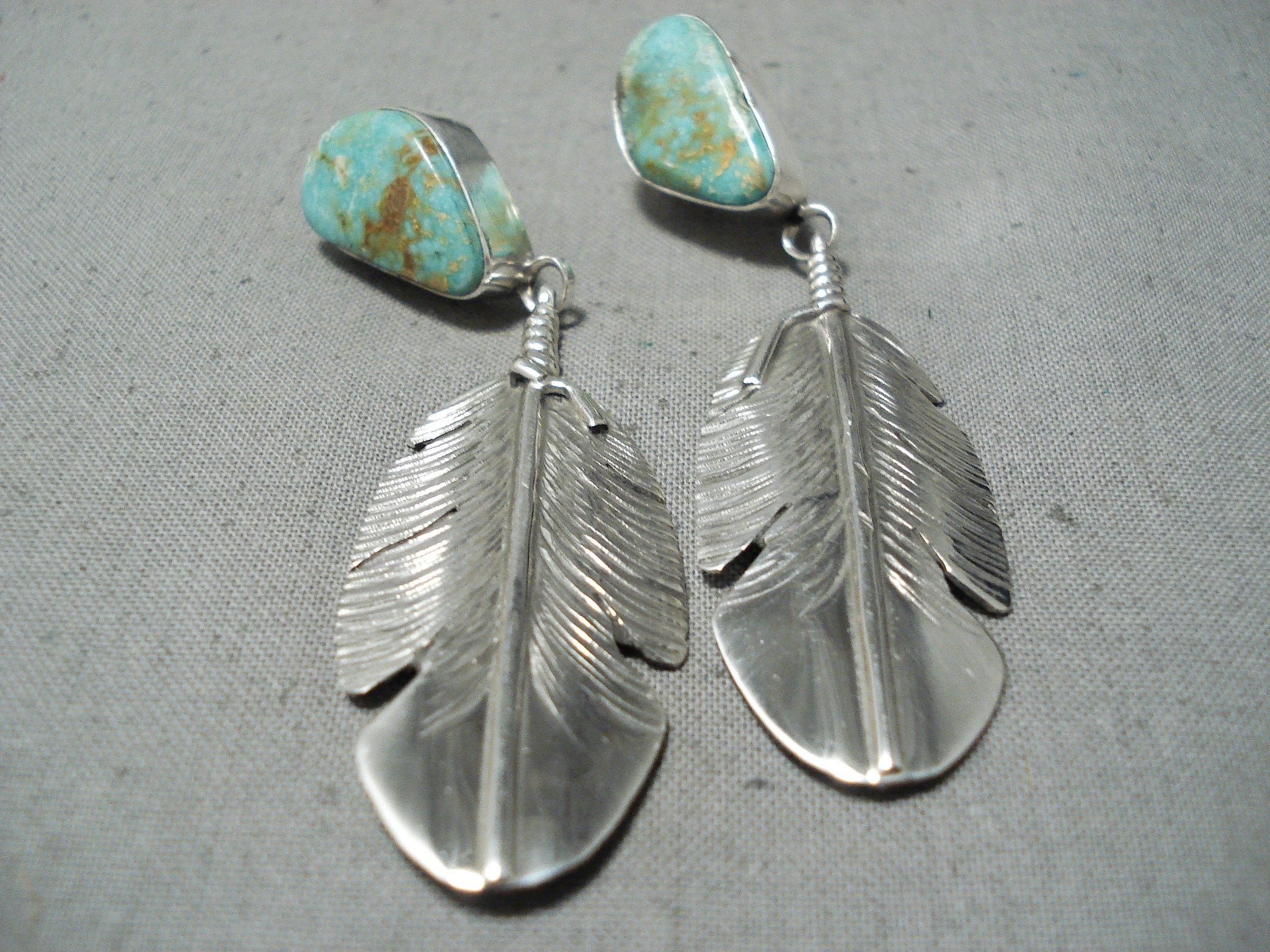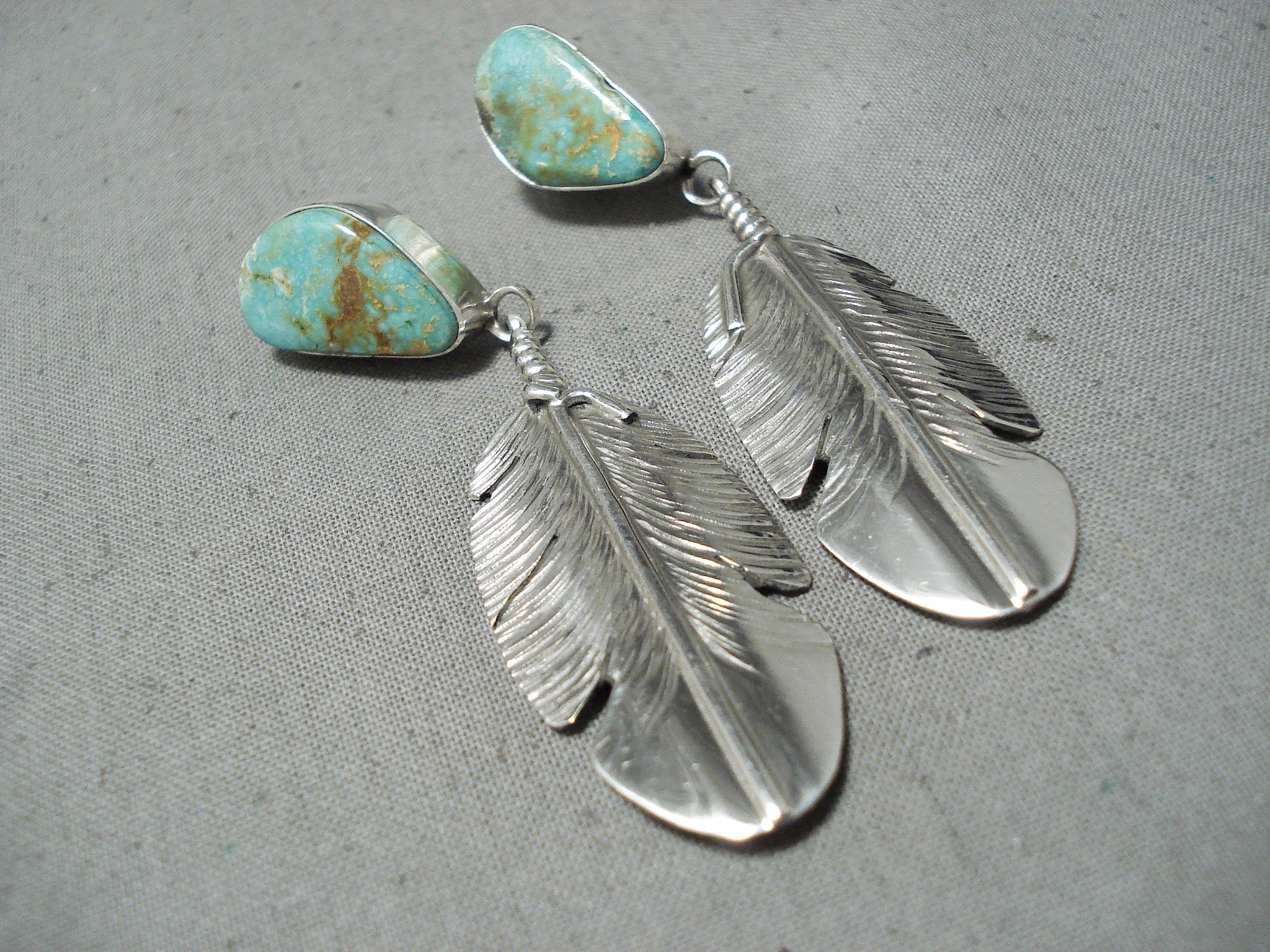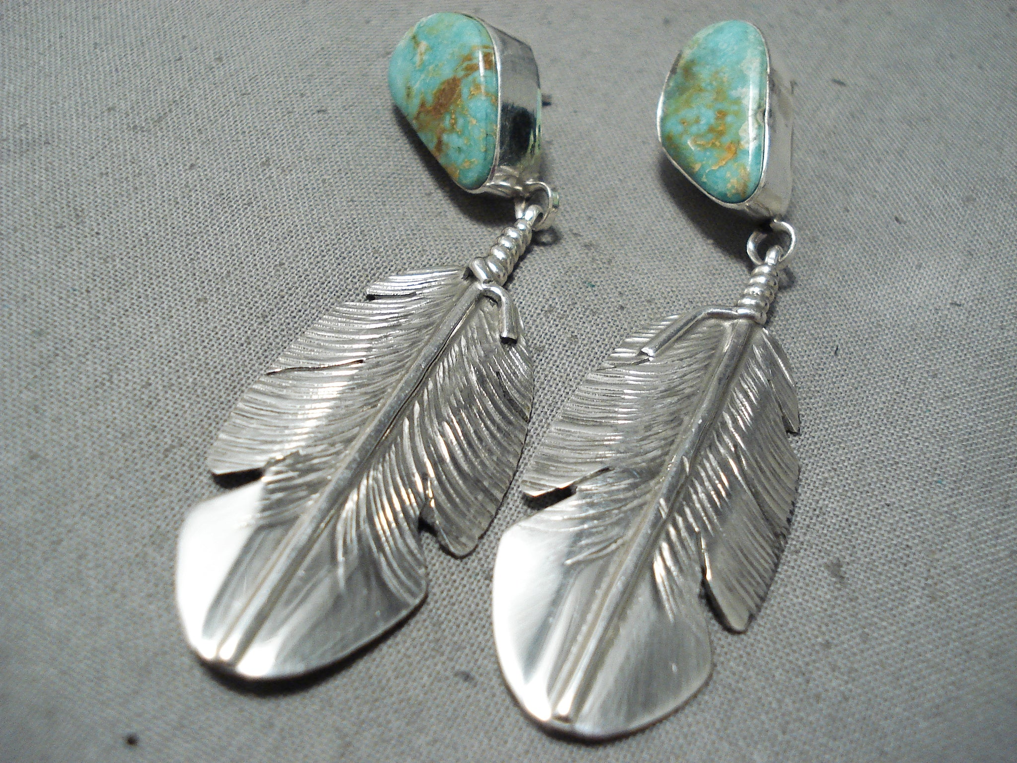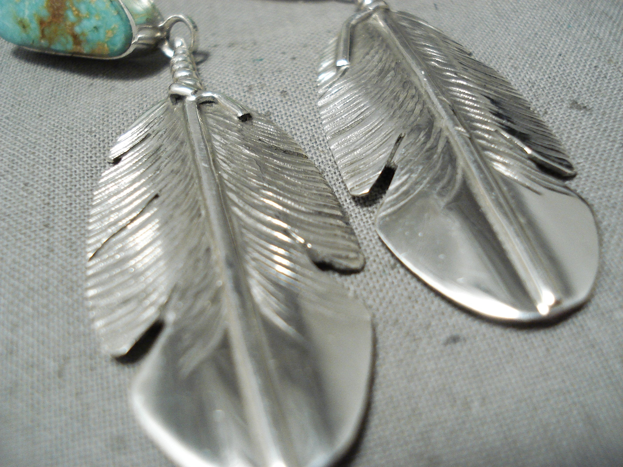Native American Detailed Feather Genius Royston Turquoise Sterling Silver Earrings
