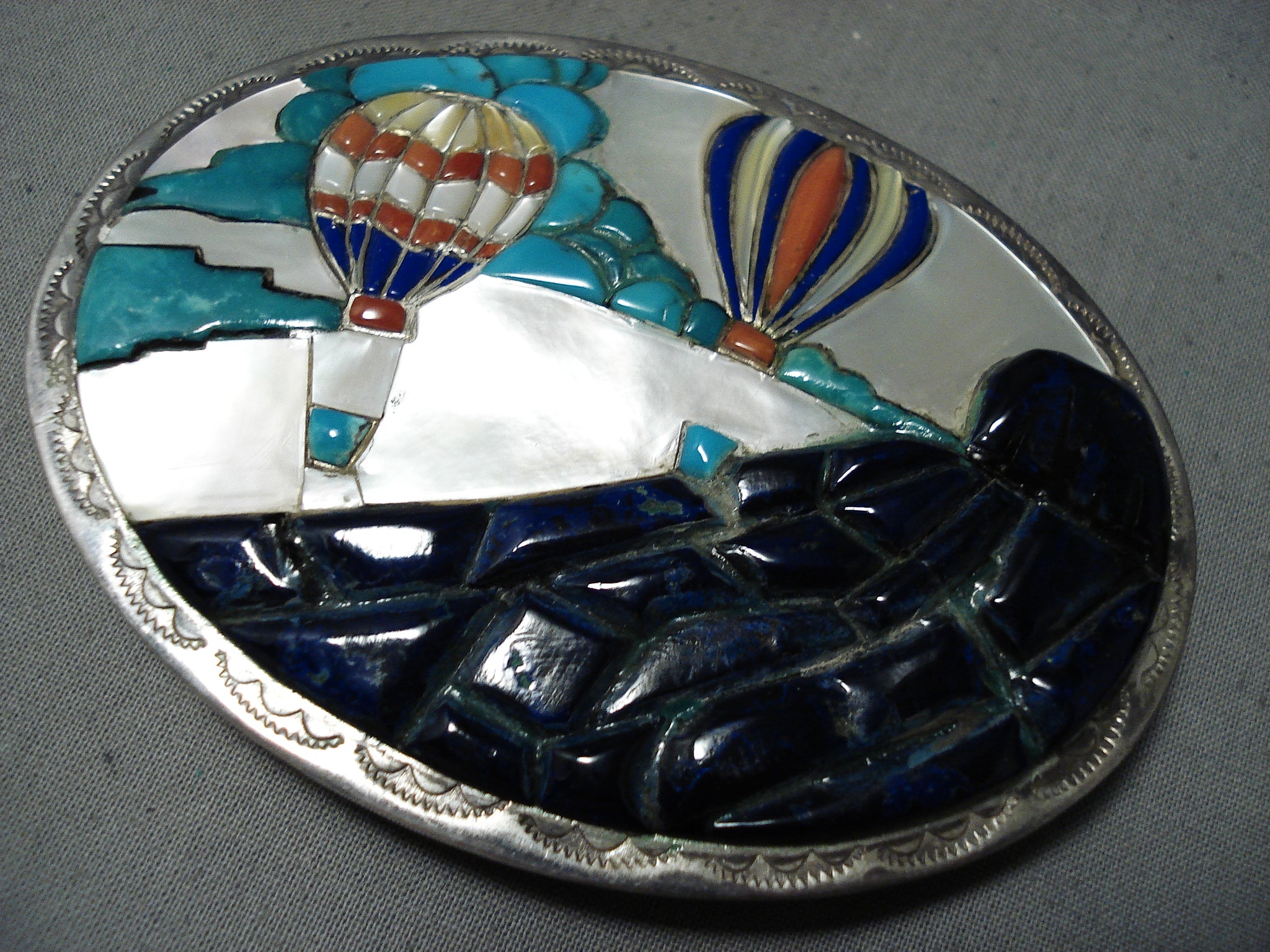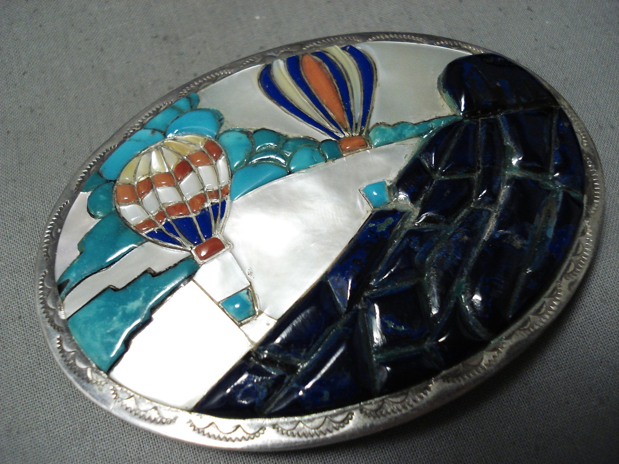 This is a striking vintage Jemes inlaid air balloon silver buckle. This remarkable piece is absolutely amazing as it contains two hot air balloons flying over a superior monument in the beautiful sky. It is nostalgic for artists to live in NM because of Balloon Fiesta. So this is a nostalgic artist piece. The inlay on the buckle consists of phenomenal lapis, mother of pearl, coral, and Carico Lake turquoise stones. Bordering the 3-1/2" X 2-5/8" thick and sturdy silver buckle are wonderful silver sun and cloud patterns. This buckle can fit a belt width of about 1-5/8" or less. Sterling silver, marked. Signed by Jemes artist, Neil Paquin. Cir. 1970's+. Sturdy 72 grams.