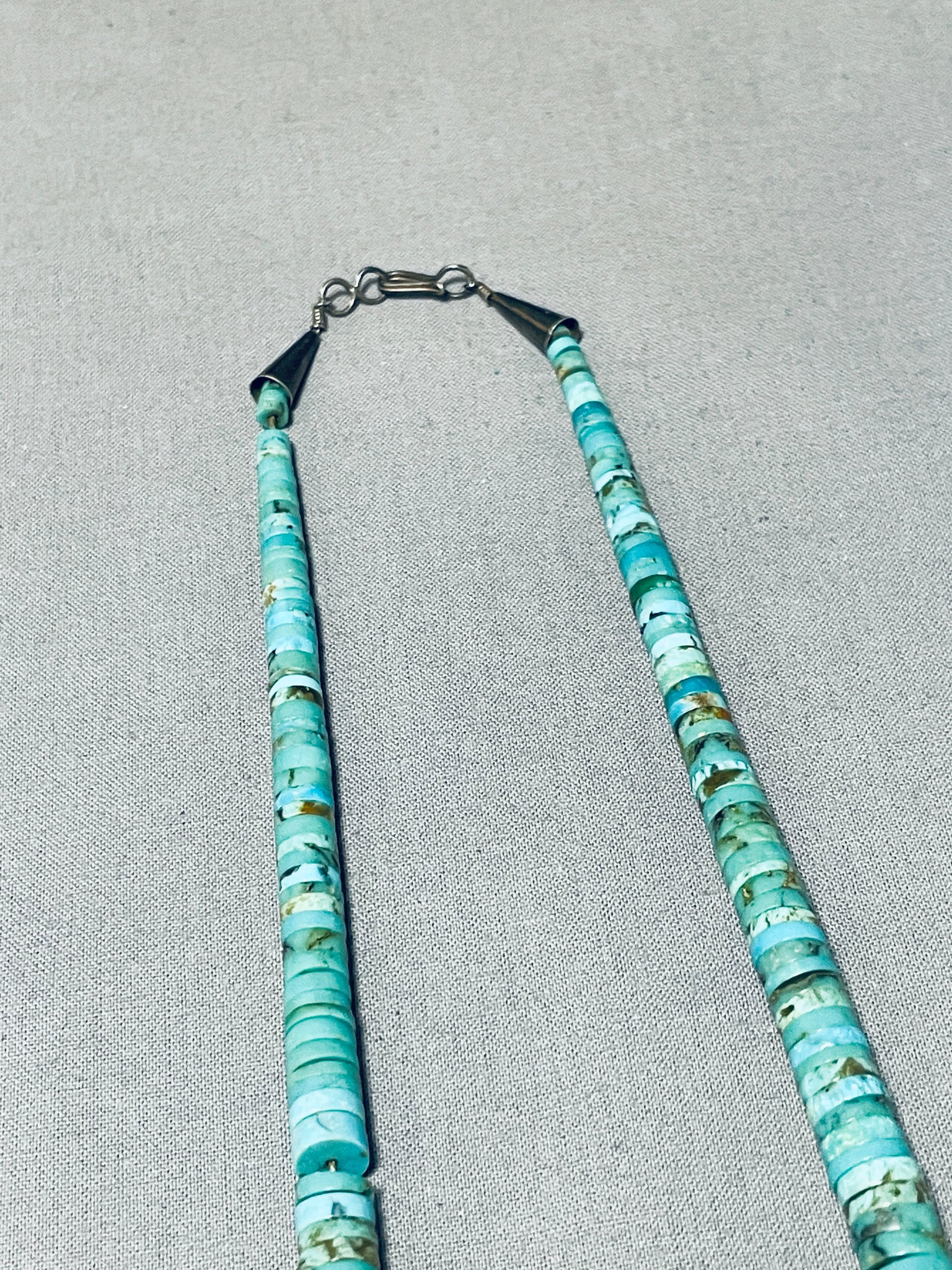 Here we have a gorgeous vintage Santo Domingo necklace! It features a single strand of handcut turquoise discs, silver cones, and a silver hook and eye clasp! Positively Delightful! Sterling silver. The length of the necklace measures around 10". Sturdy 44 grams. Cir Mid Century