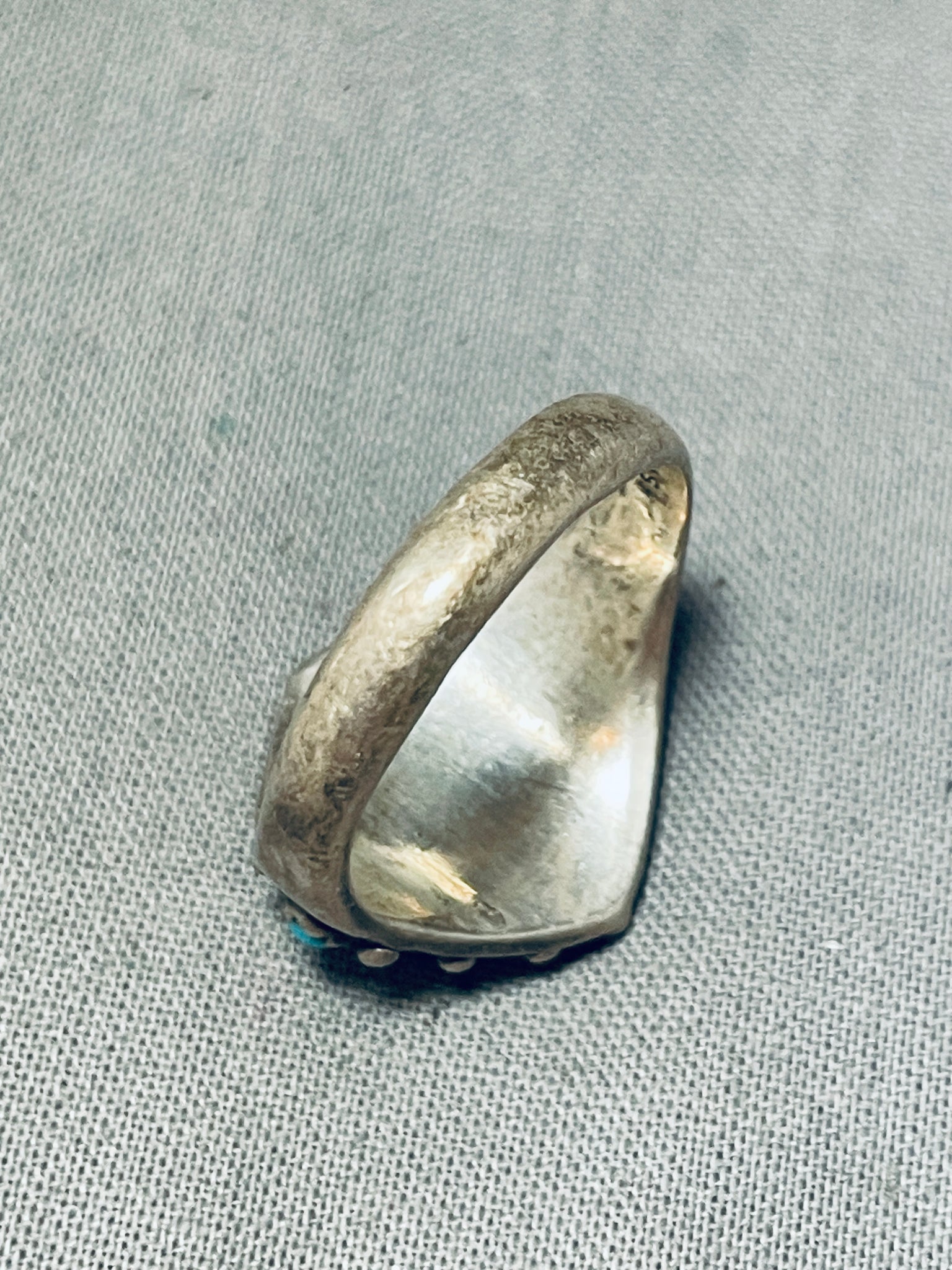 Blue Gem turquoise is a highly prized and rare variety known for its exceptional range of colors, which can vary from deep blue to green, often with a striking golden or brown matrix. Mined in several locations across Nevada, including the famed Blue Gem Mine, this turquoise is renowned for its hardness and durability, making it ideal for intricate jewelry work. The stone's vibrant hues and strong matrix patterns have made it a favorite among Native American jewelers, particularly for use in traditional Navajo and Zuni designs. Blue Gem turquoise is sought after not only for its beauty but also for its rarity, as many of the mines that produced it are now depleted, adding to the gemstone's allure and value among collectors. The stones measure around 1/16" x 1/16". The ring size is around 8. Sterling silver, marked. Sturdy 5 grams. Cir Mid Century +