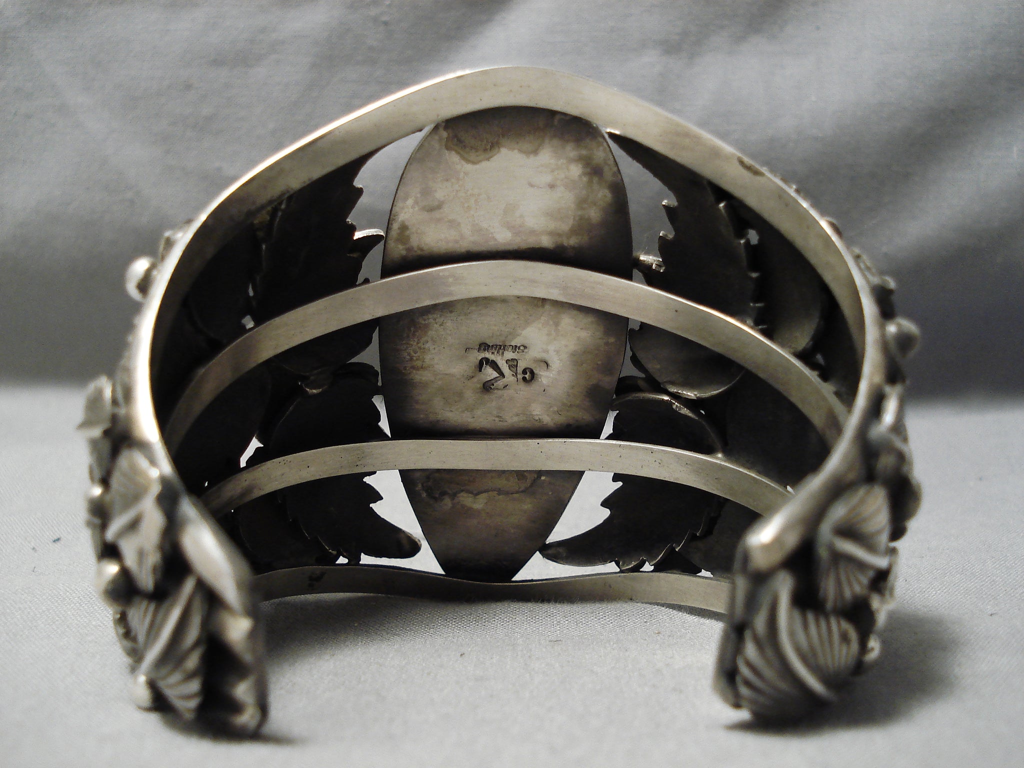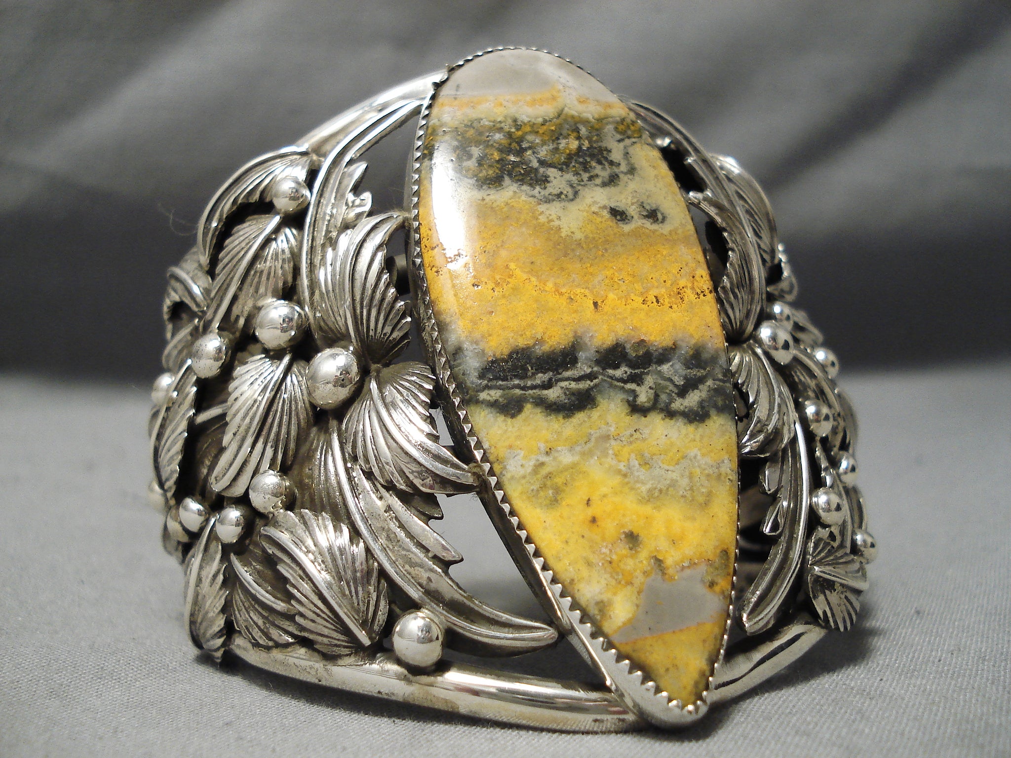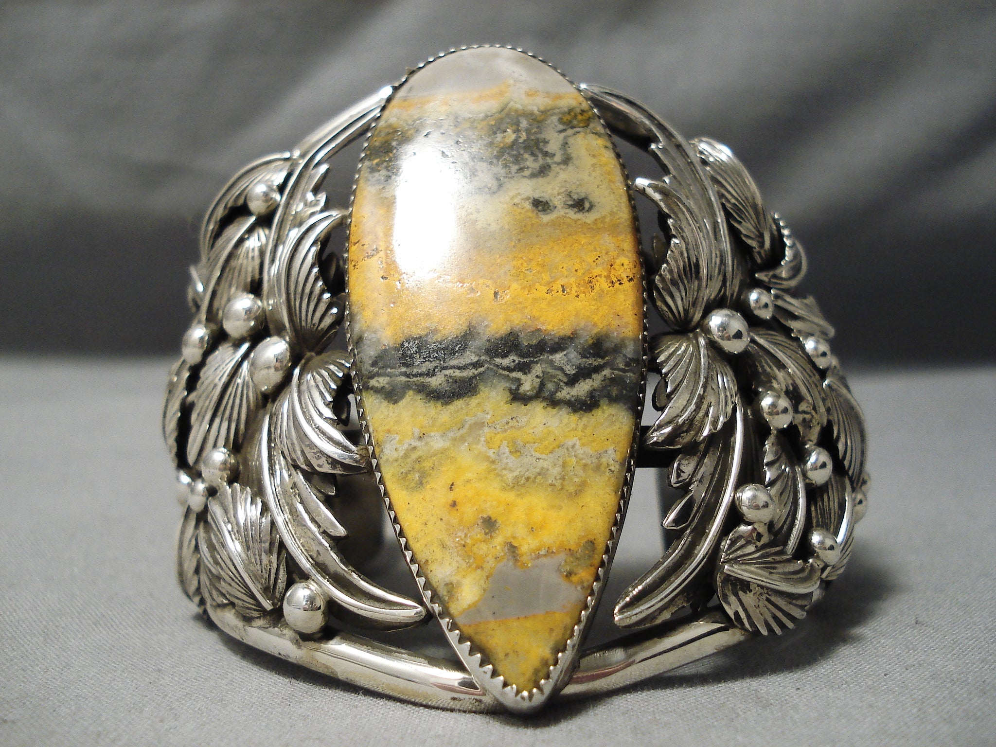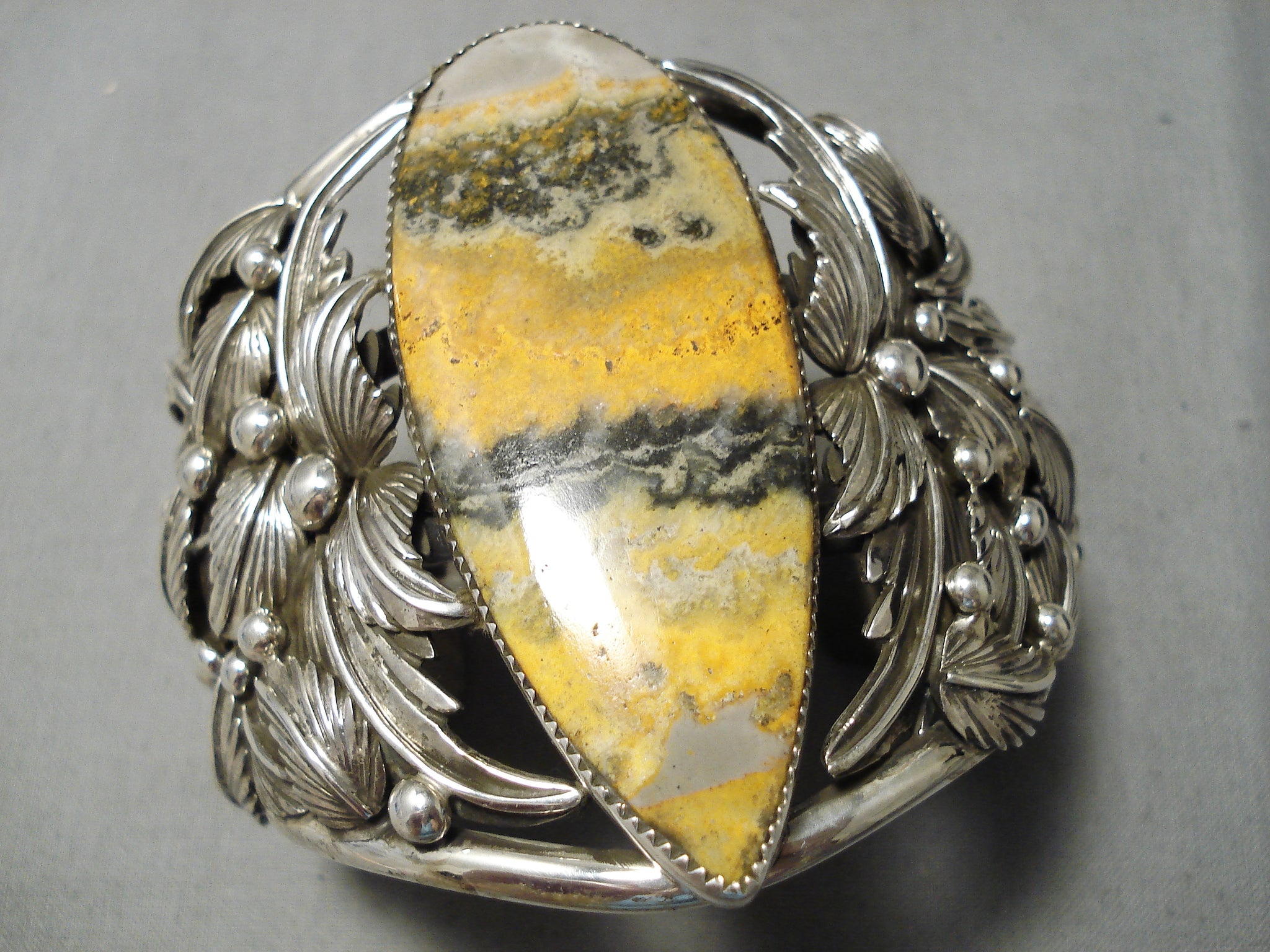 Native American Exquisite Huge Bumble Bee Jasper Sterling Silver Leaves Bracelet Cuff