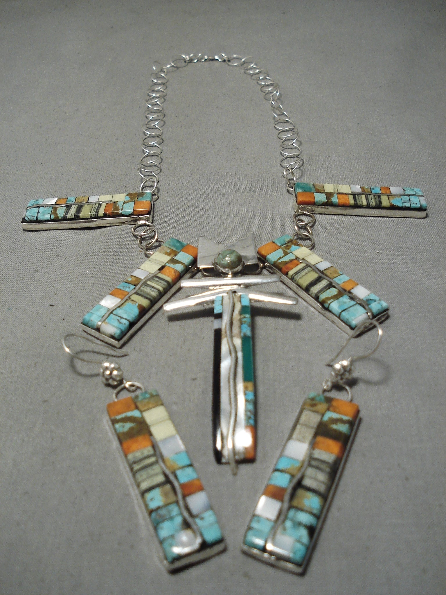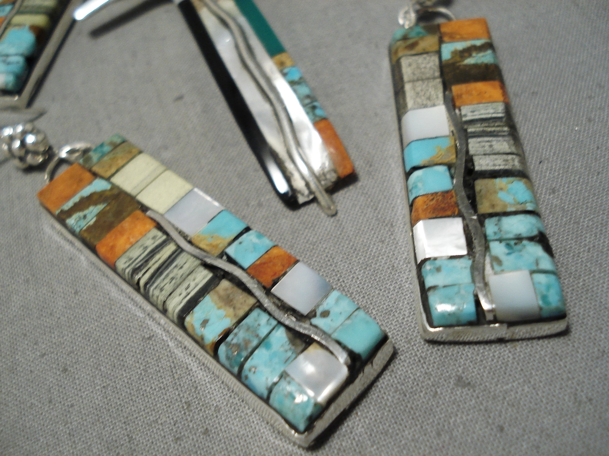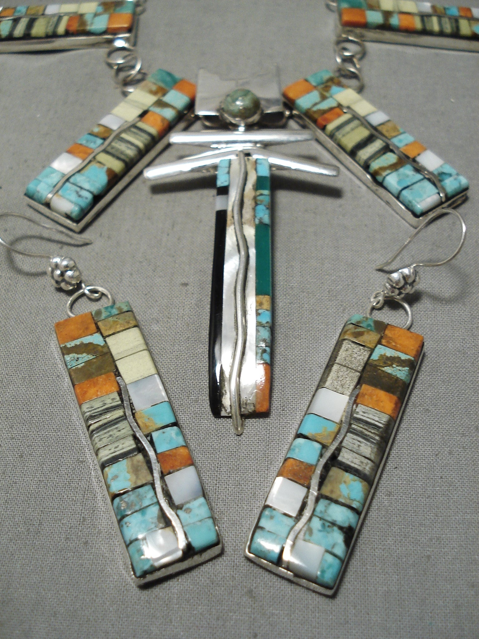 Here we have an incredible Santo Domingo silver necklace and earring set having inlay turquoise, coral, mother of pearl and jet! The necklace has 5 rectangular silver pendants and a silver chain with a handmade silver hook and eye clasp! The matching earrings have silver florals and handmade sivler hooks! Absolutely Stunning Set! The large center pendant measures about 3-5/8" x 1-5/8". Earrings measure about 2-3/4" top to bottom. Sterling silver, marked. Santo Domingo artist, T. Bailon. The length of the necklace measures around 16". Sturdy 93 grams.
