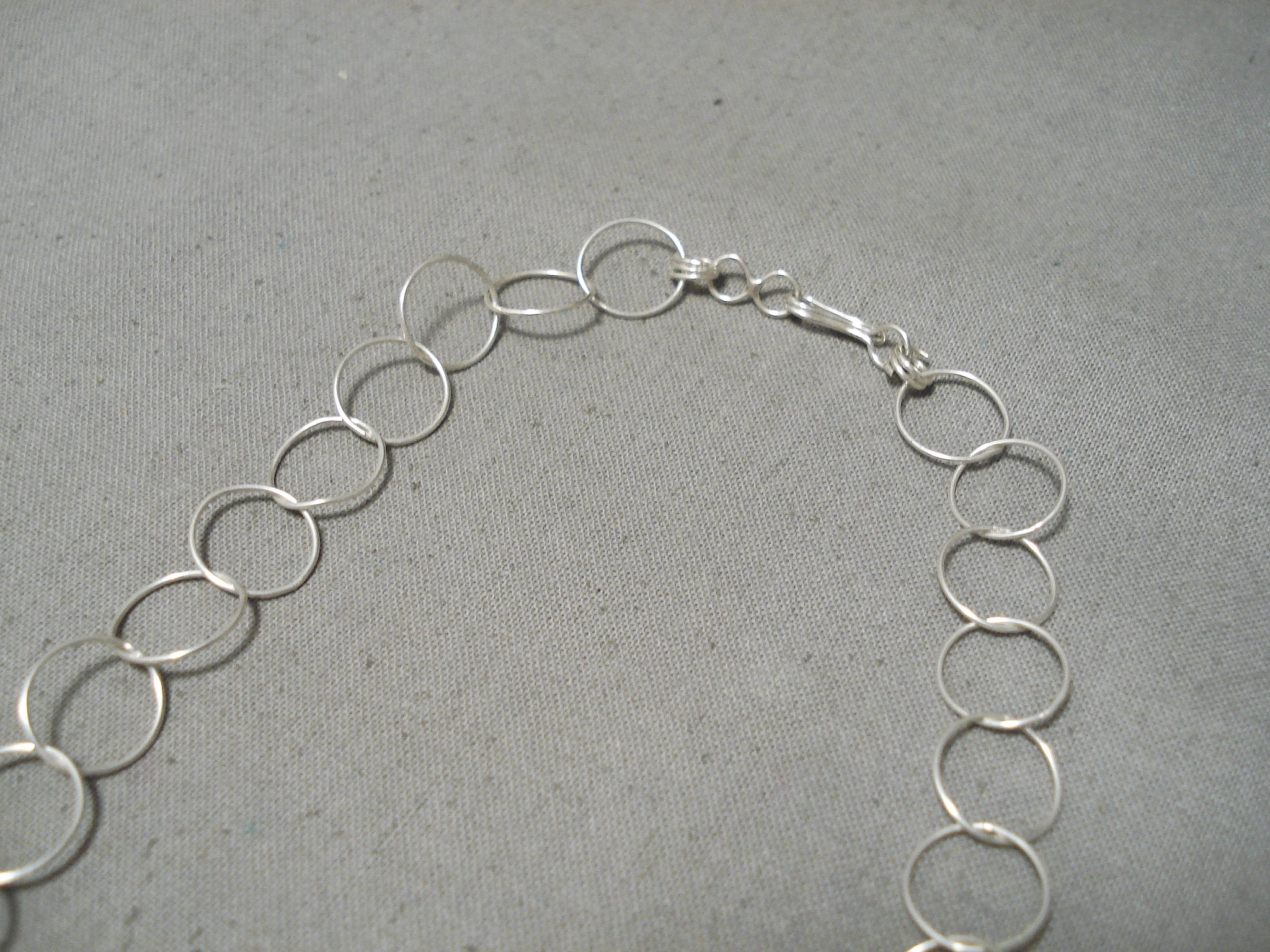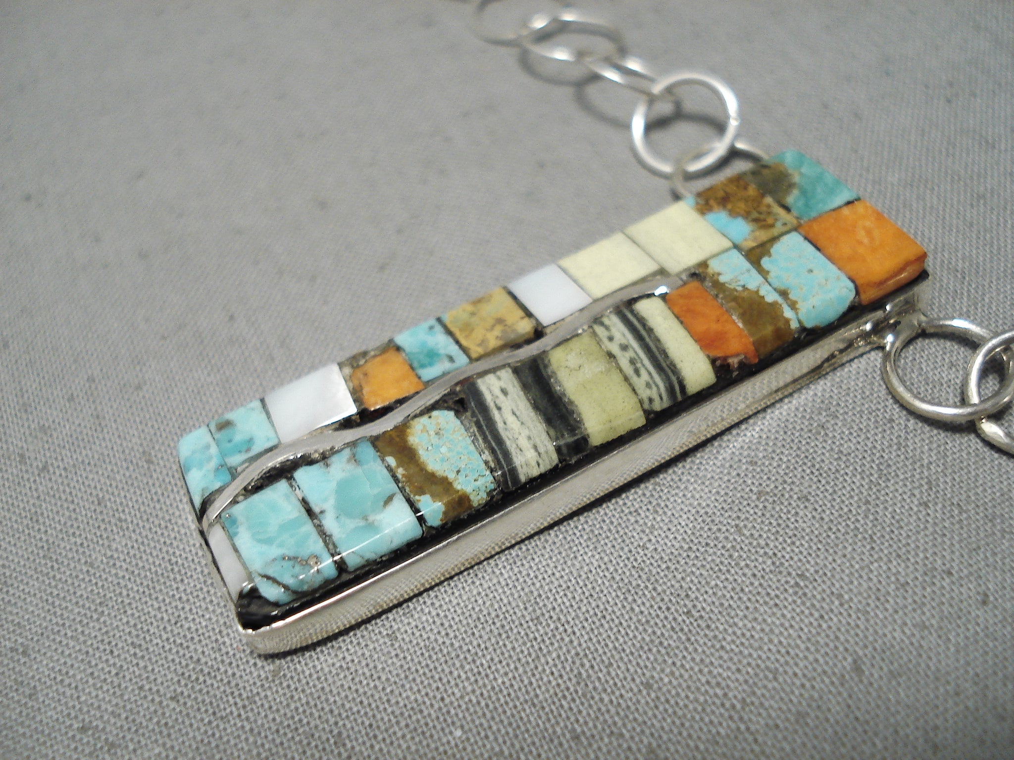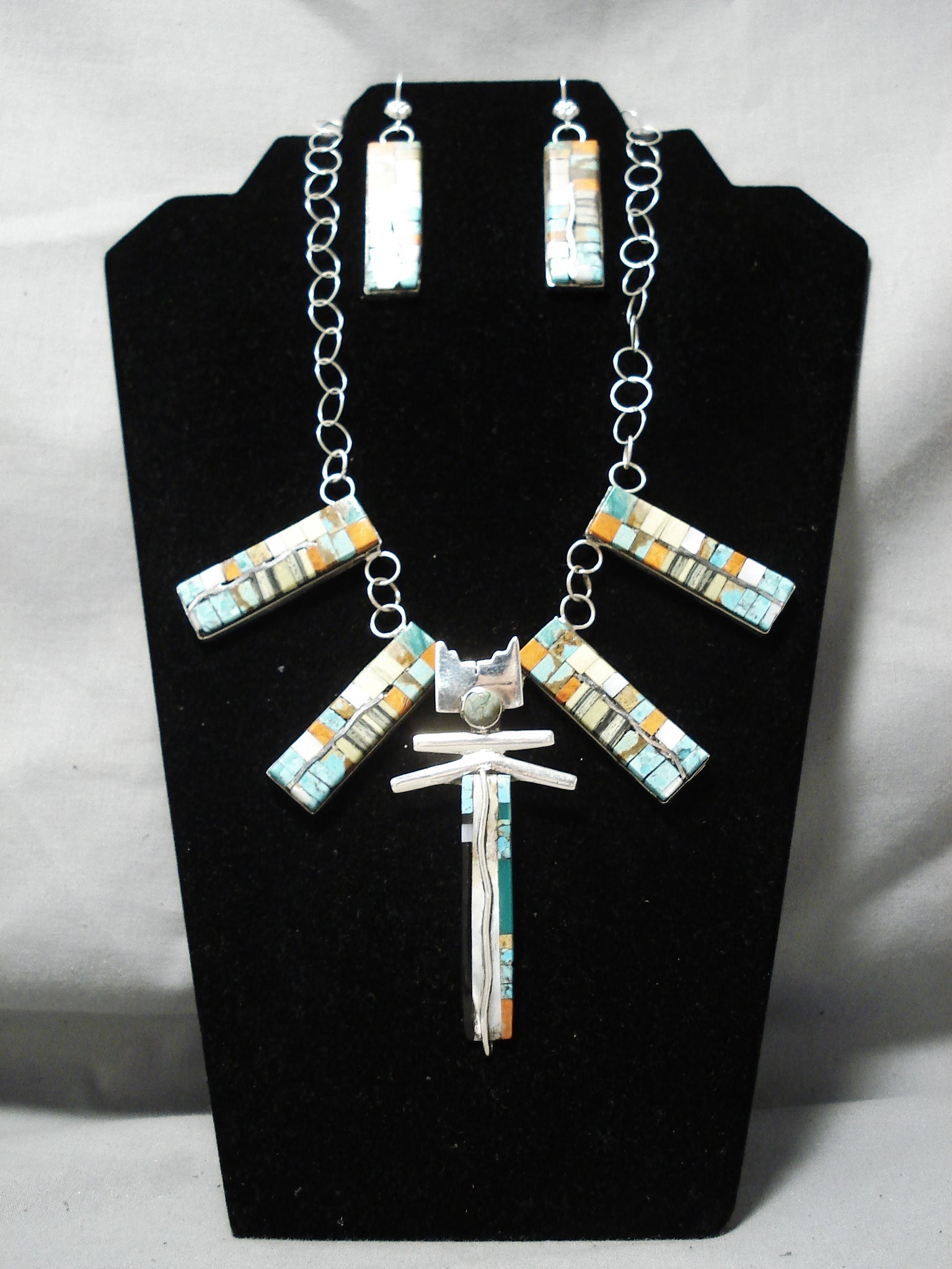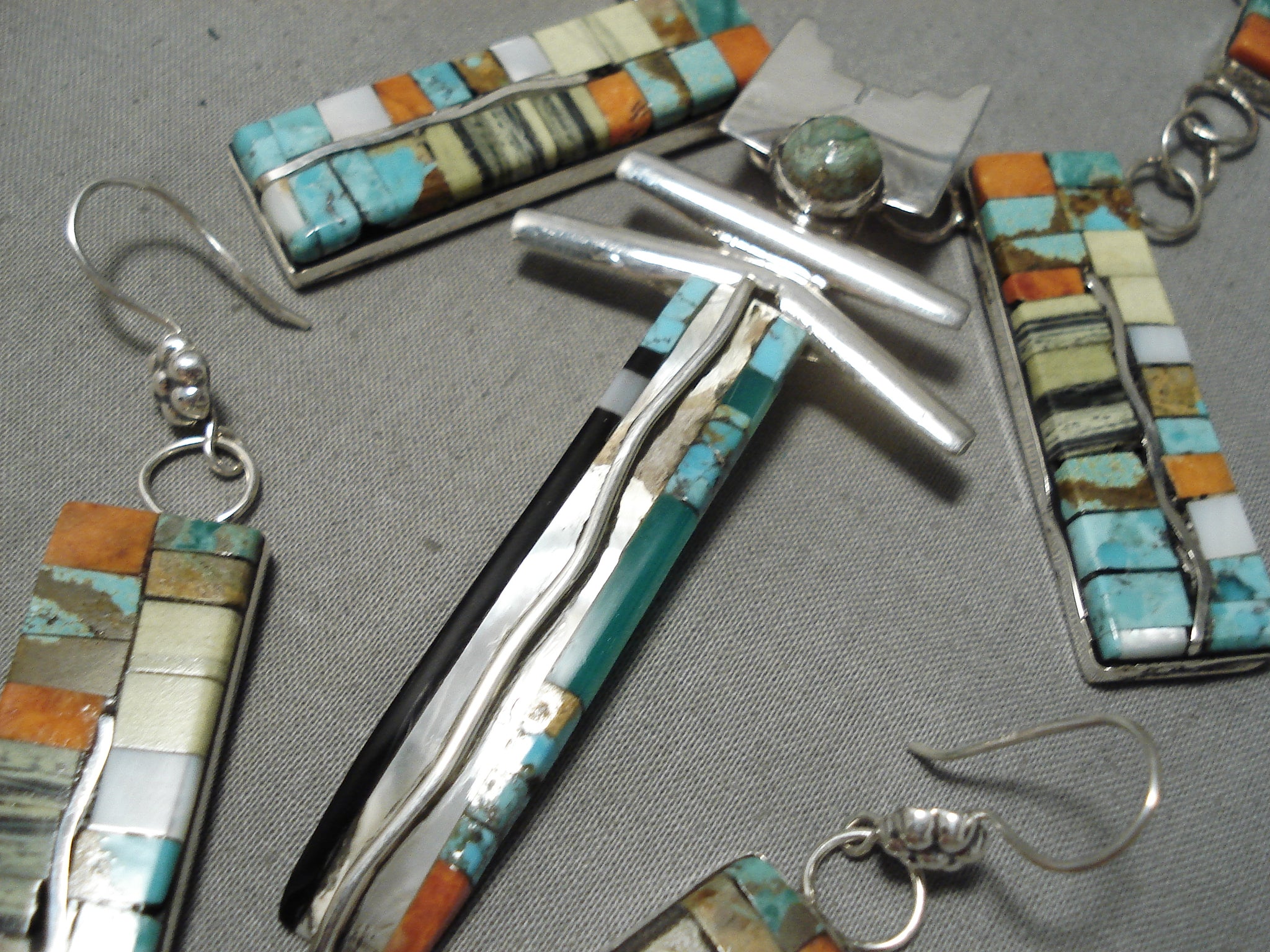 Here we have an incredible Santo Domingo silver necklace and earring set having inlay turquoise, coral, mother of pearl and jet! The necklace has 5 rectangular silver pendants and a silver chain with a handmade silver hook and eye clasp! The matching earrings have silver florals and handmade sivler hooks! Absolutely Stunning Set! The large center pendant measures about 3-5/8" x 1-5/8". Earrings measure about 2-3/4" top to bottom. Sterling silver, marked. Santo Domingo artist, T. Bailon. The length of the necklace measures around 16". Sturdy 93 grams.