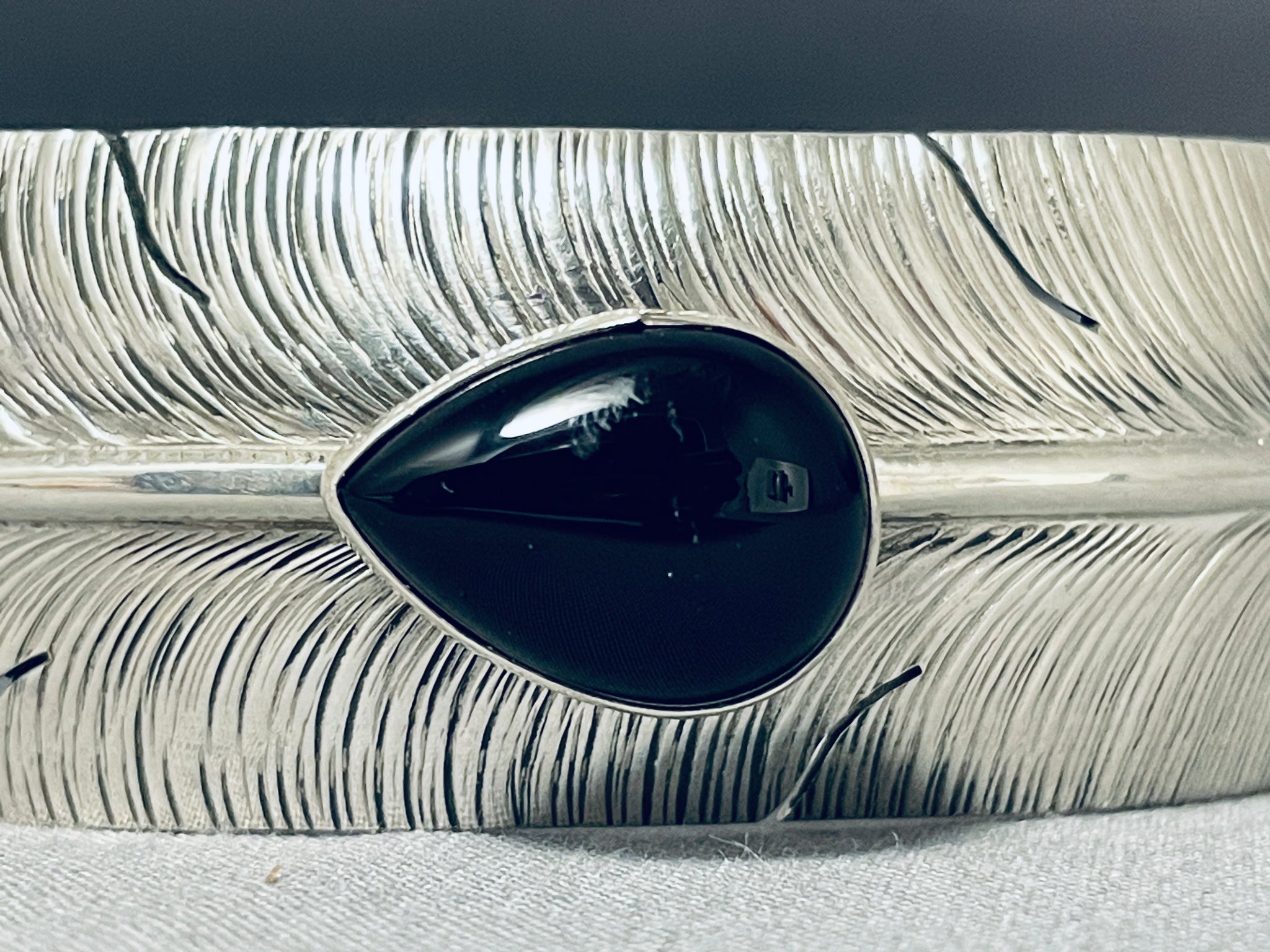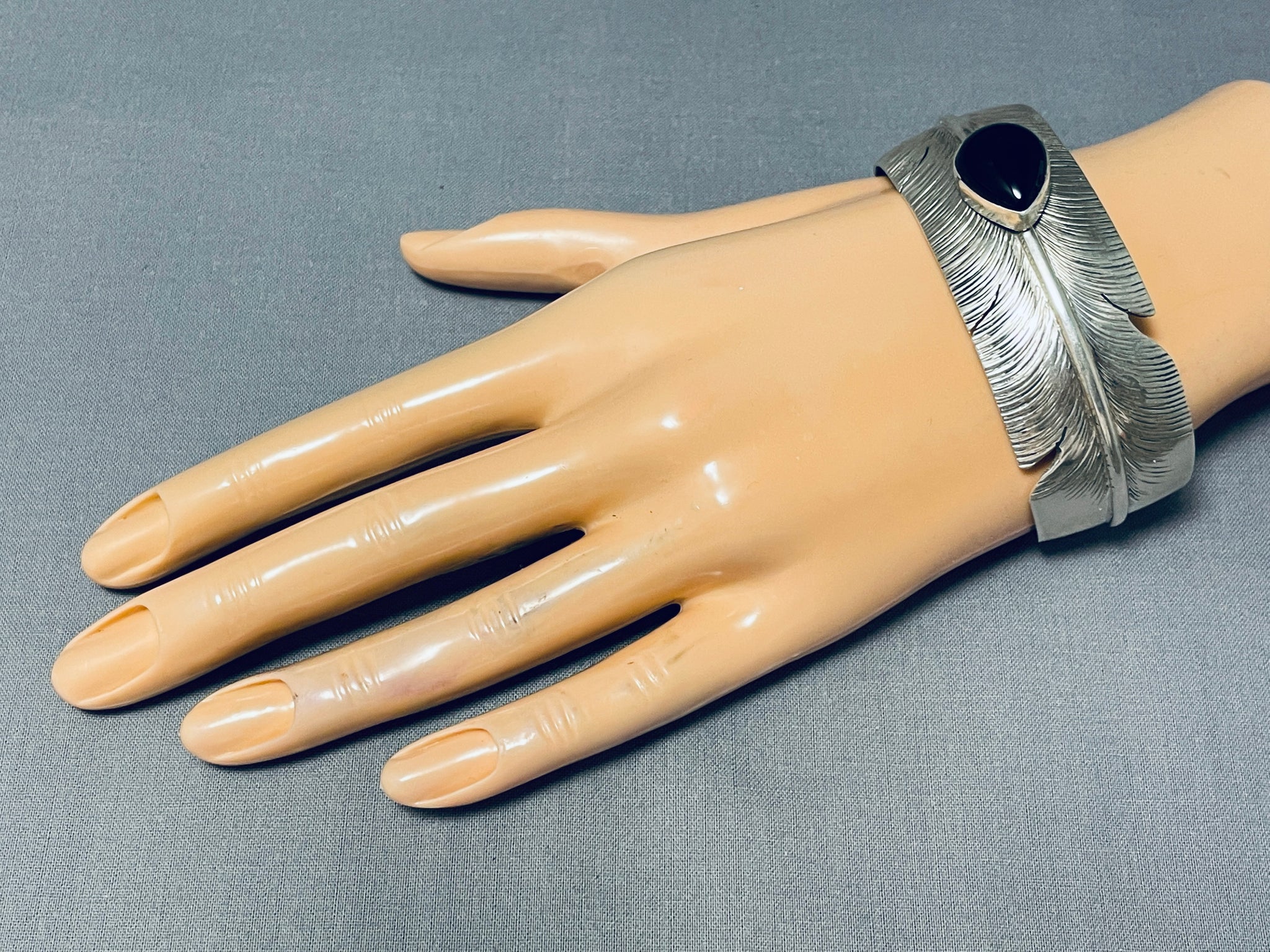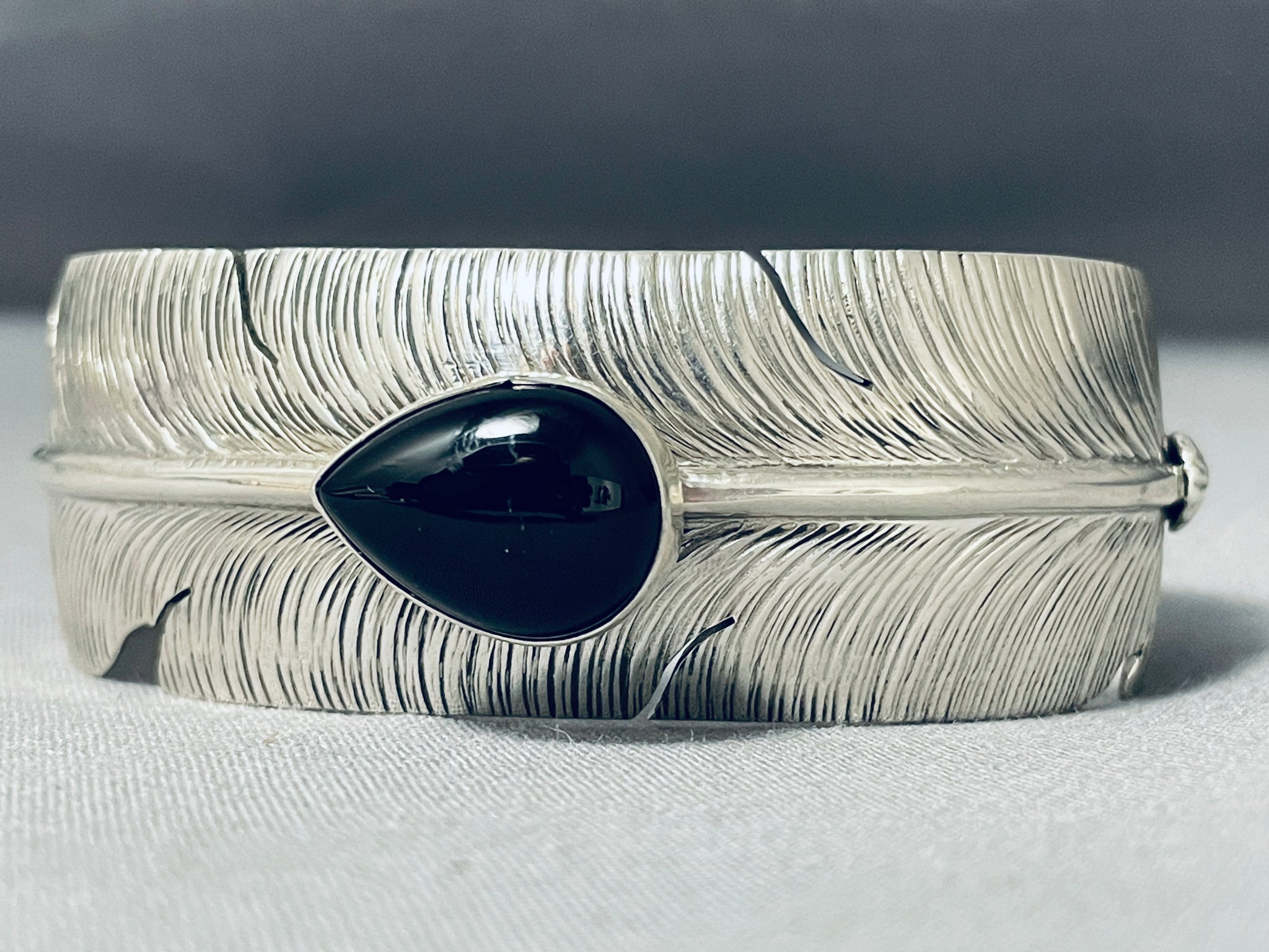This is a wonderful vintage Navajo large cuff single onyx stone silver feather bracelet. This bracelet was handmade by the famous artist, Ben Begaye. What makes this bracelet so unique is that the entire cuff is wonderfully hand carved into a very detailed silver feather with accenting coiled patterns at one end along with accenting silver shell. Located in the center of the cuff is a fat teardrop shaped onyx stone. The center stone measures around 3/4" x 1/2". The width of the bracelet measures around 1". Signed by Navajo artist, Ben Begaye . Sterling silver, marked. Cir. 1970's+. The inside end to end measures around 5-3/4" with an additional 1-1/2" gap. Sturdy 34 grams.