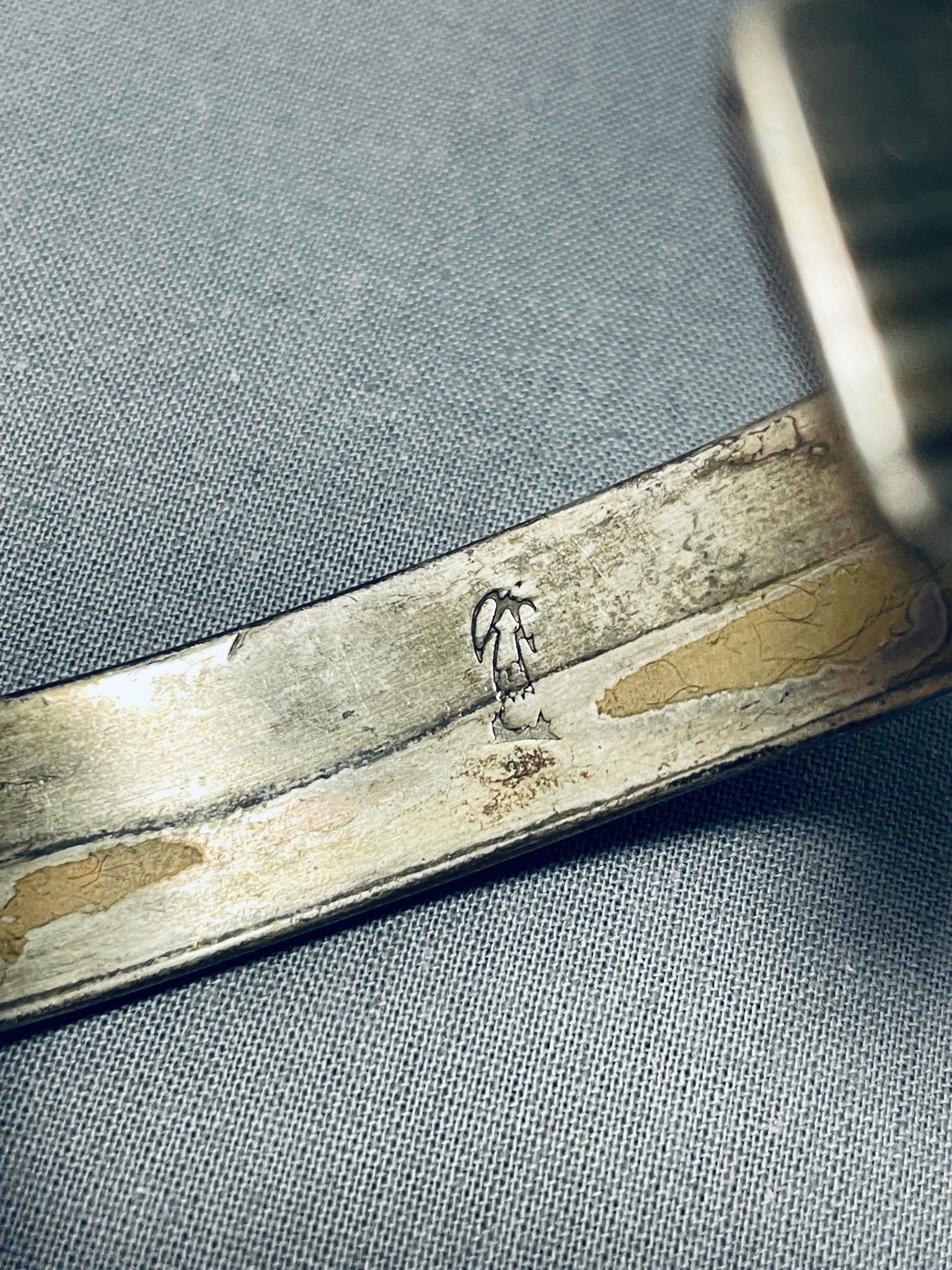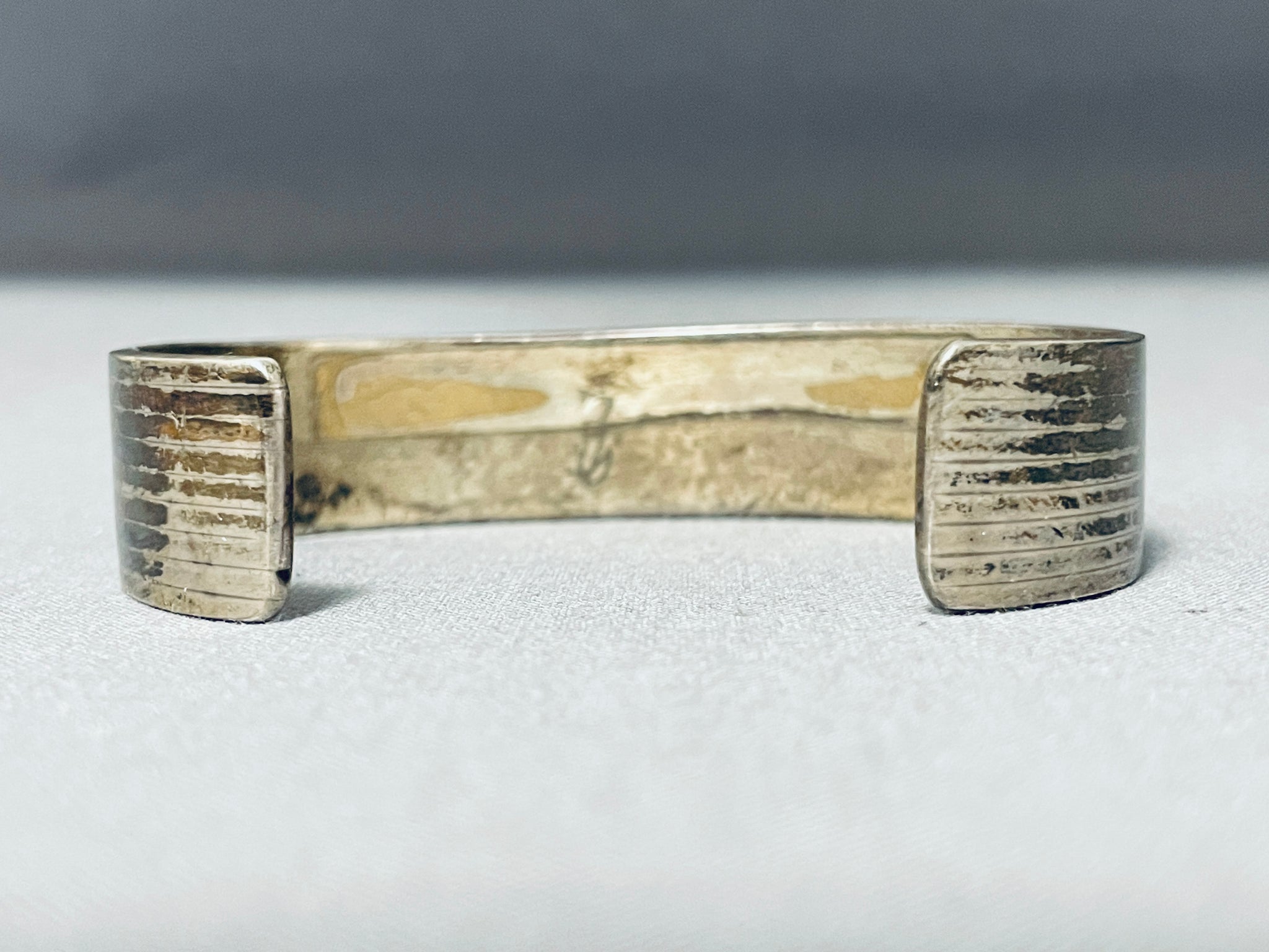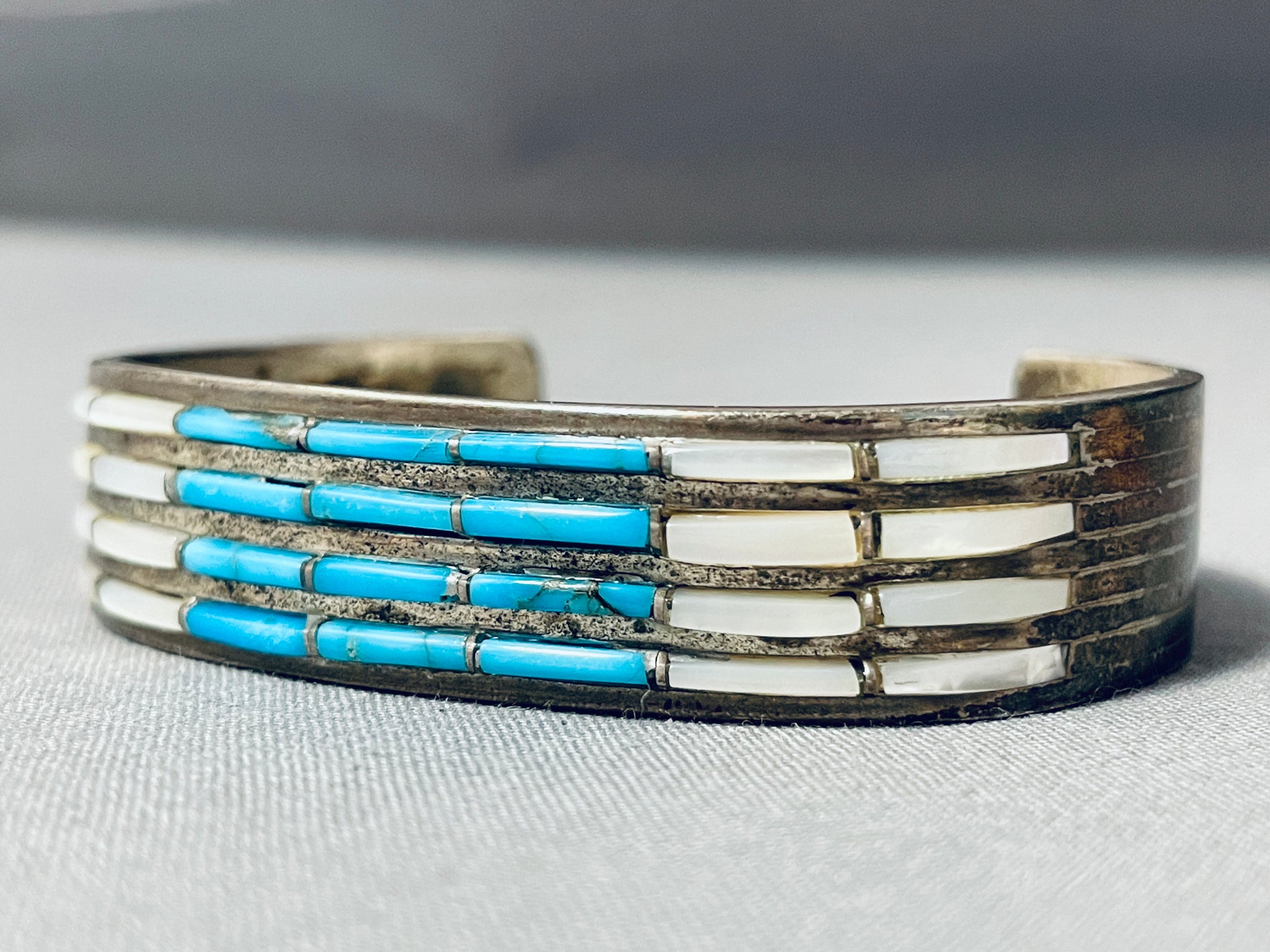 This is a breathtaking vintage Zuni inlaid silver cuff bracelet. This wonderful bracelet contains four rows of superior inlaid channel patterns. The stones and shells on this bracelet include Sleeping Beauty and mother of pearl. I absolutely love the intricacy and detailing this bracelet contains along with old natural patina. The bracelet is very thick and sturdy. The width of the bracelet measures around 1/2". Sterling silver. Cir. 1970's+. The inside end to end measures around 5-1/4" with an additional 1-1/4" gap. Sturdy 35 grams.