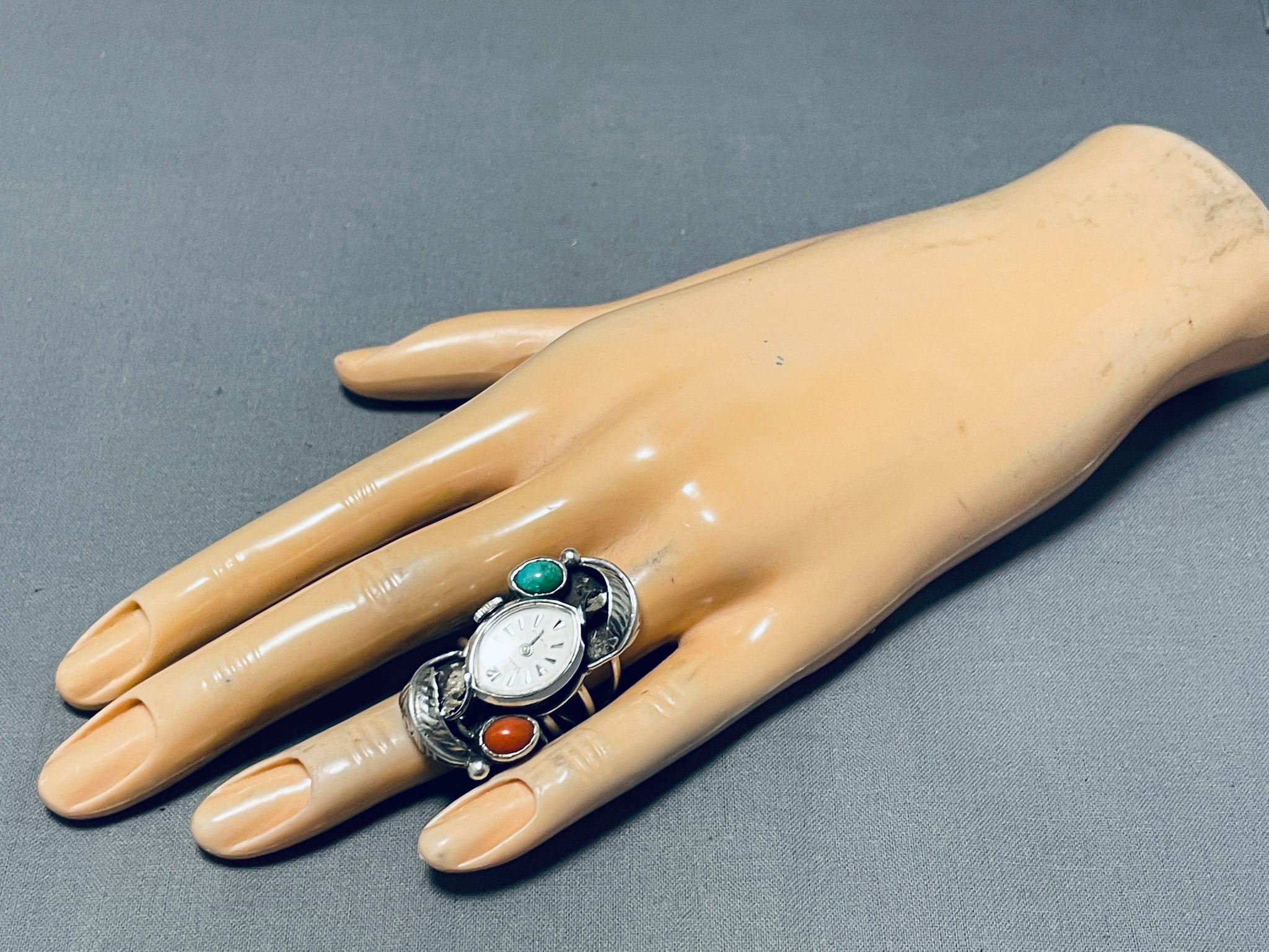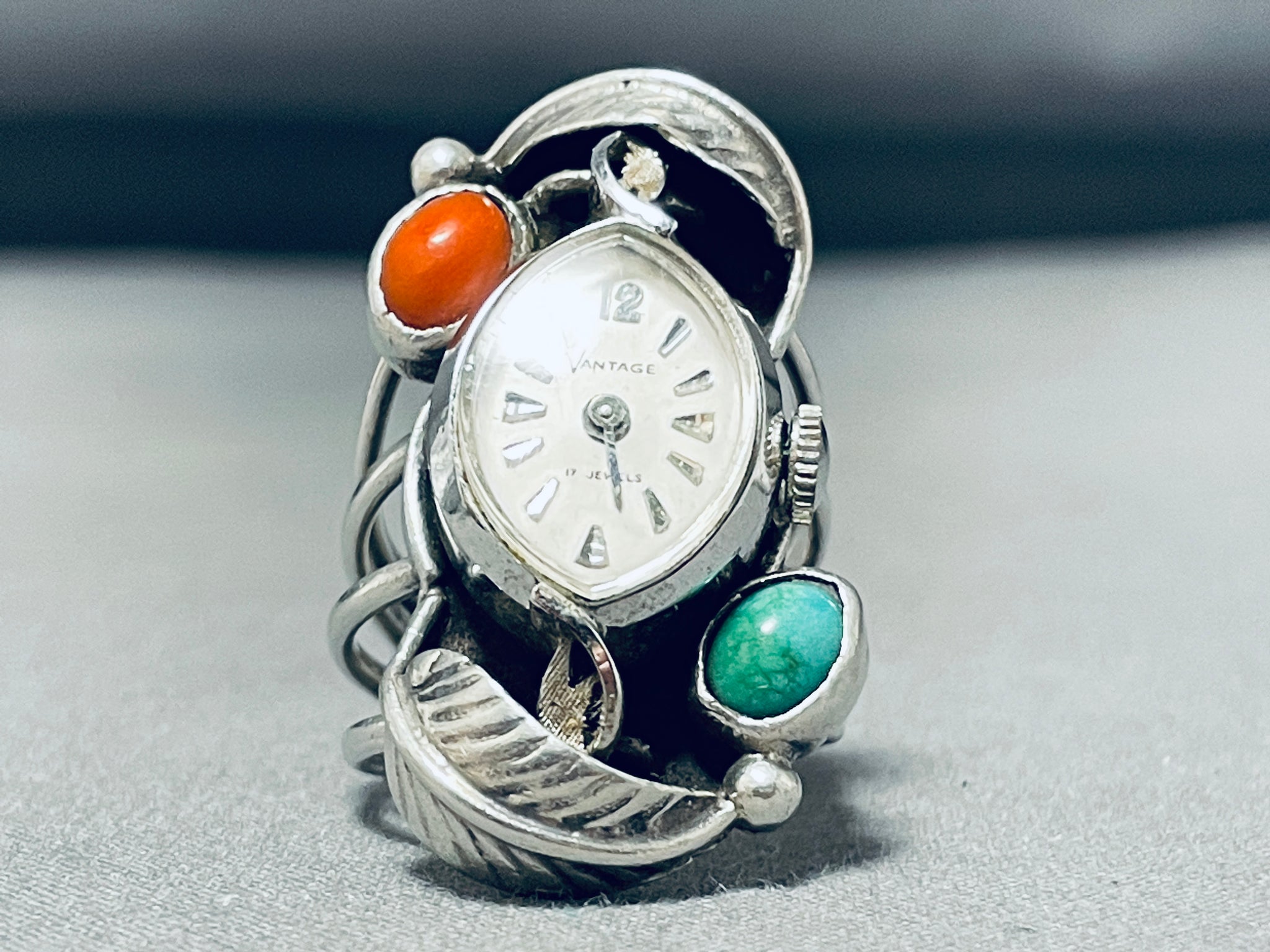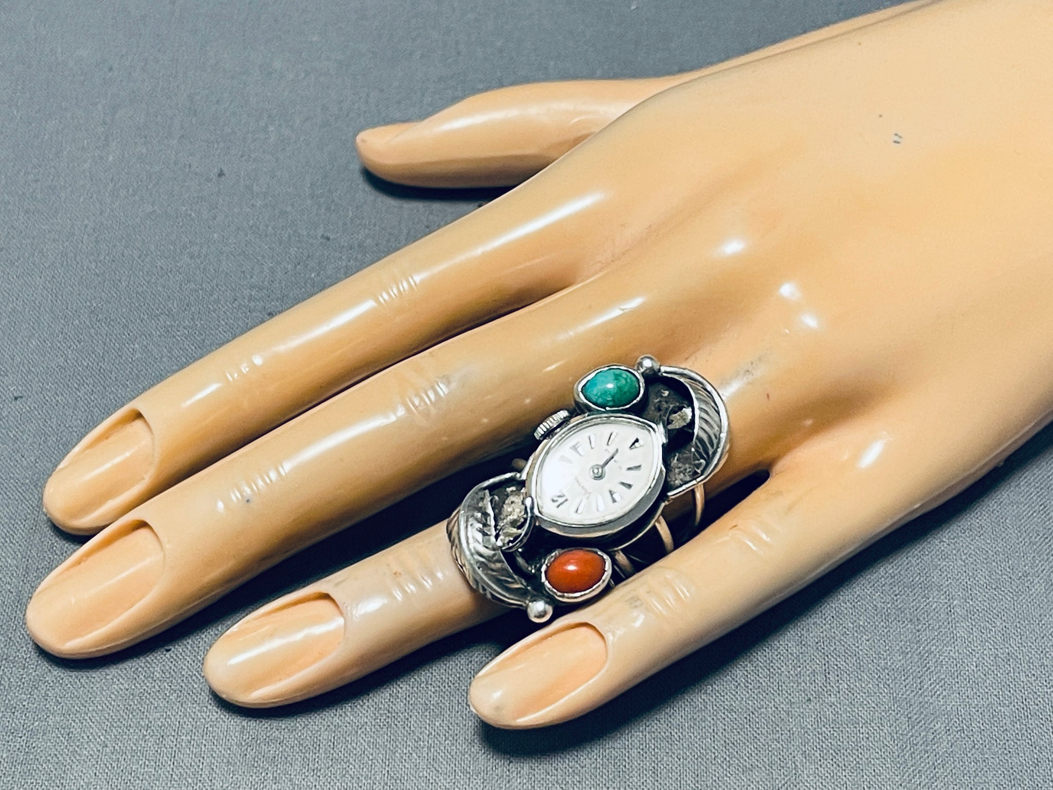 Native American Extremely Rare Watch Turquoise Coral Sterling Silver Ring