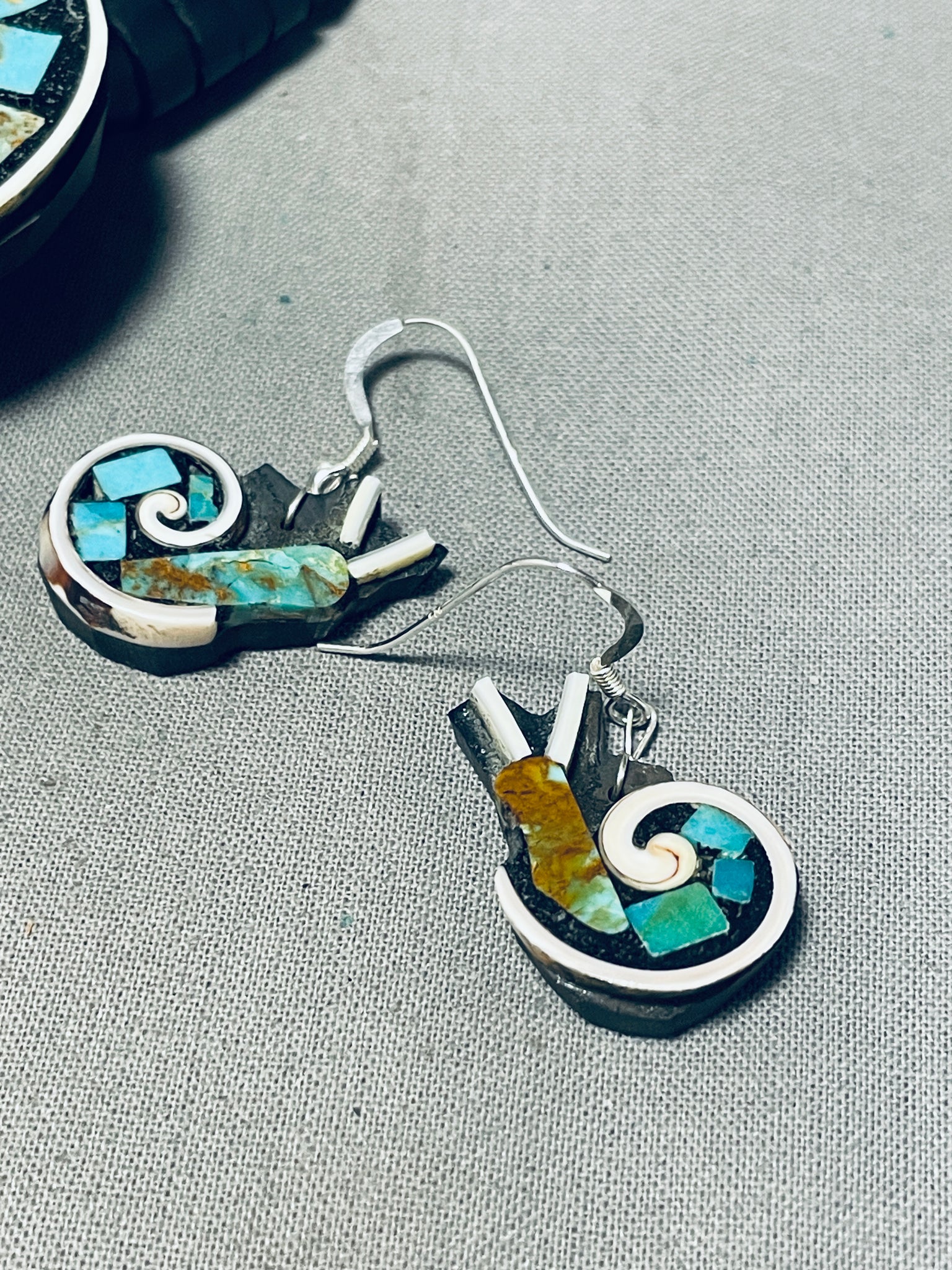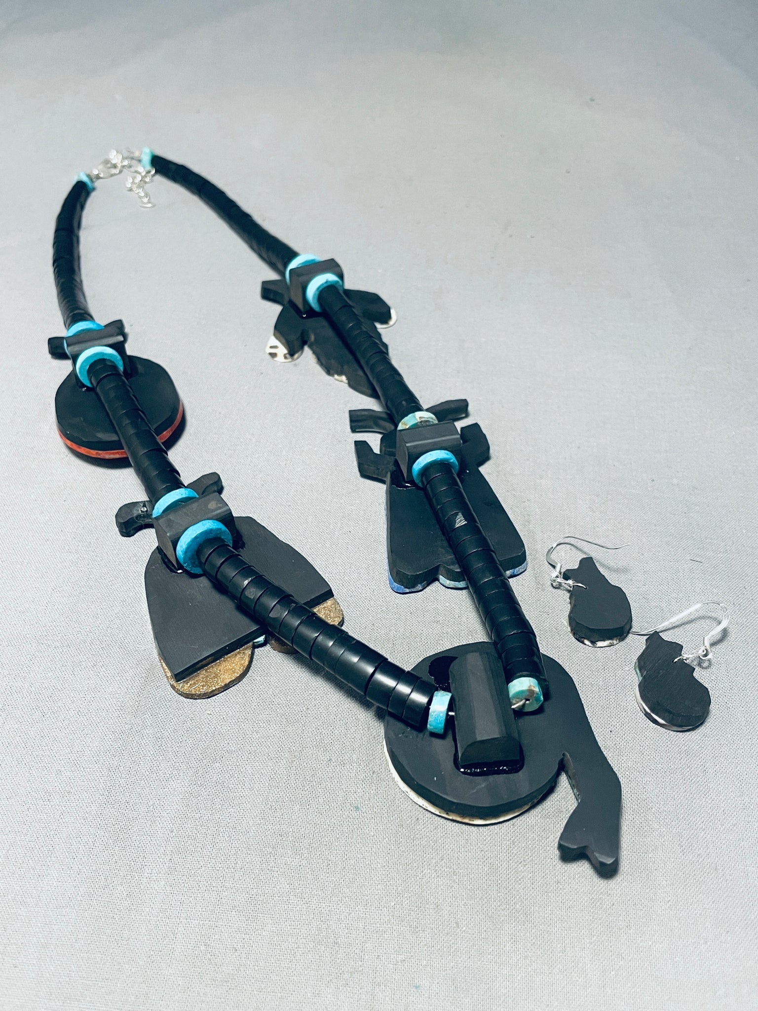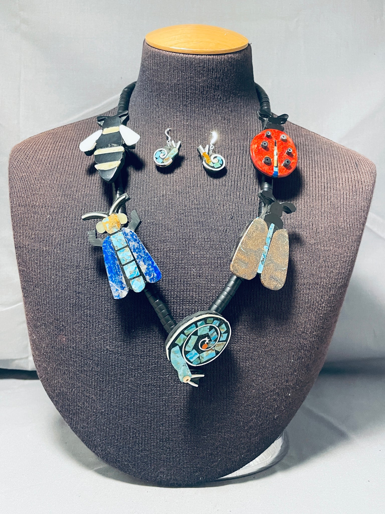 This is an astonishing vintage Santo Domingo inlaid bug necklace. This remarkable necklace contains 5 phenomenal large inlaid bugs that consist of a bee, ladybug, two flies and a bottom snail. The inlaid bugs are so impressive and unique that consist of gaspeite, mother of pearl, jet, lapis, Blue Gem turquoise, Royston turquoise, coral, and white stone. The bottom inlaid snail measures around 1-3/4" X 2-1/8". Resting throughout the entire necklace are graduating hand cut disc shaped jet stones with end turquoise stones. What I love about this necklace are the amazing matching pair of inlaid turquoise and jet snail earrings. Each earring measures around 7/8" X 1/2". Sterling silver. Handmade by Santo Domingo artist, Warren Nieto. The length of the necklace measures around 23". Sturdy 111 grams.