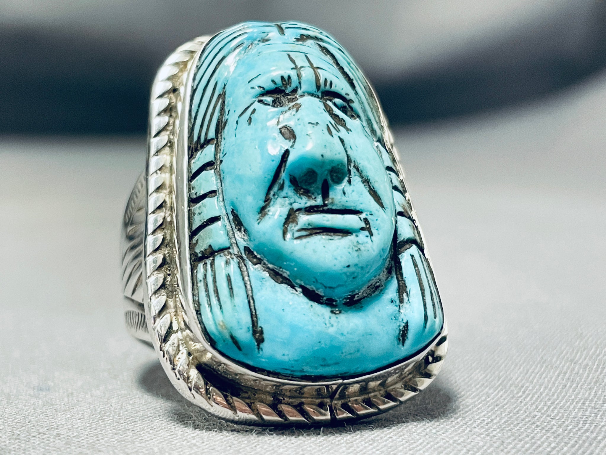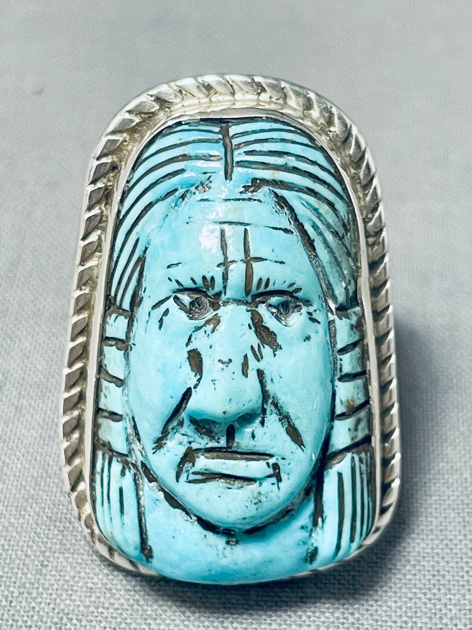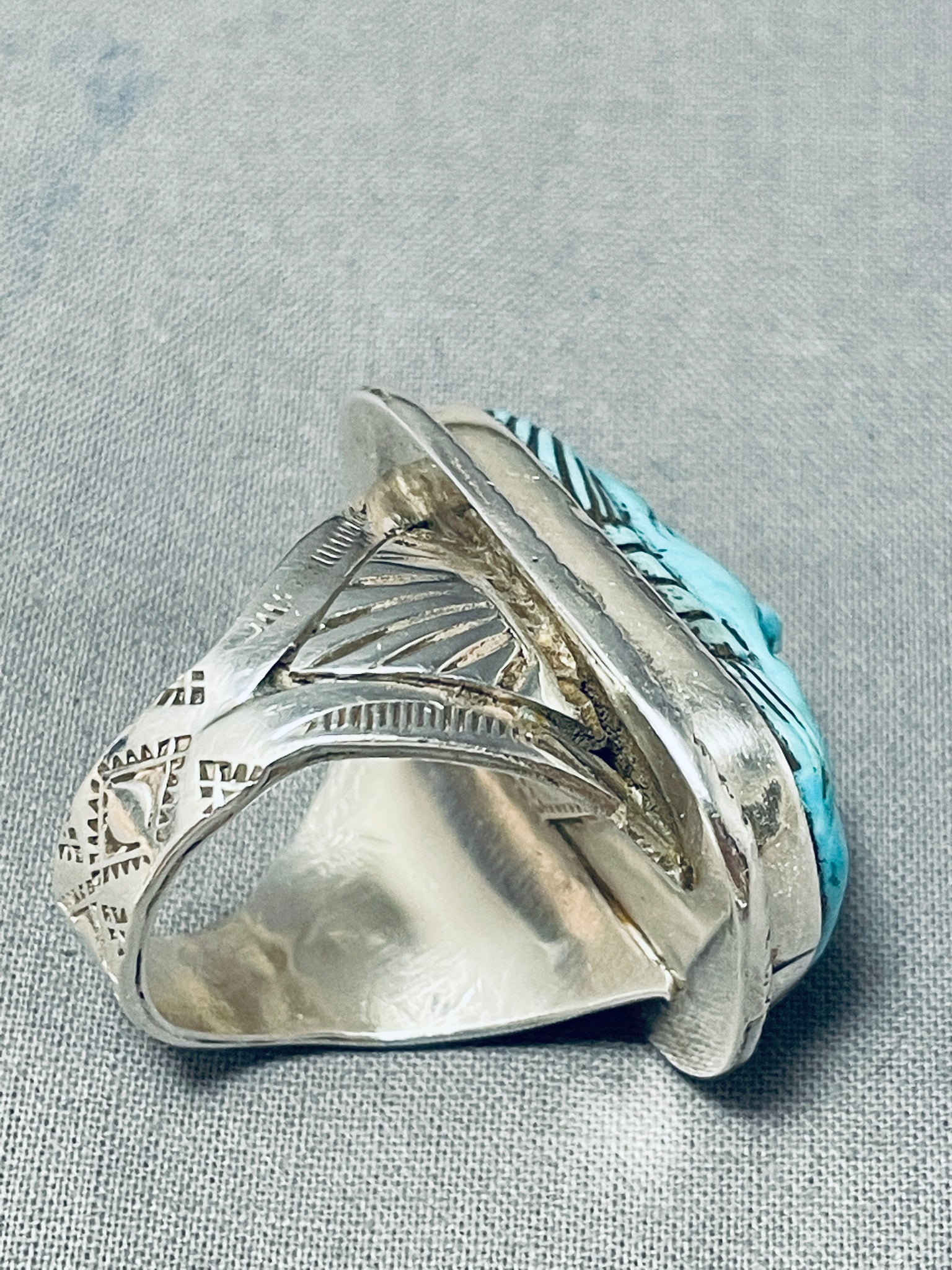 Native American Hand Carved Important Turquoise Sterling Silver Ring