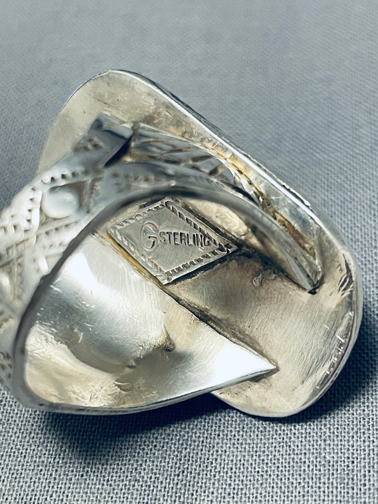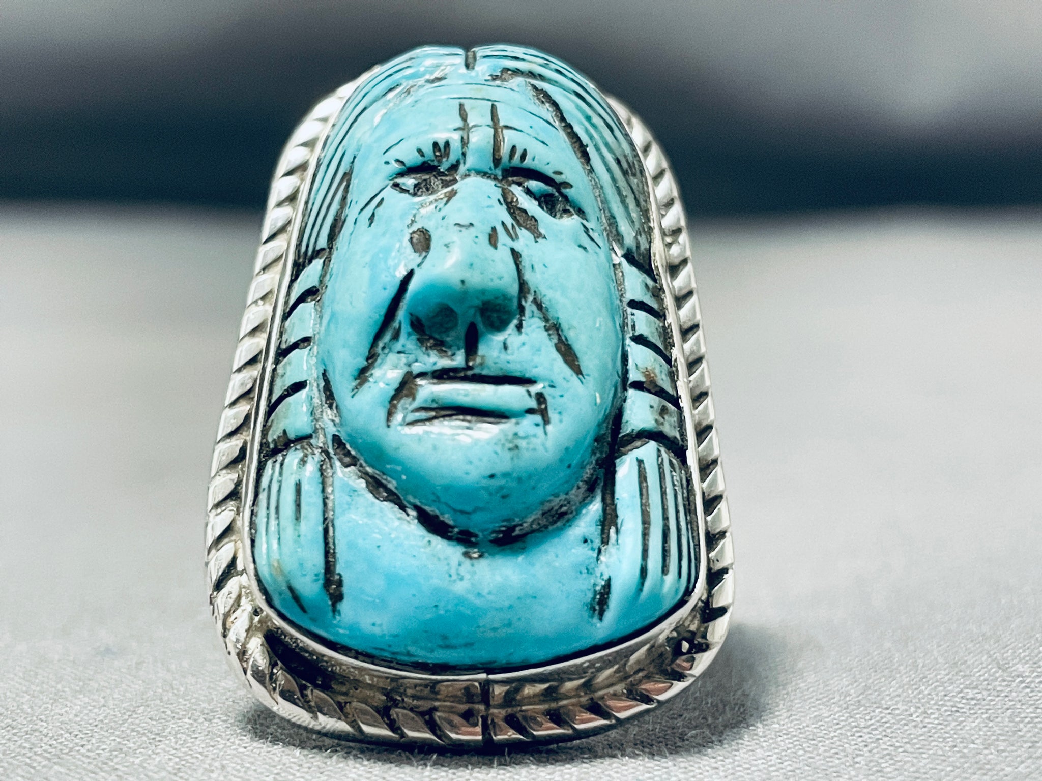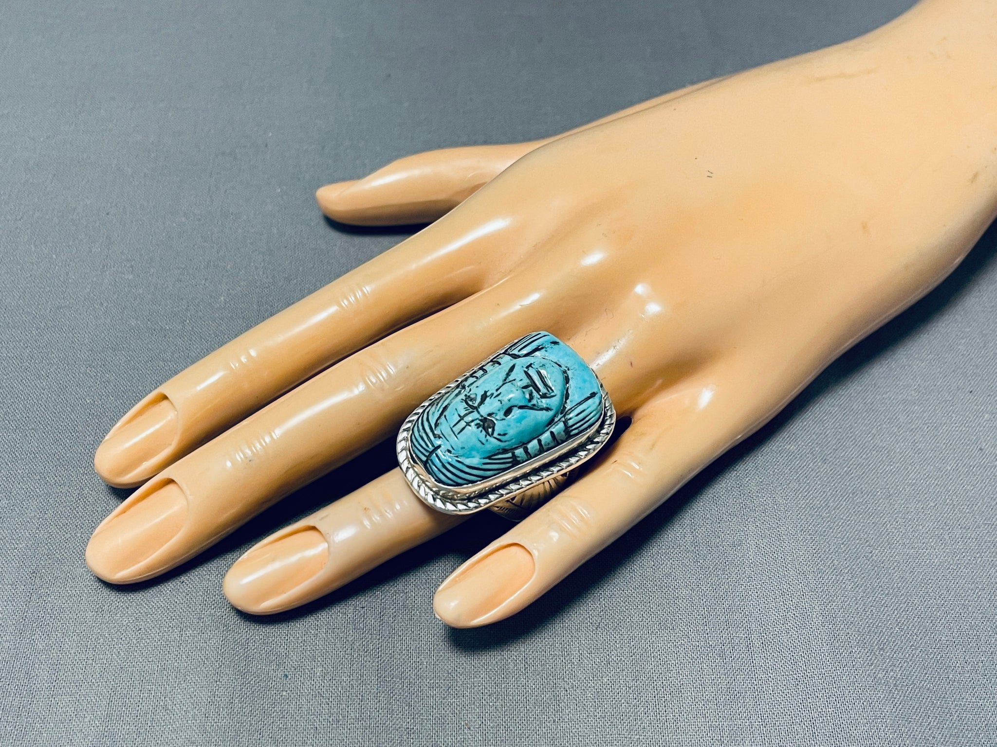 Native American Hand Carved Important Turquoise Sterling Silver Ring