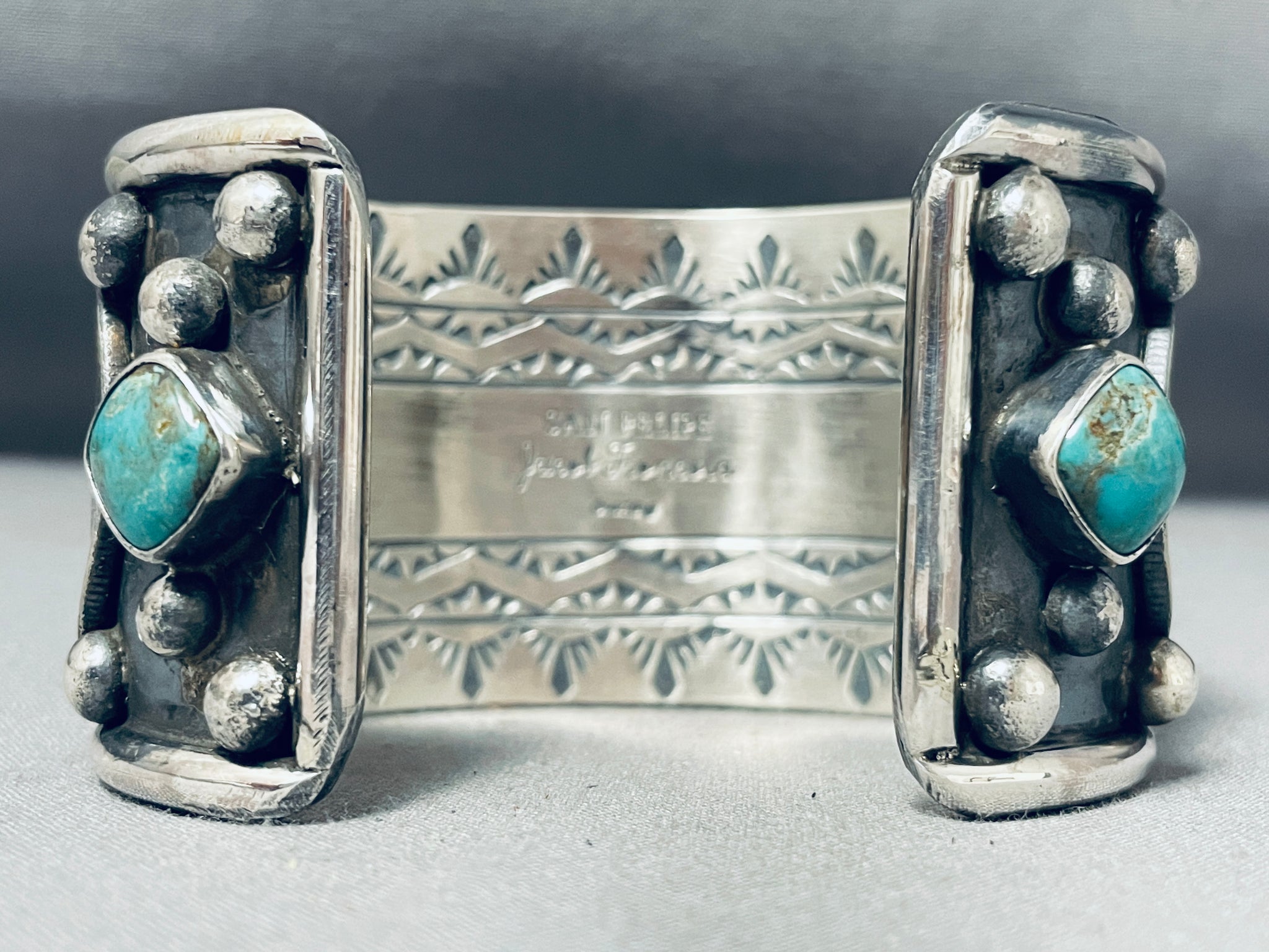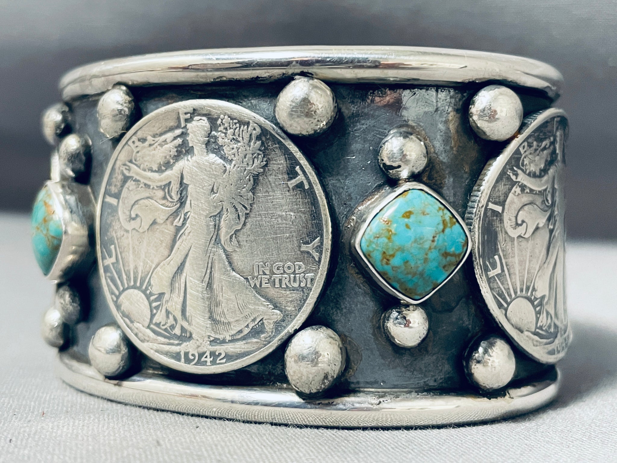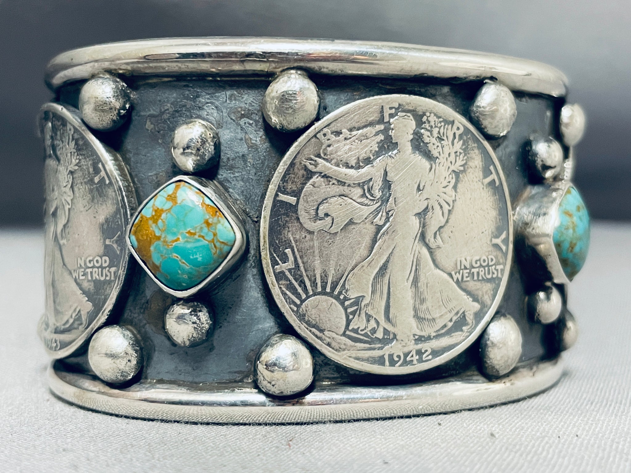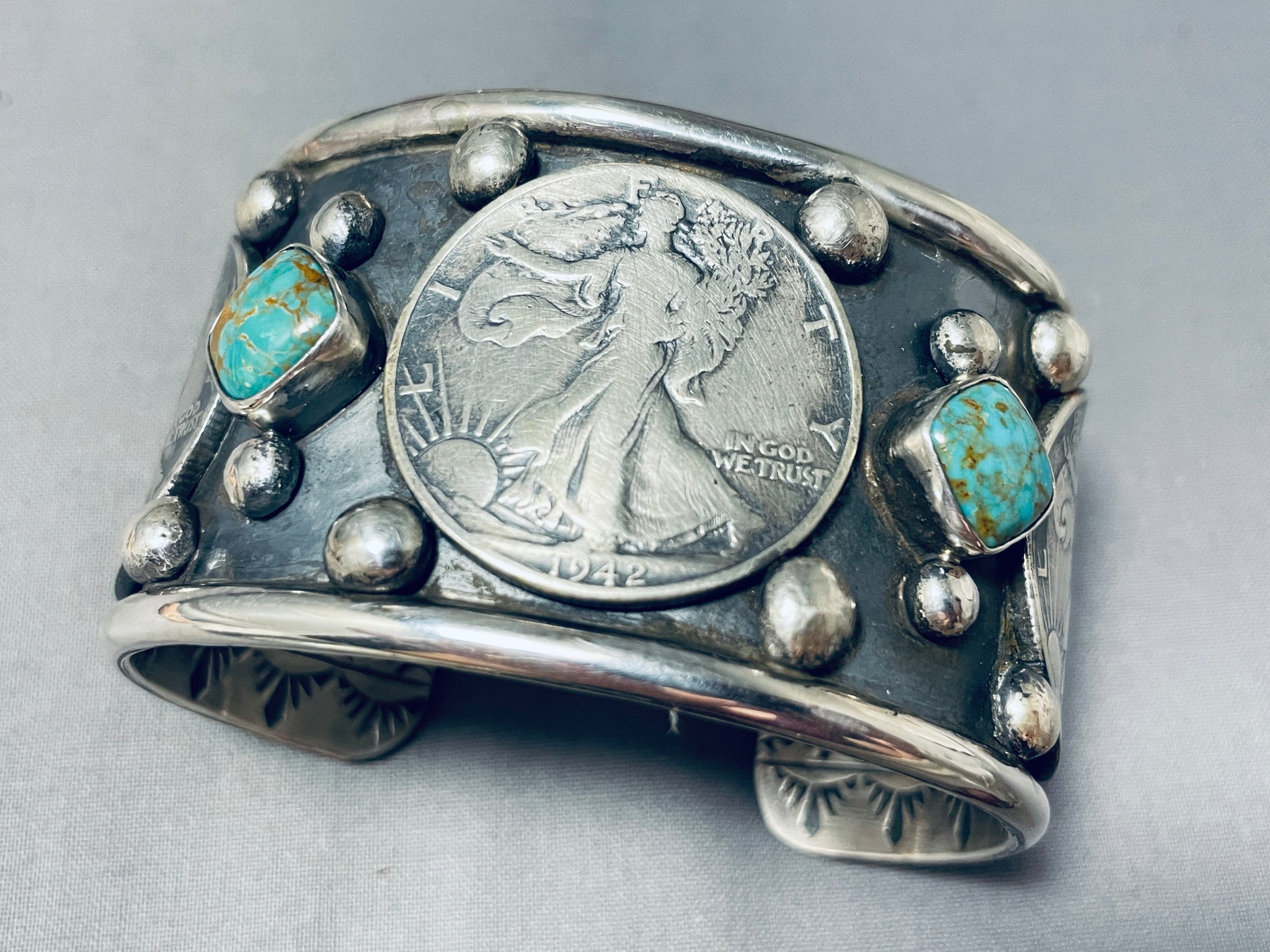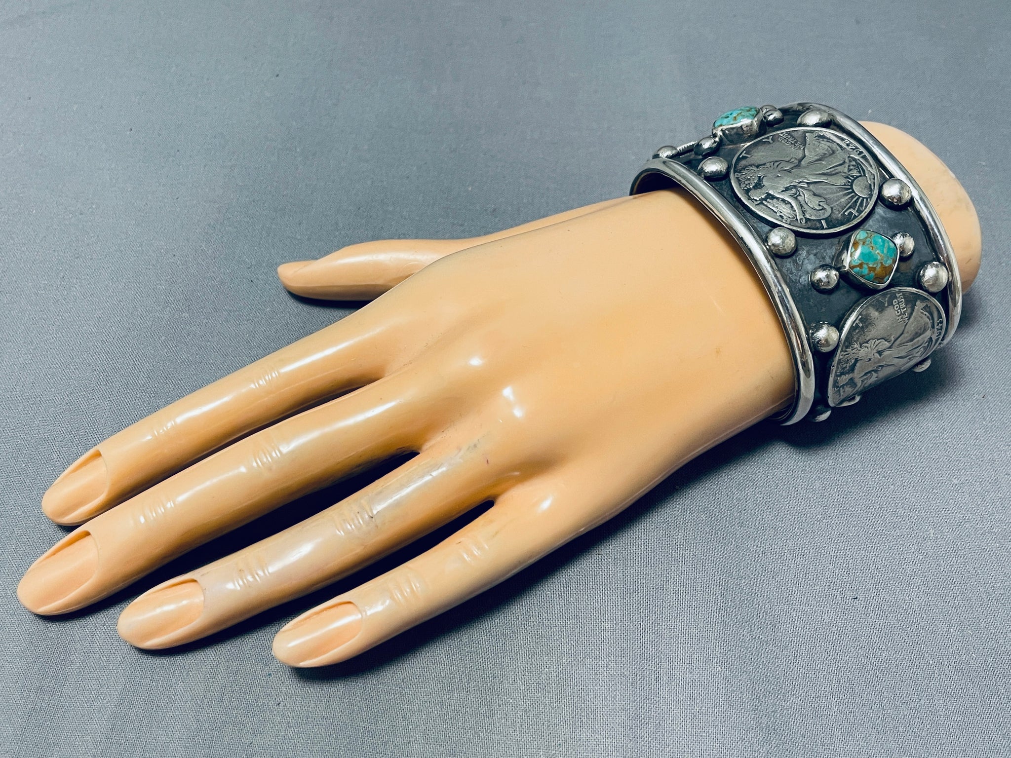 Native American Heavy Coin Navajo Turquoise Sterling Silver Bracelet Cuff