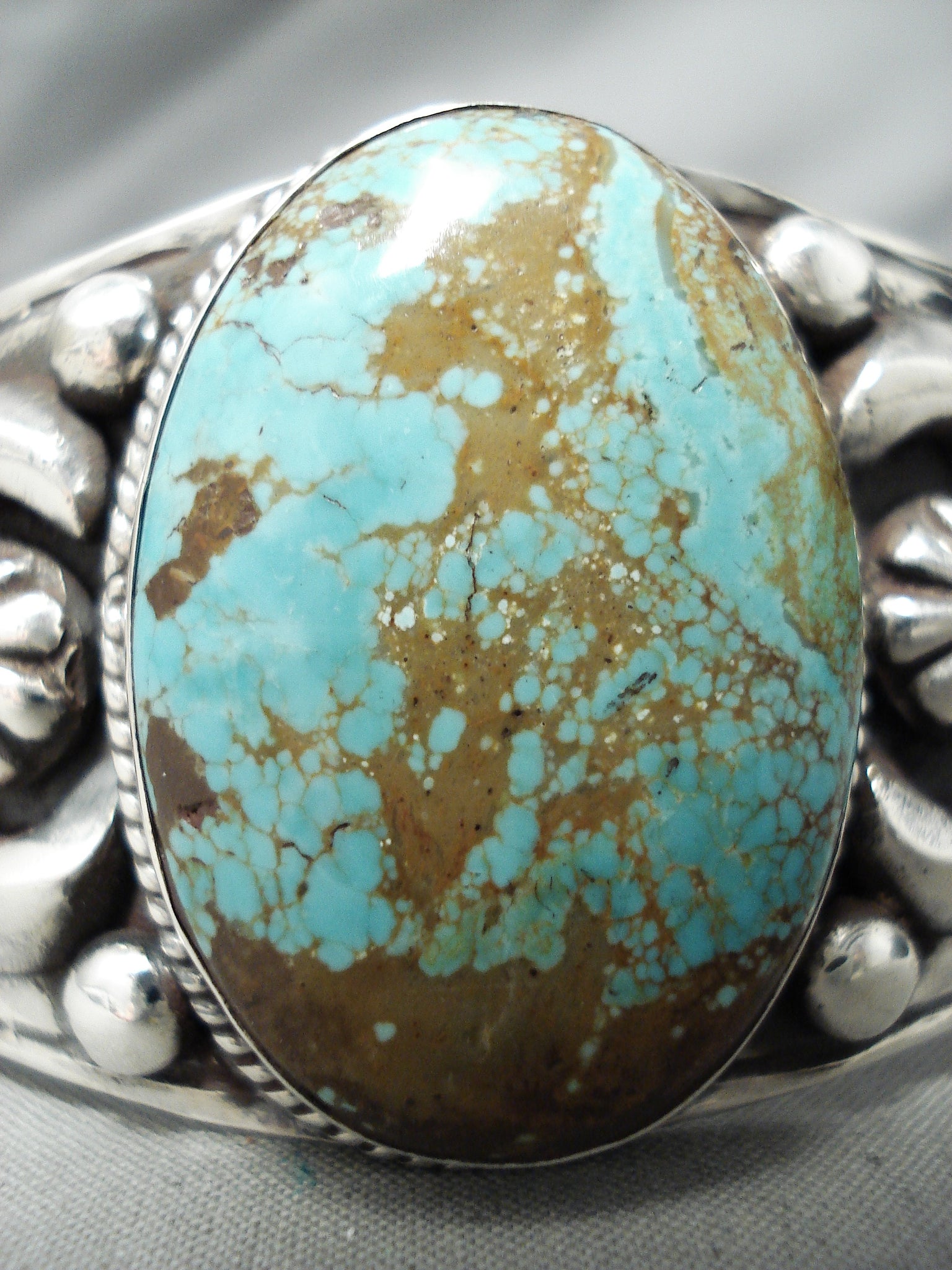 Native American Heavy Hand Repoussed Sterling Silver #8 Turquoise Bracelet