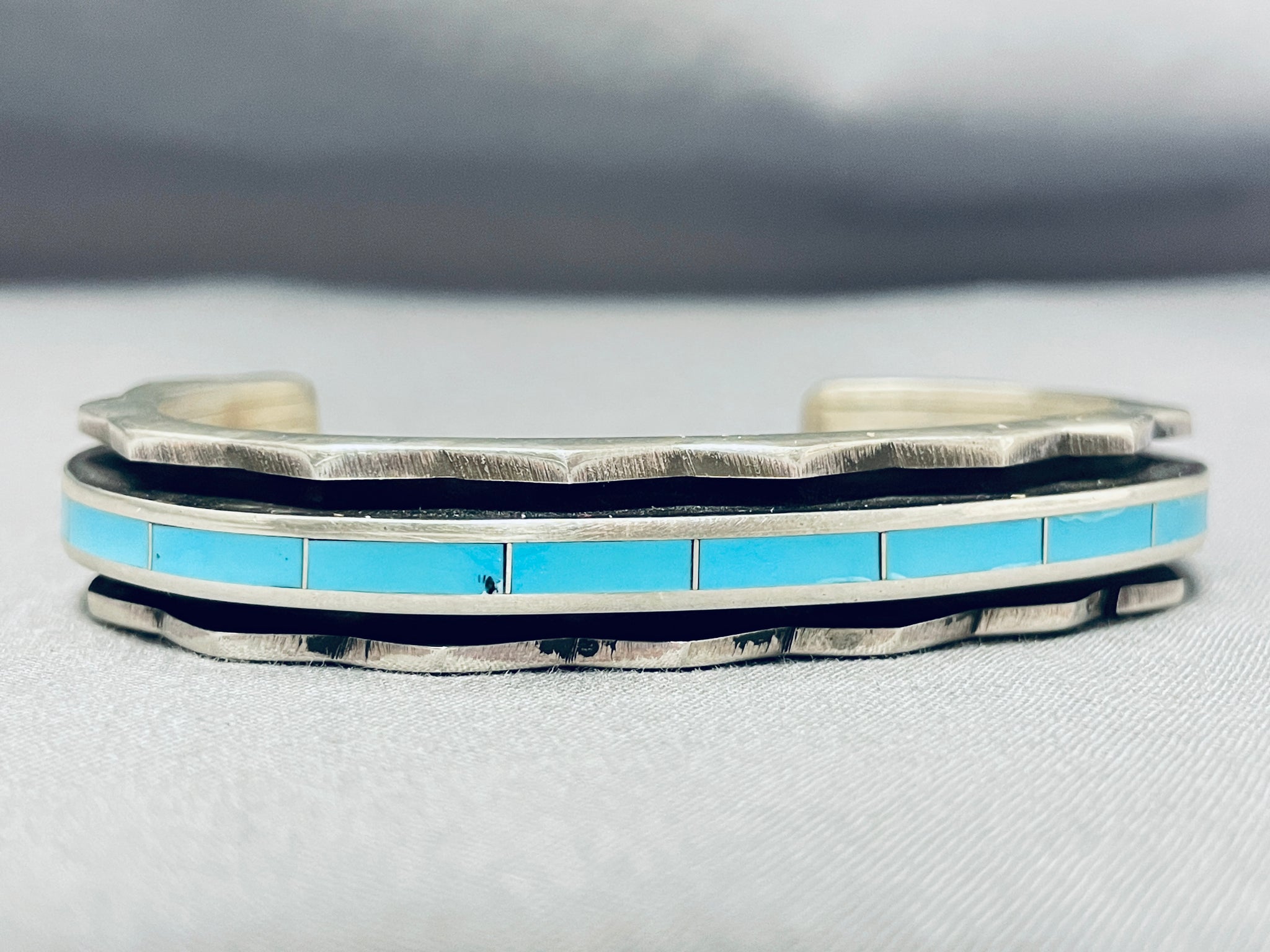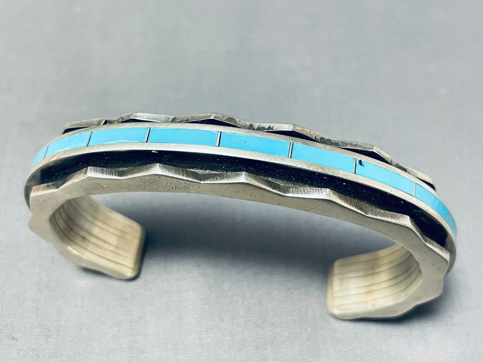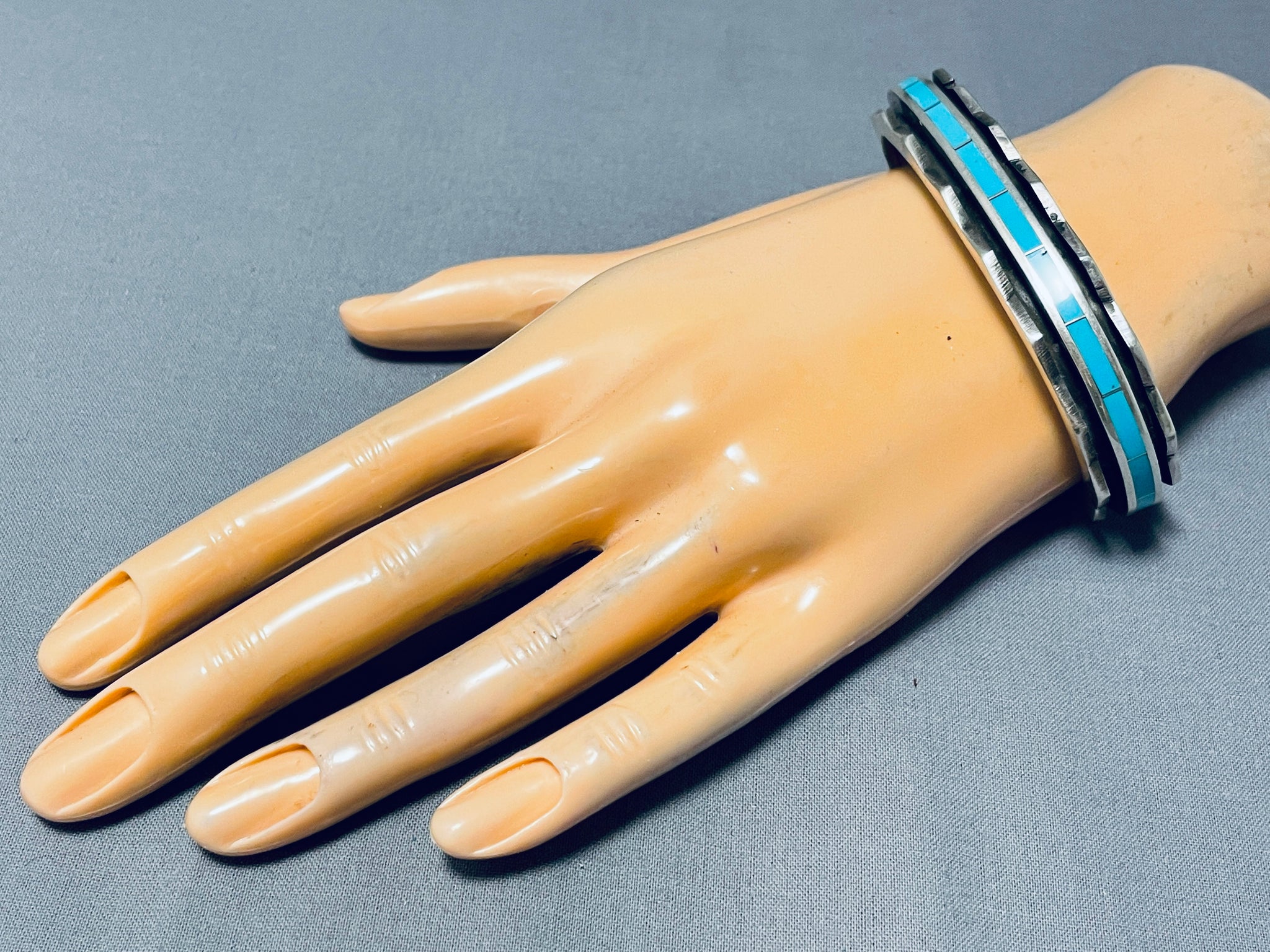 Native American Heavy Unique Inlay Vintage Zuni Turquoise Sterling Silver Bracelet