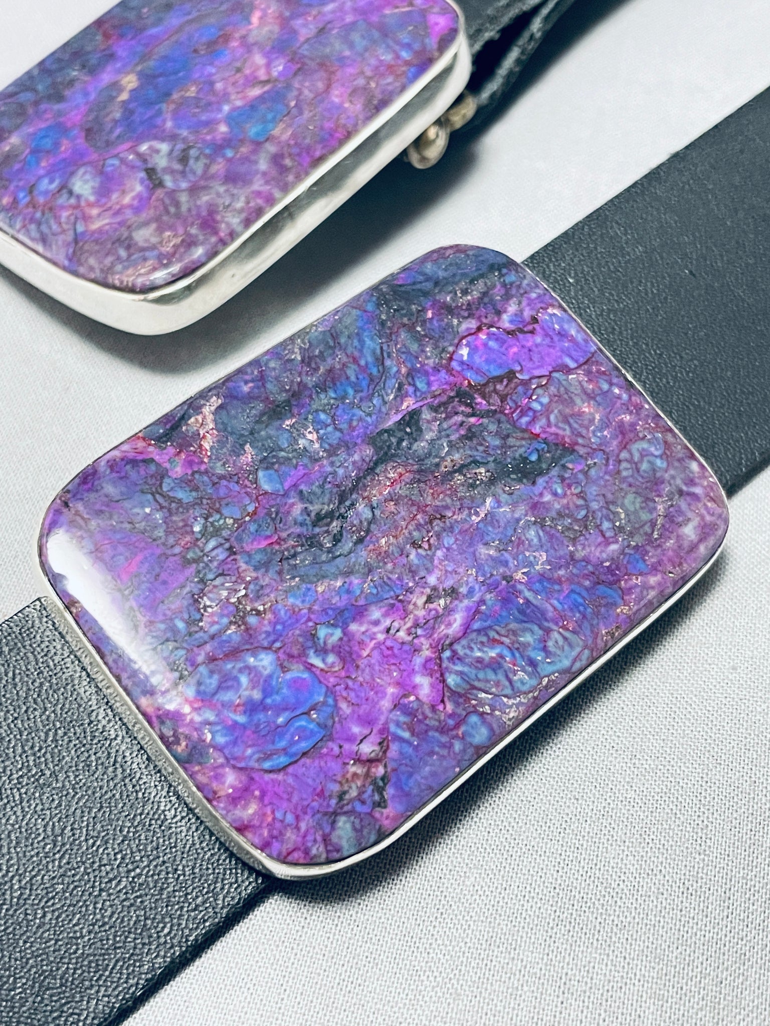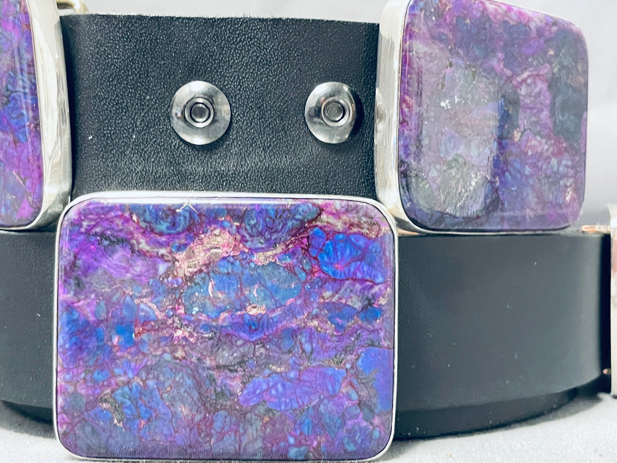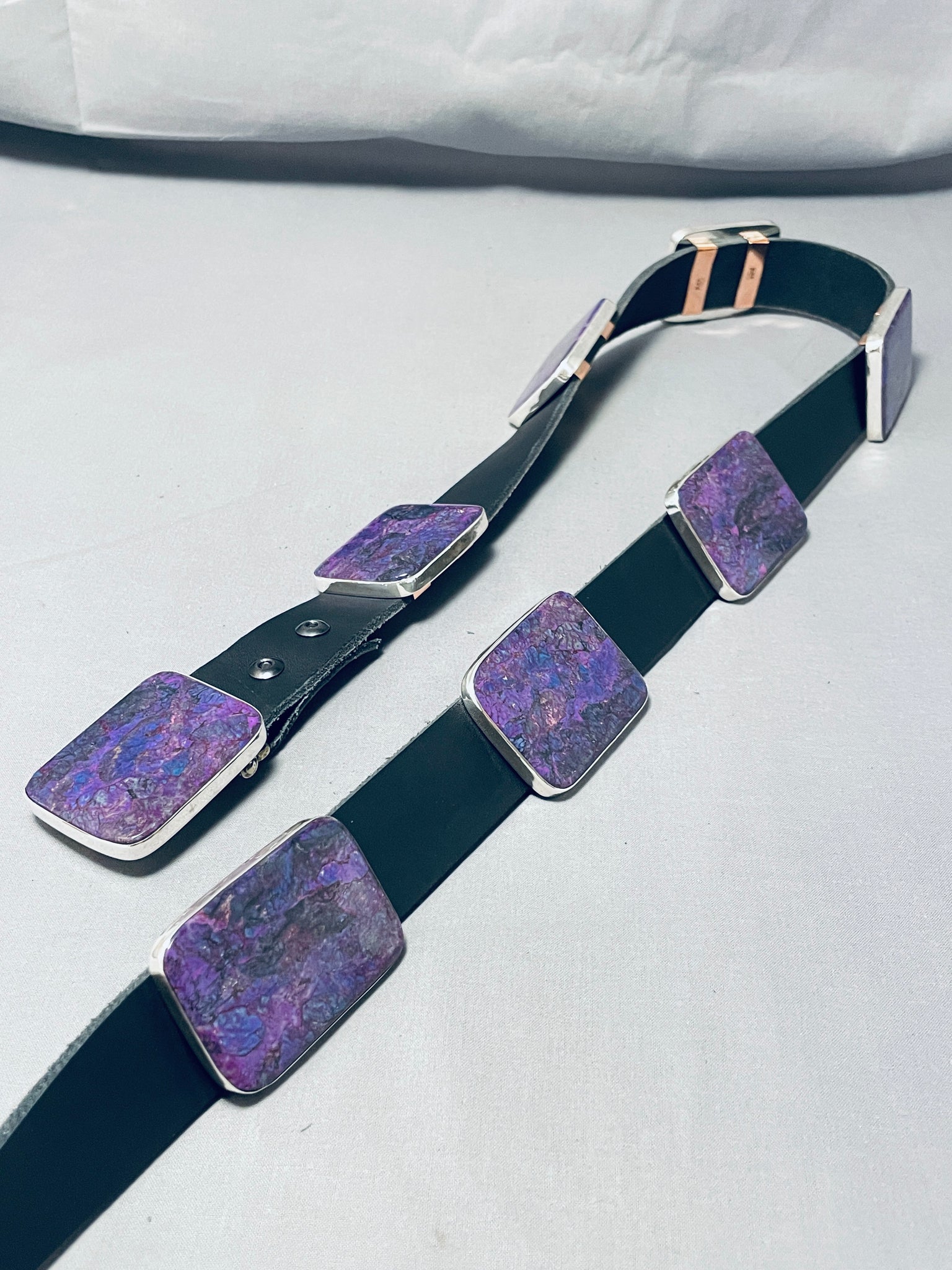 This is an impressive Santo Domingo very large and thick silver concho belt. This remarkable belt contains 7 outstanding large thick rectangular shaped silver conchos that each consist of a marvelous large sugulite stone. The buckle of the belt matches the rest of the conchos and contains another large sugulite stone. The coloration of the stone is absolutely incredible and so very beautiful. Each concho and buckle measures around 2-1/4" X 1-3/4". Located on the back of the conchos are wonderful copper links. The total length of this belt measures around 69" long. The stones measure around 2-1/8" x 1-5/8". Signed by artist, Kevin Coriz Kewa. Sterling silver. Cir. 1980's+. Sturdy 605 grams.