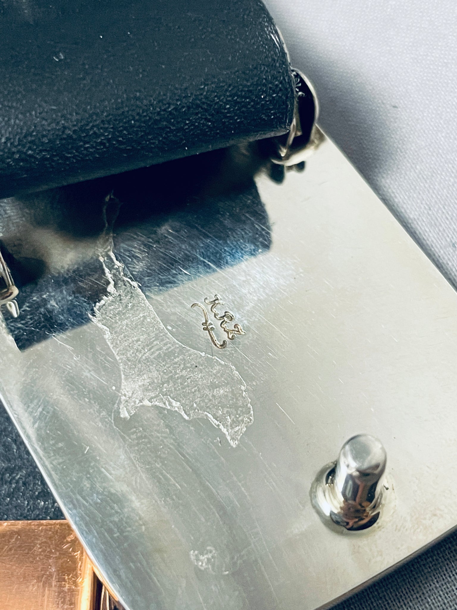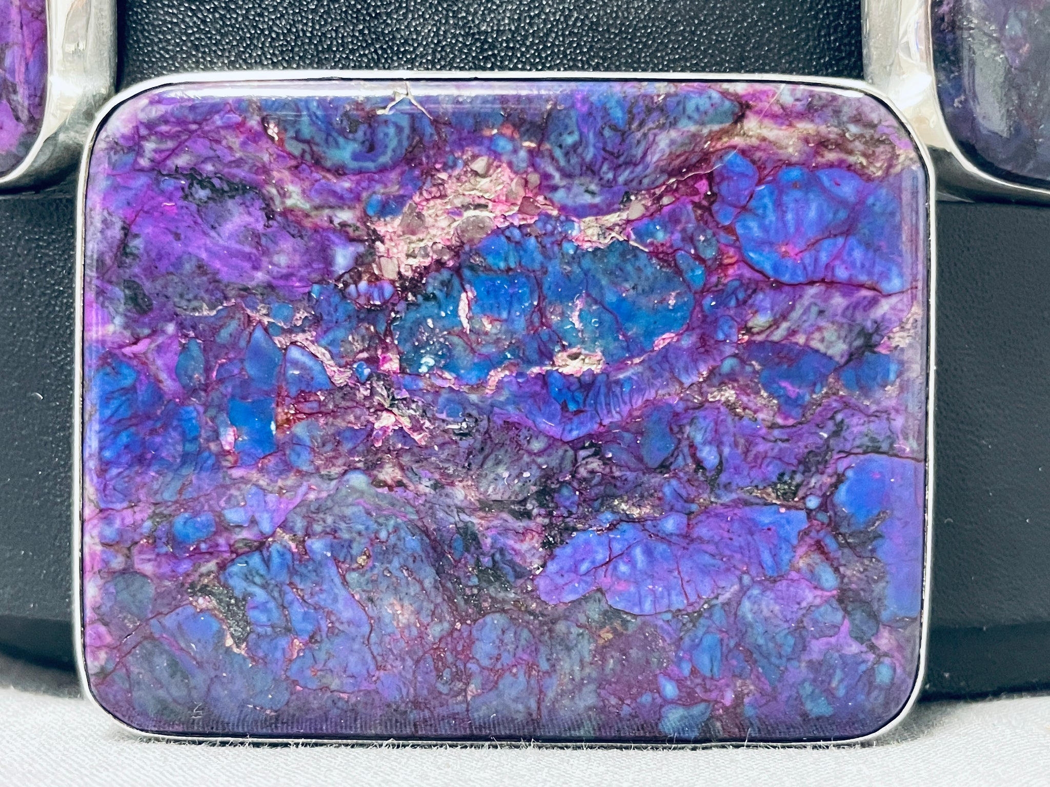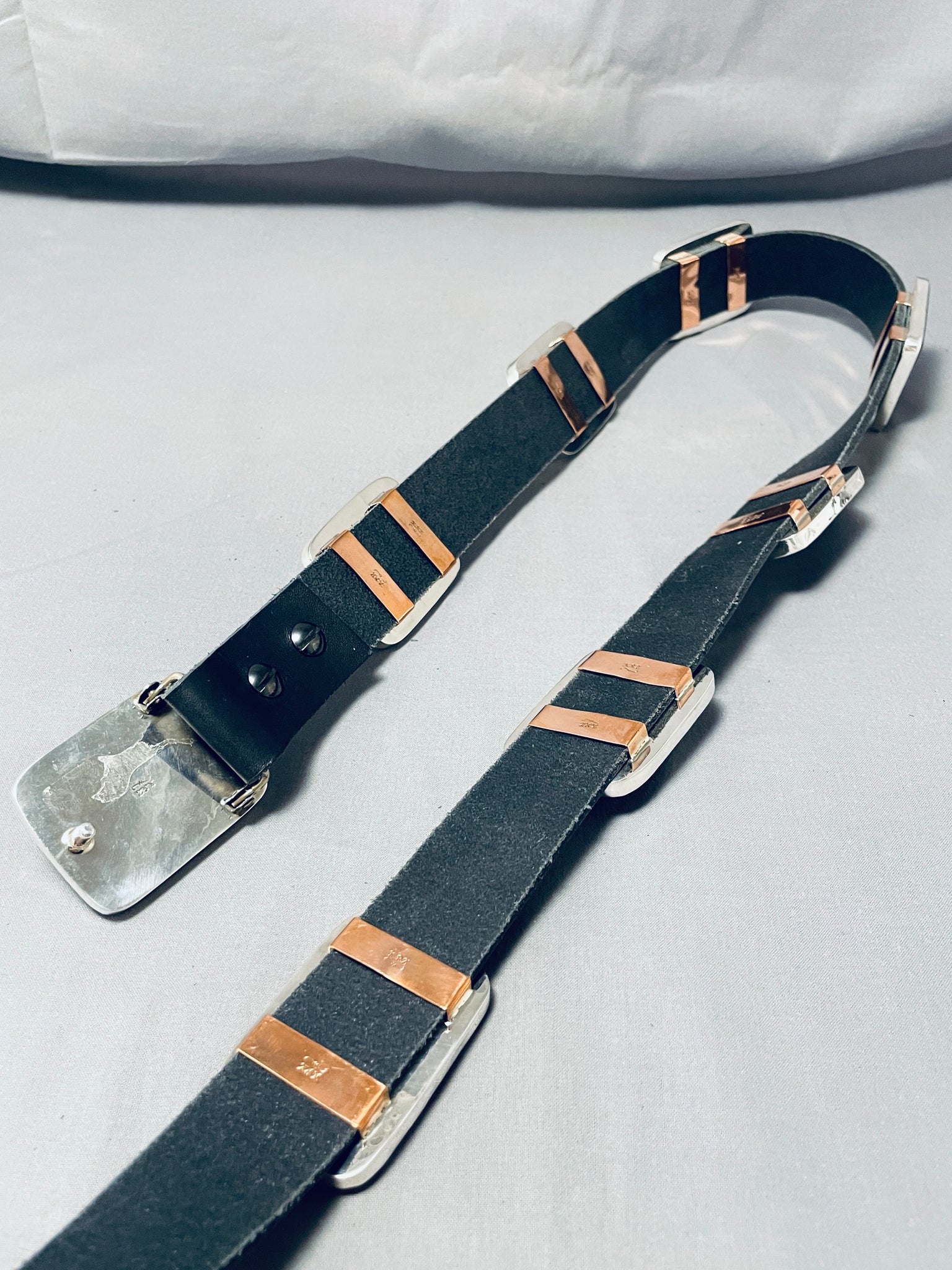 This is an impressive Santo Domingo very large and thick silver concho belt. This remarkable belt contains 7 outstanding large thick rectangular shaped silver conchos that each consist of a marvelous large sugulite stone. The buckle of the belt matches the rest of the conchos and contains another large sugulite stone. The coloration of the stone is absolutely incredible and so very beautiful. Each concho and buckle measures around 2-1/4" X 1-3/4". Located on the back of the conchos are wonderful copper links. The total length of this belt measures around 69" long. The stones measure around 2-1/8" x 1-5/8". Signed by artist, Kevin Coriz Kewa. Sterling silver. Cir. 1980's+. Sturdy 605 grams.