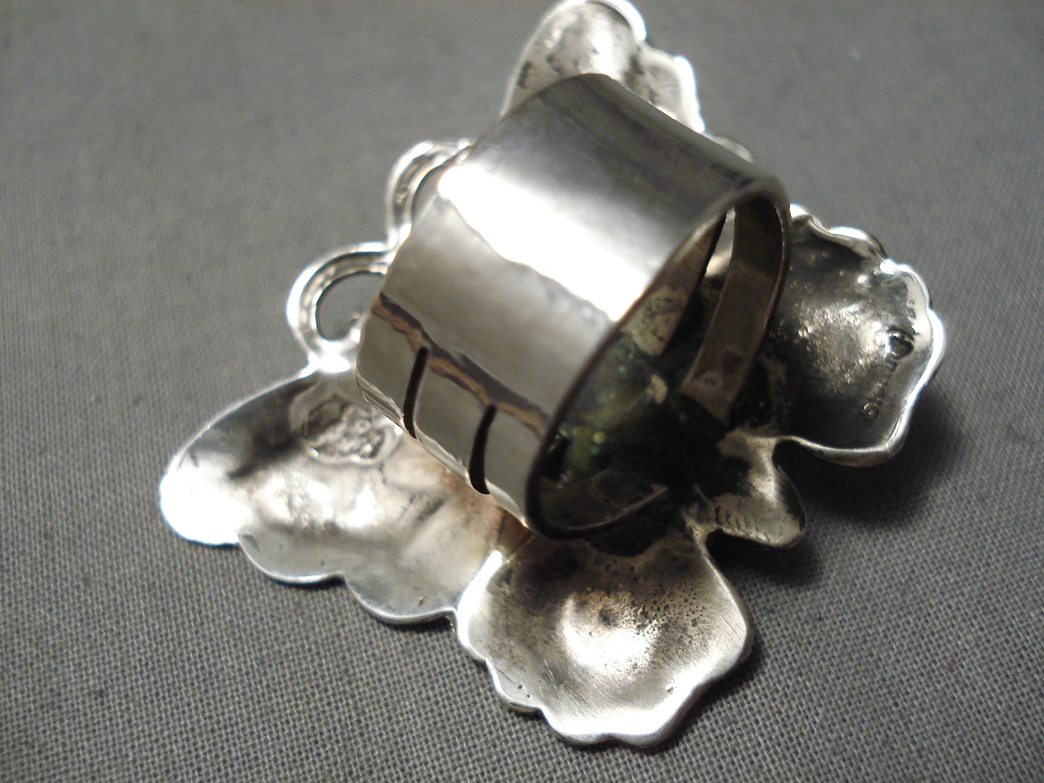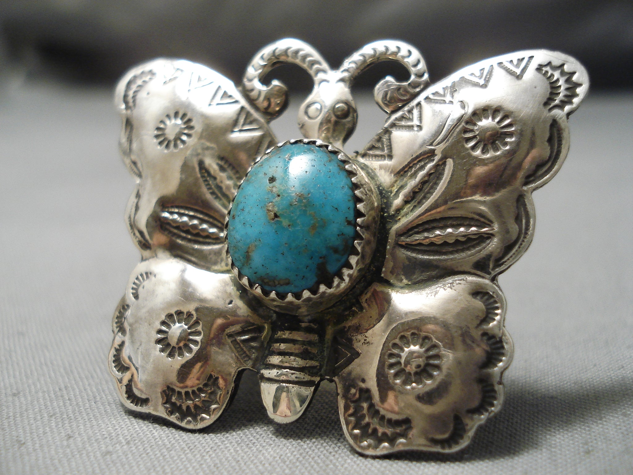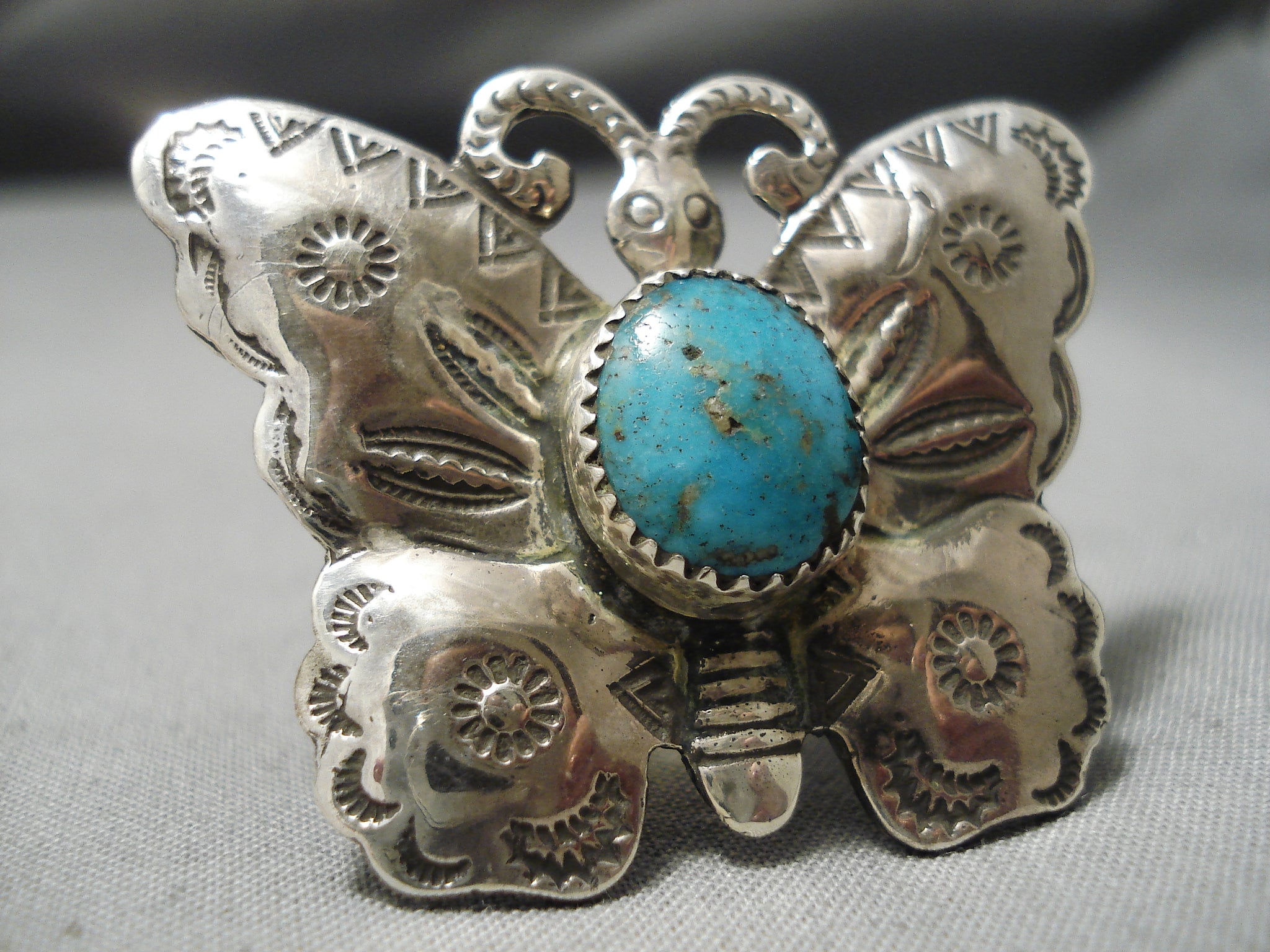 Native American Huge Butterfly Love Vintage Navajo Turquoise Sterling Silver Ring Old