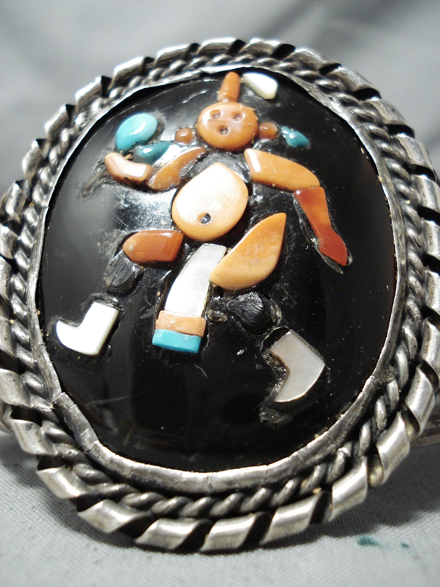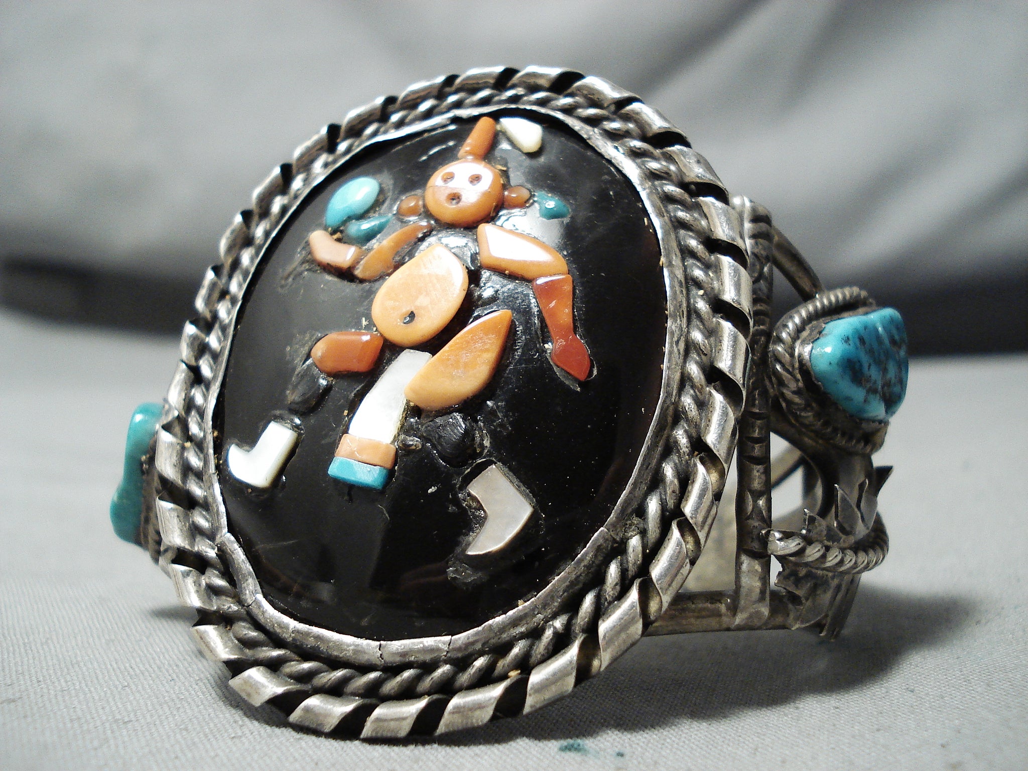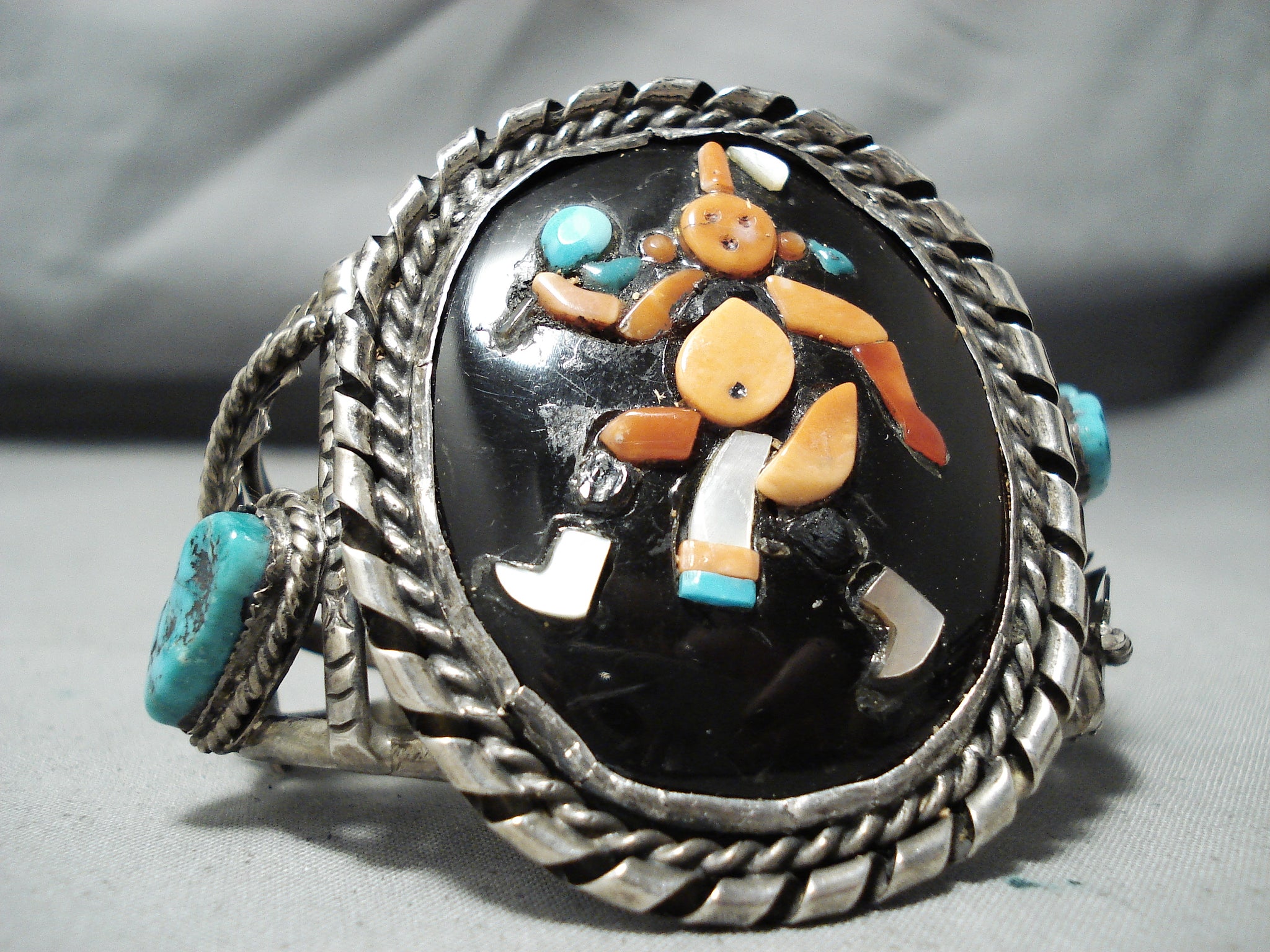 Native American Huge Dancing Mudhead Vintage Zuni Turquoise Sterling Silver Bracelet