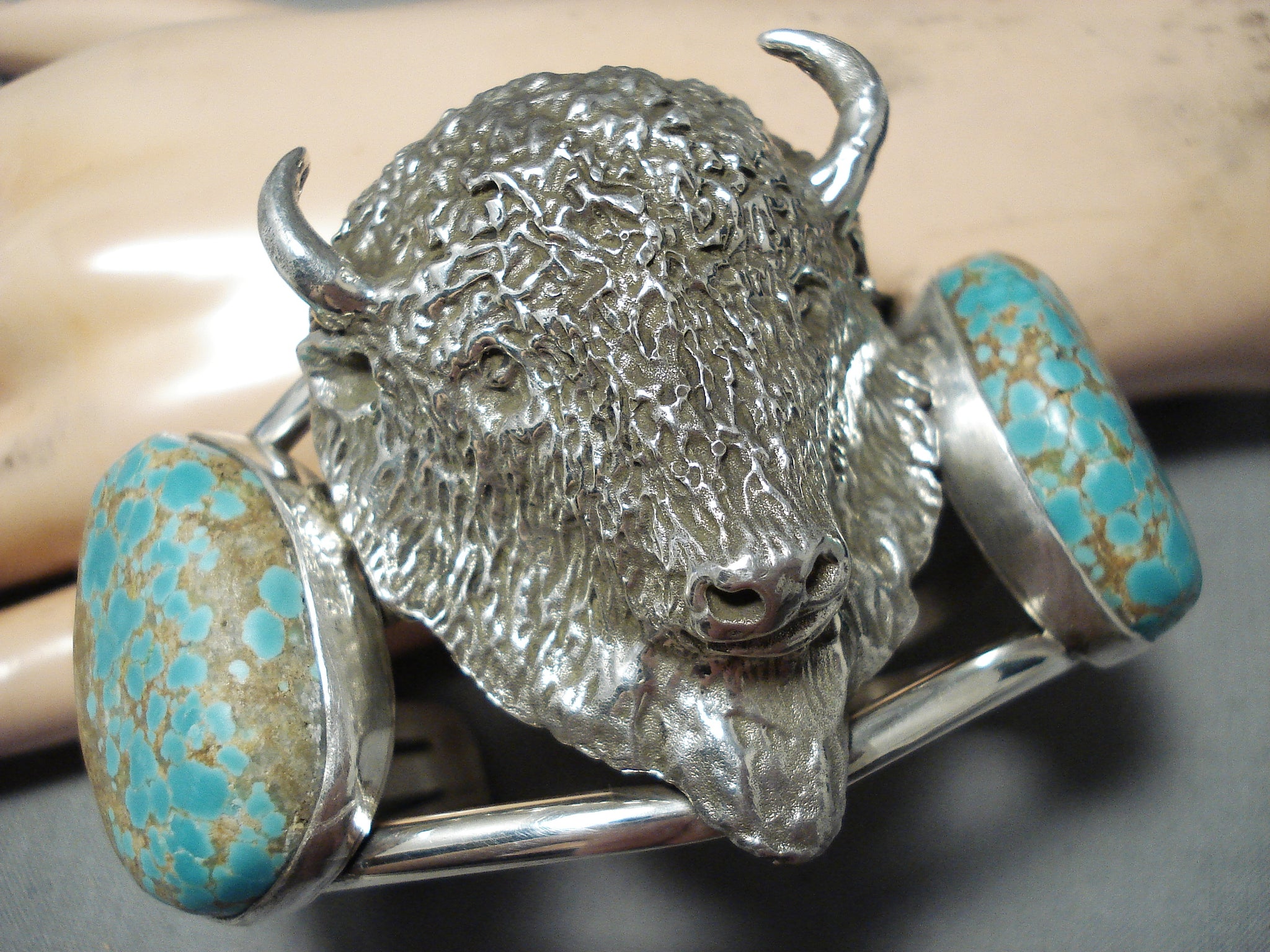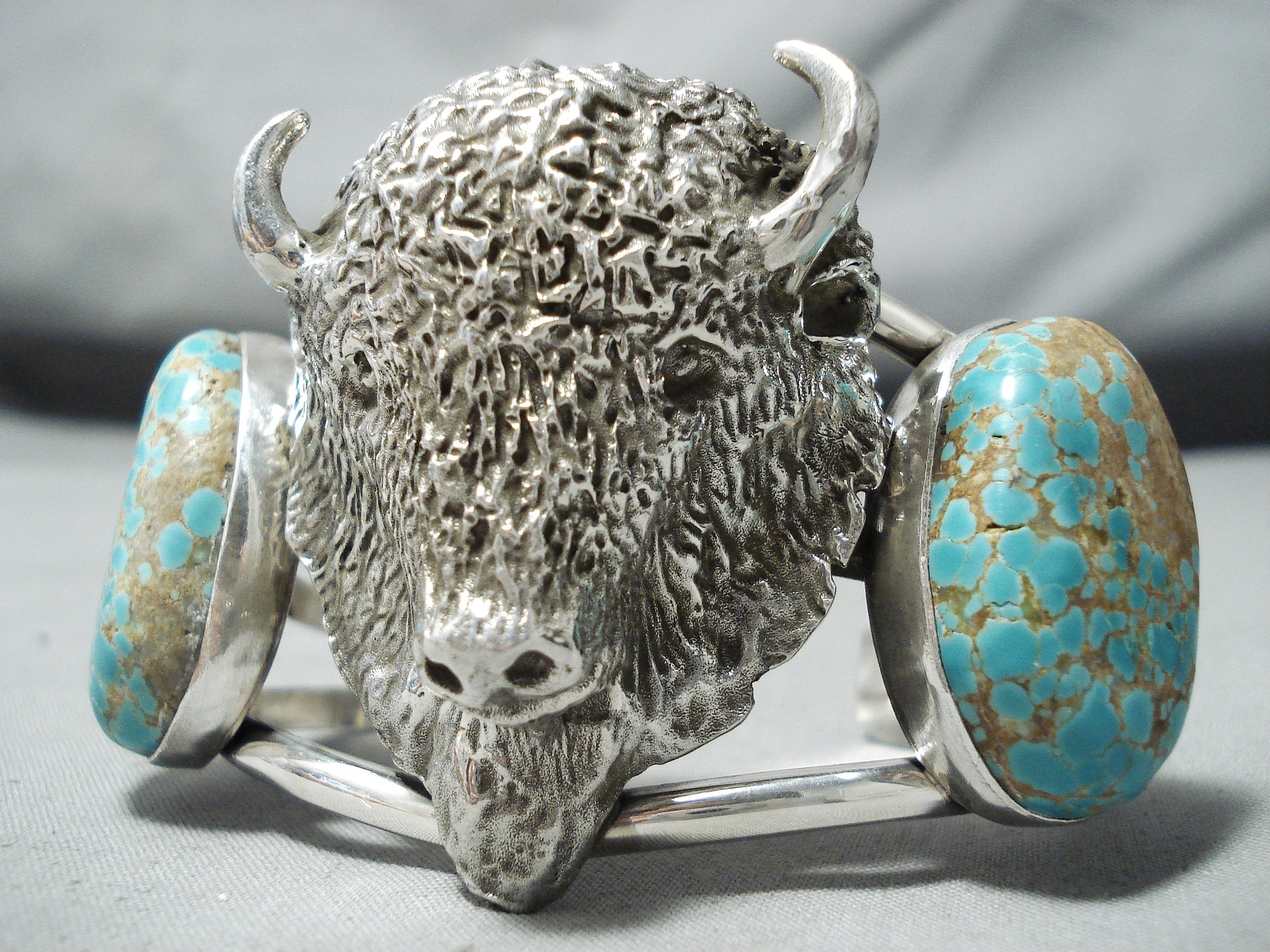 Native American Huge Heavy Buffalo Nativer American #8 Turquoise Sterling Silver Bracelet