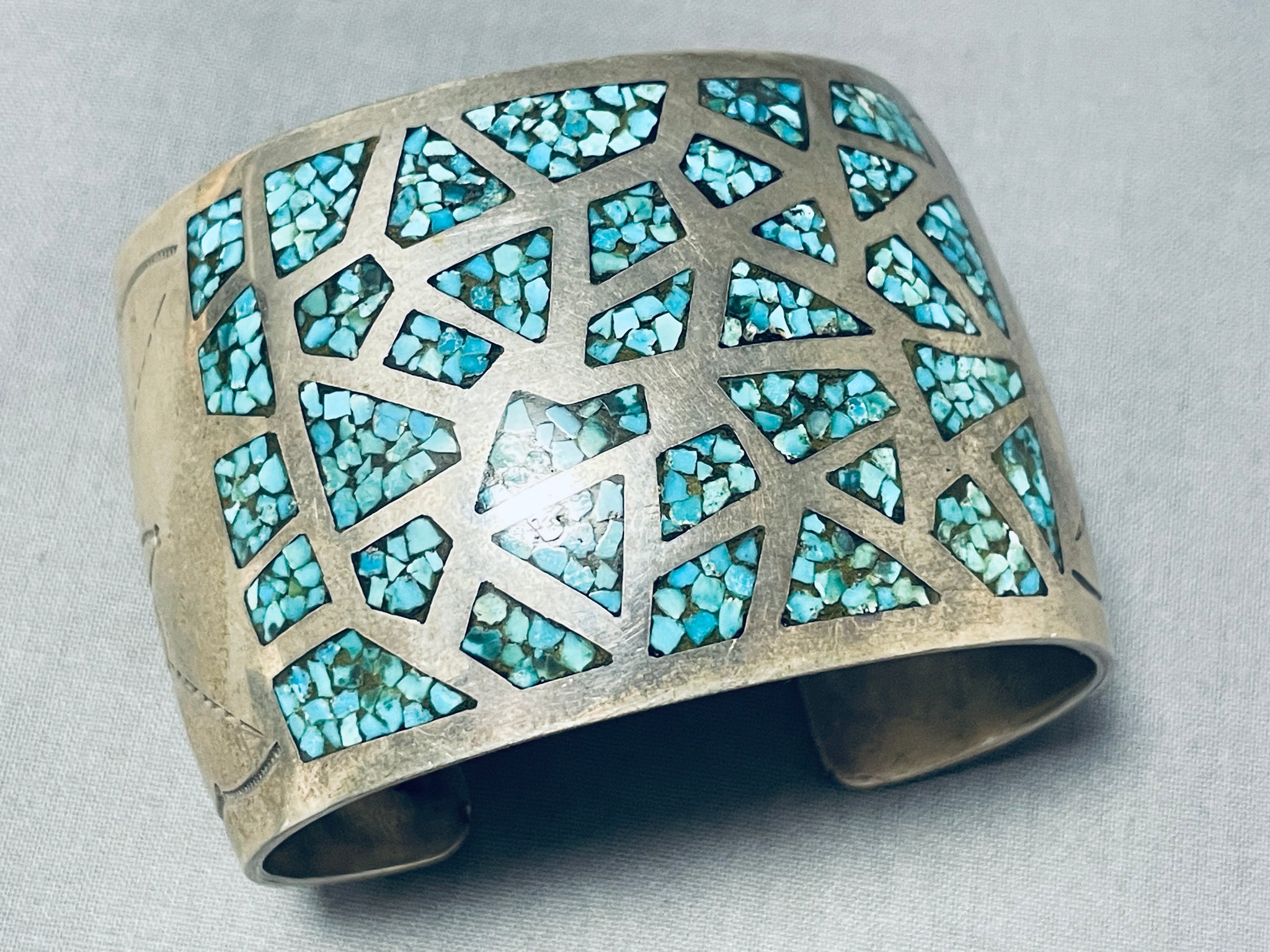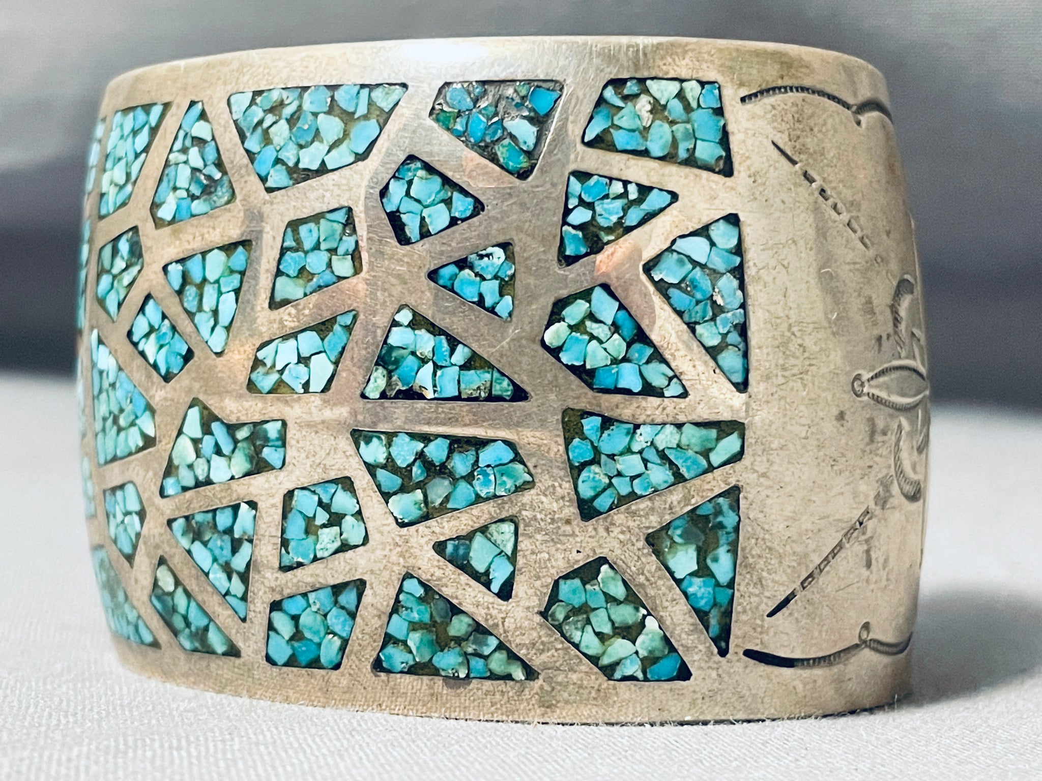 Native American Huge Vintage Navajo Turquoise Sterling Silver Inlay Mosaic Bracelet