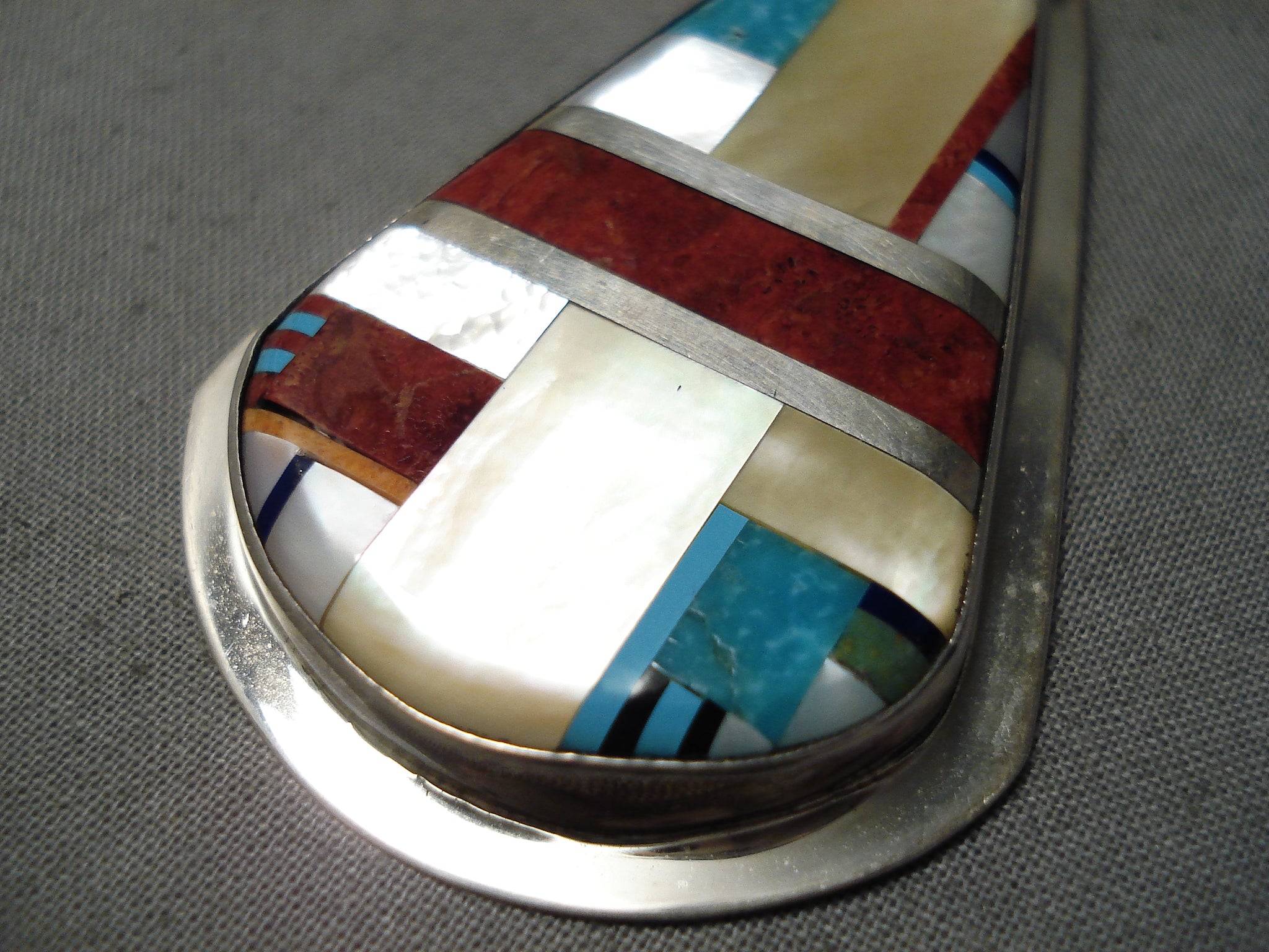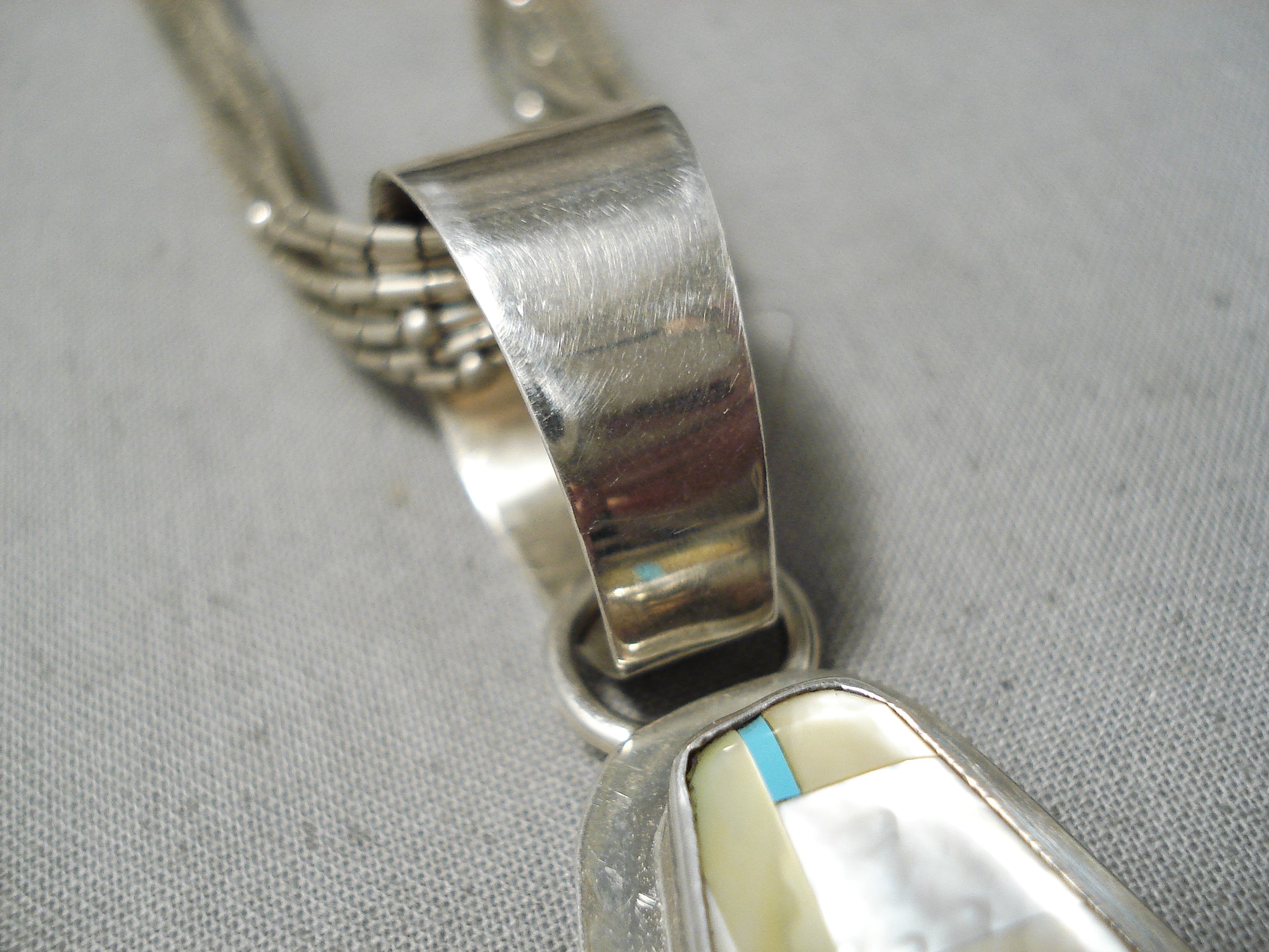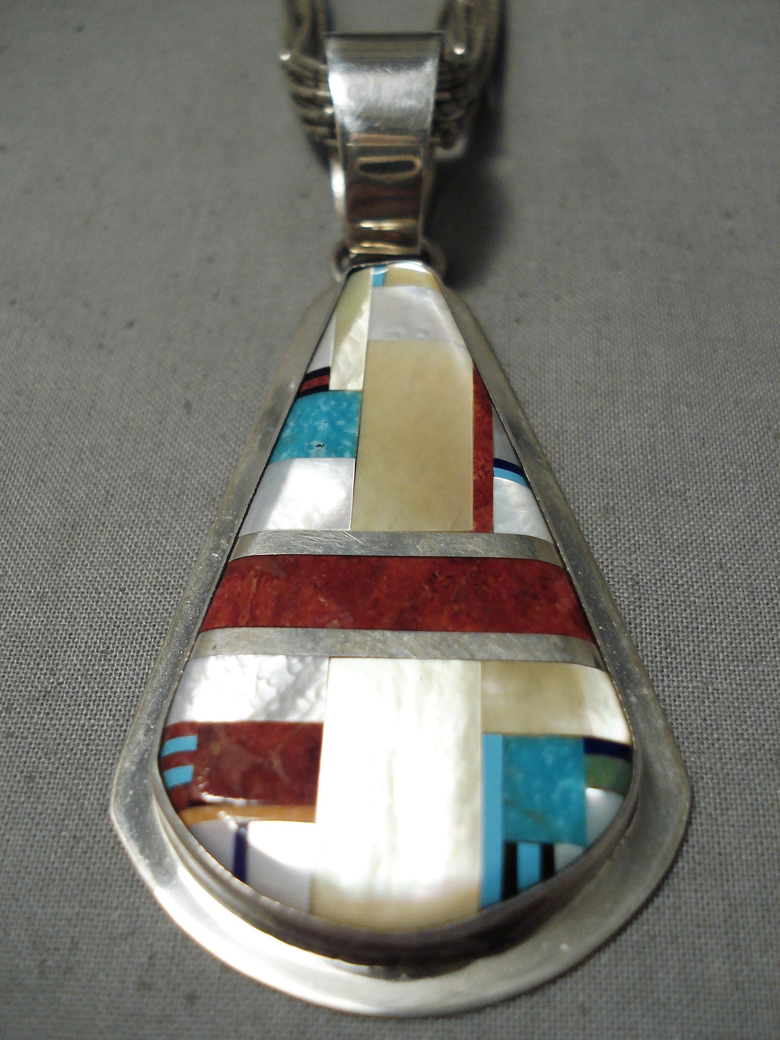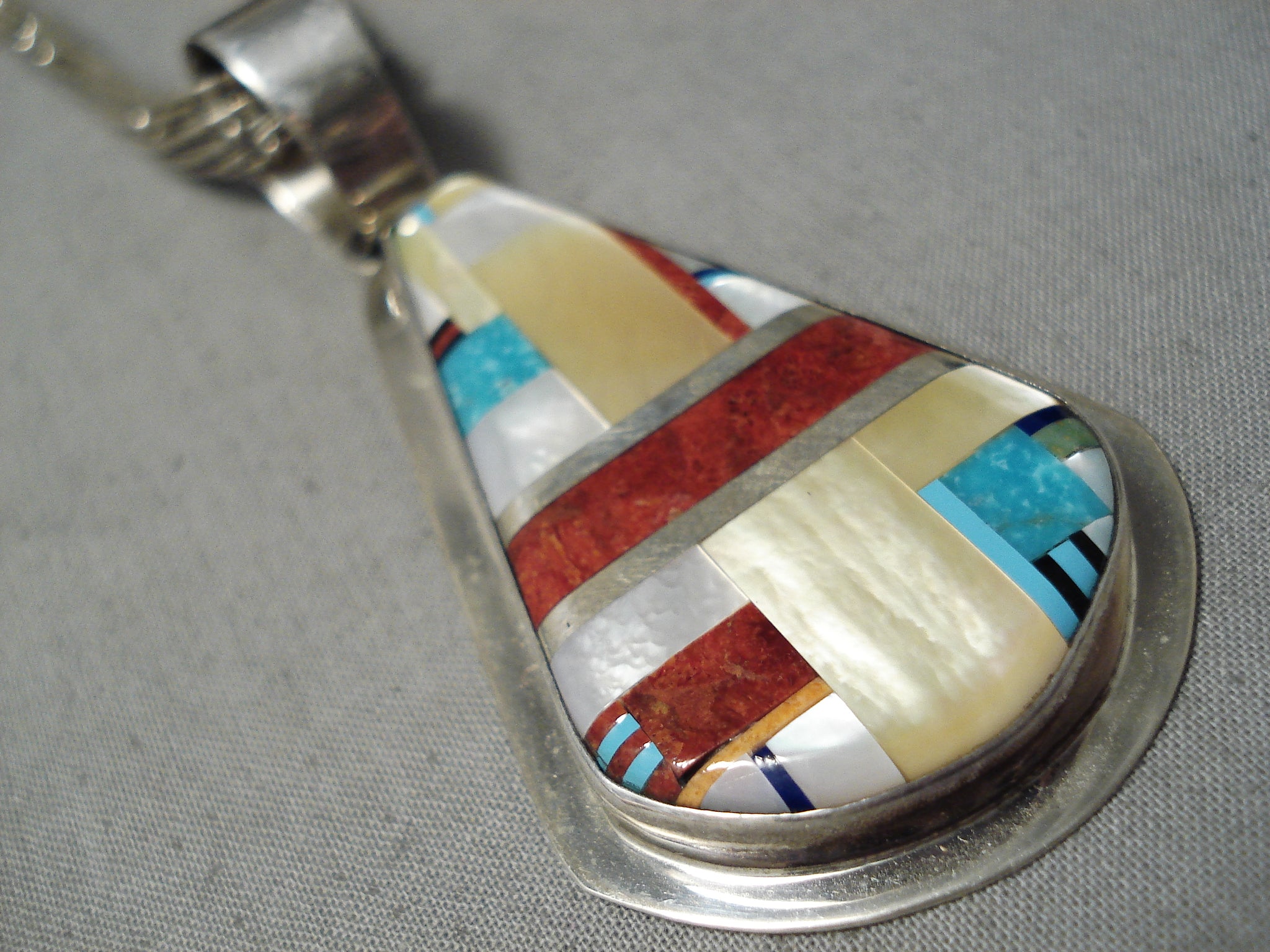 We are proud to offer this breathtaking vintage Santo Domingo silver necklace. What a special piece we have here! The pendant is a removeable large 3-3/4” x 1-1/2” teardrop shape of incredible inlay turquoise, coral and mother of pearl design. It has a huge round bail with a ¾” bail opening that will easily accommodate another necklace you may already have. But it does come with this striking necklace of a fabulous 21” ten-strand liquid silver with uniquely added silver beads and 1-3/4” antler cones – that can be worn alone or with another pendant you may already have! Two special pieces that do look astounding together! Sterling silver, marked. Santo Domingo artist Daniel Coriz. Sturdy 54 grams.