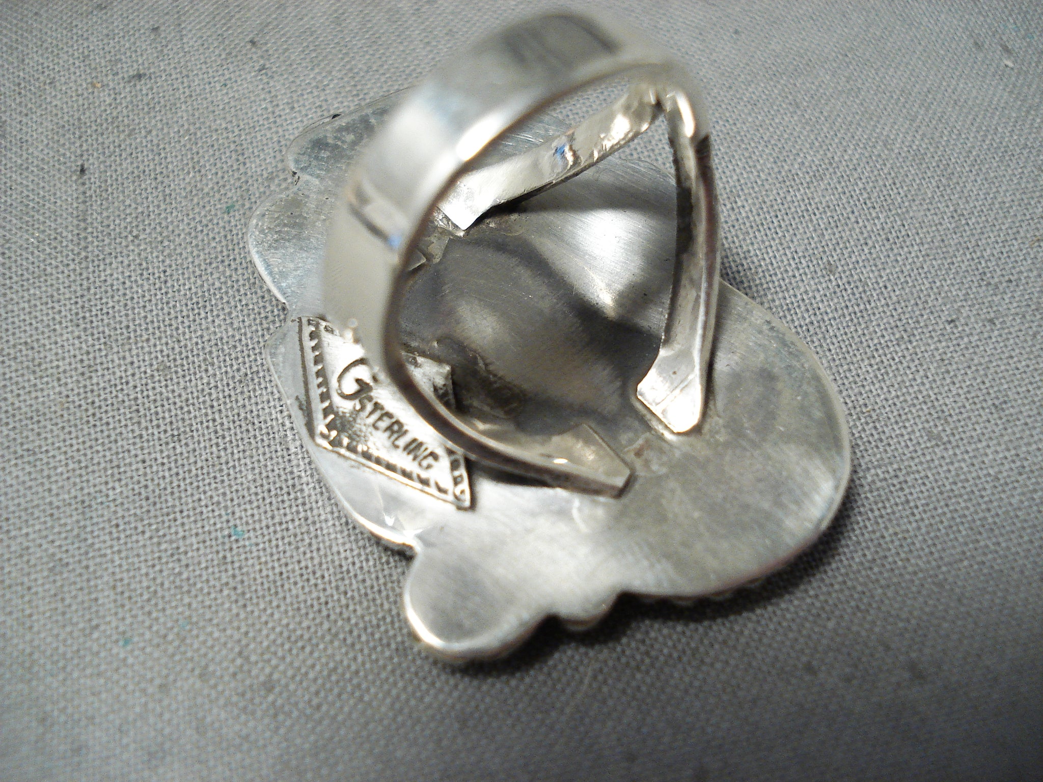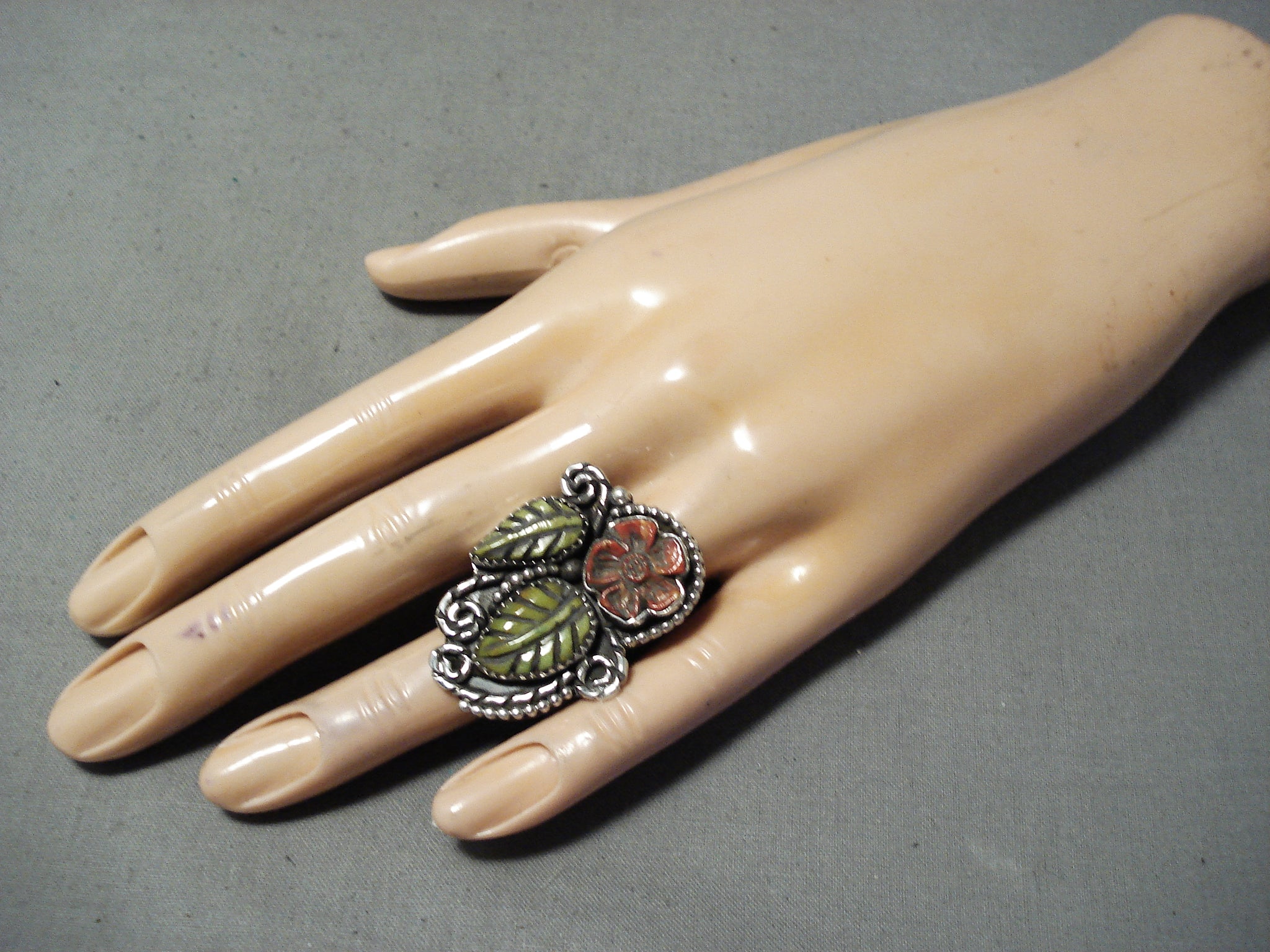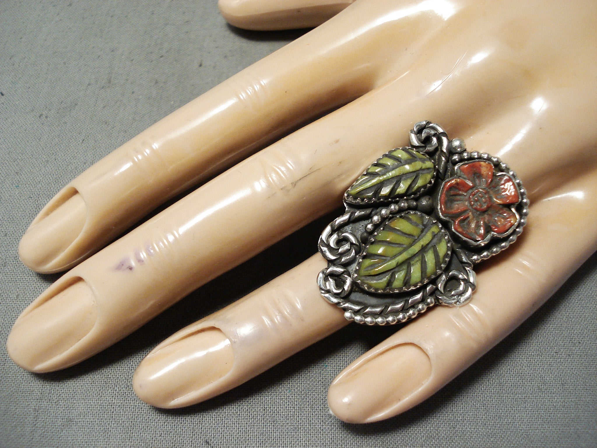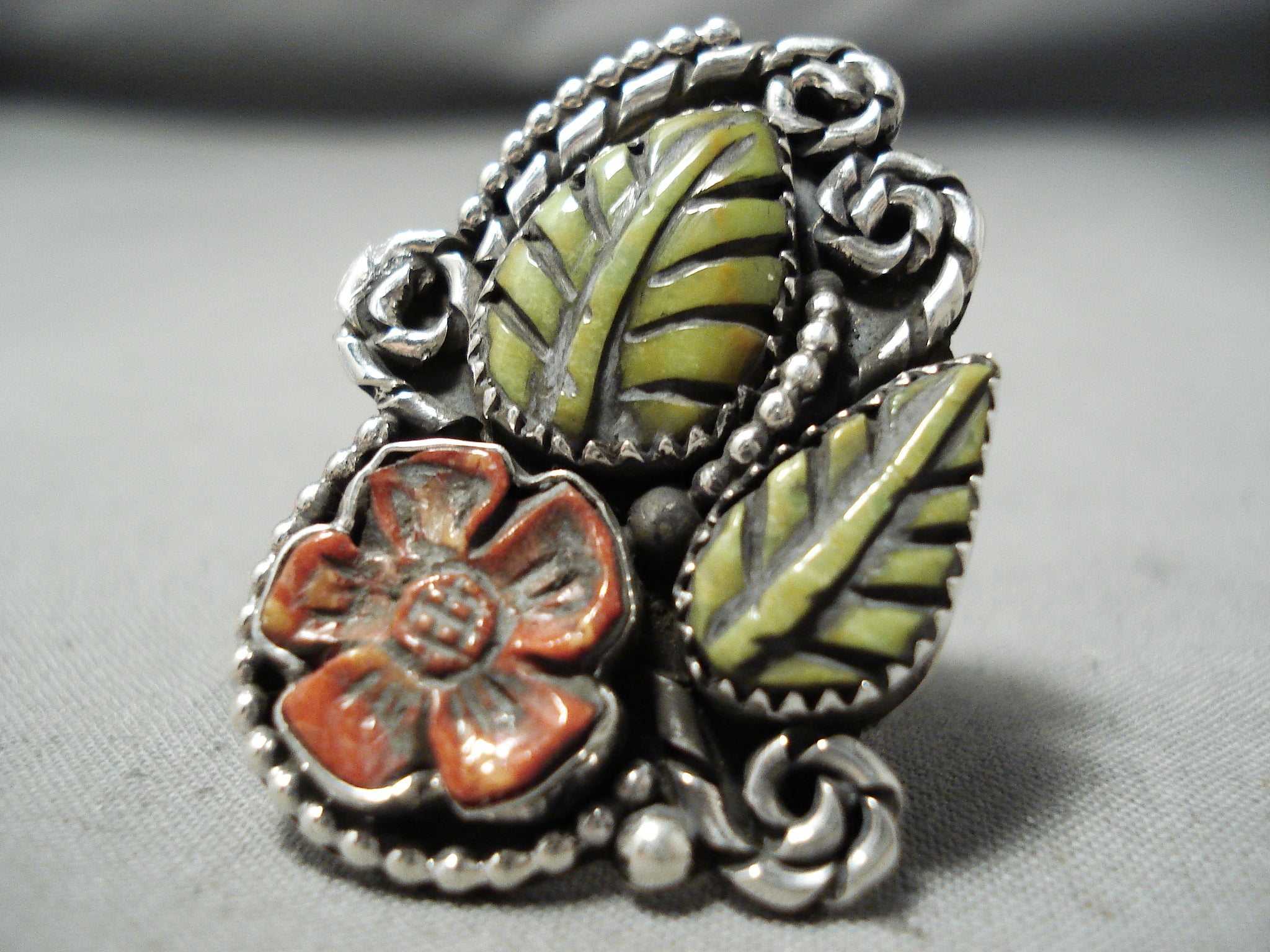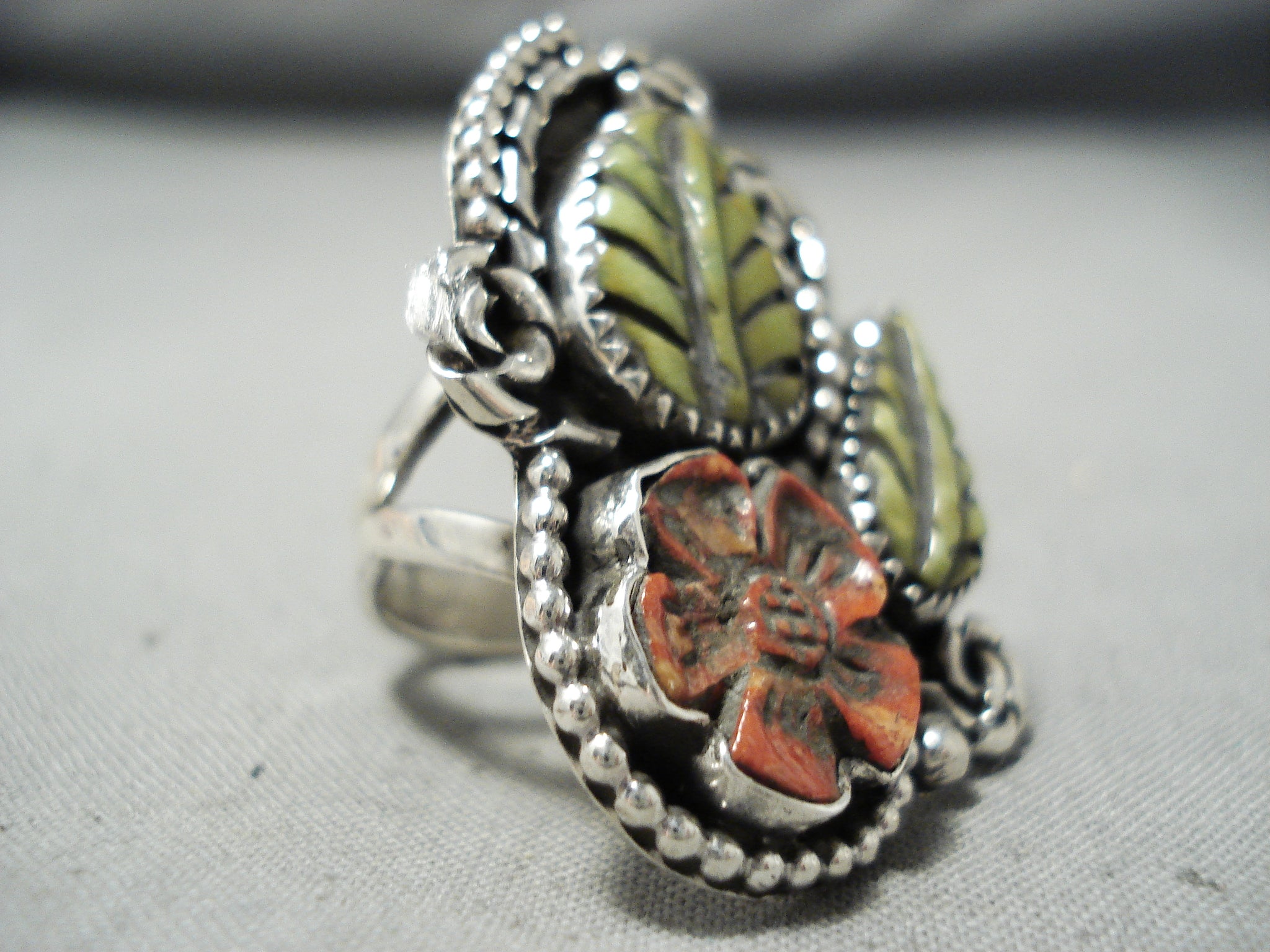 Native American Important Hand Carved Royston Turquoise Coral Sterling Silver Ring