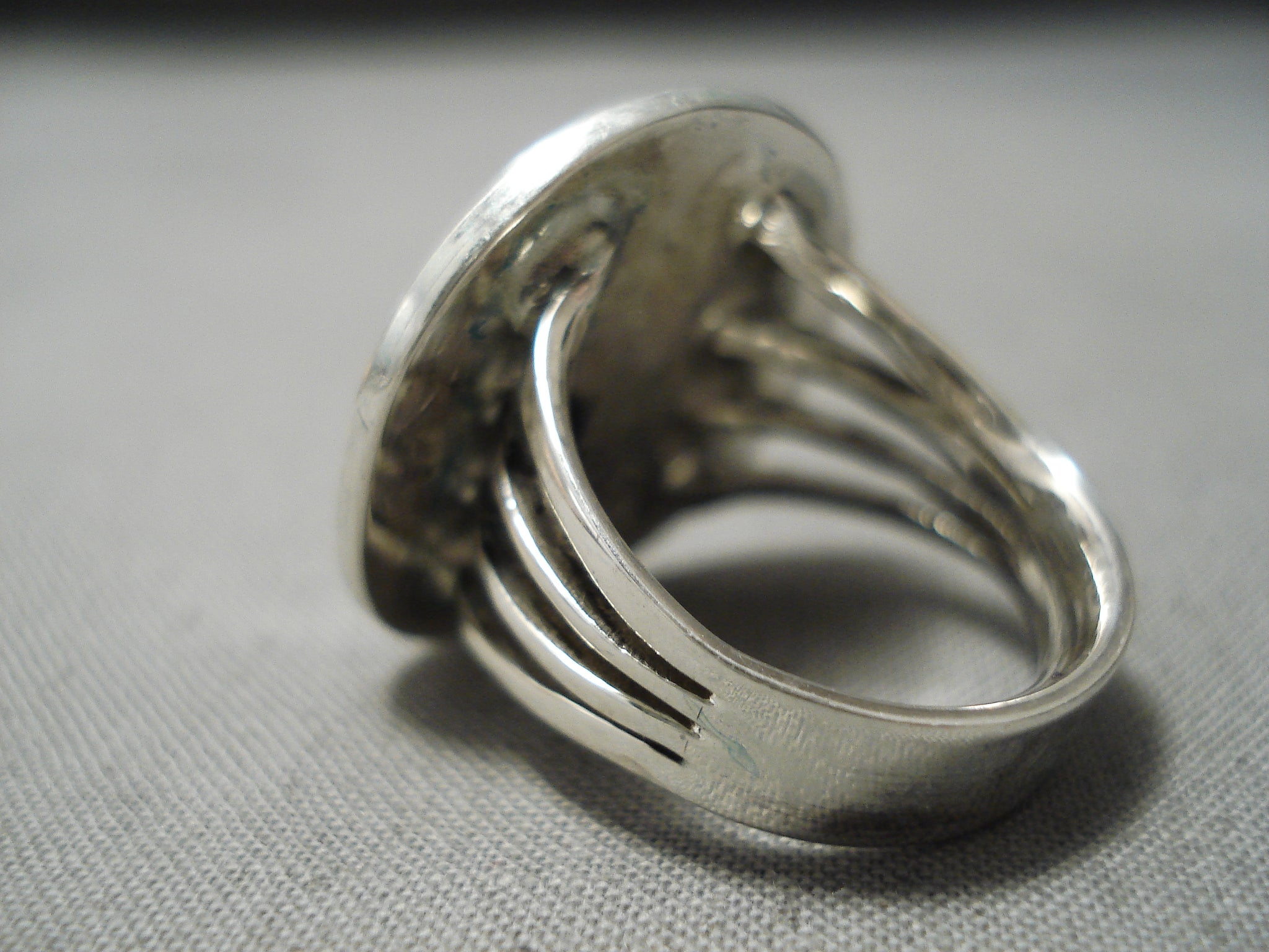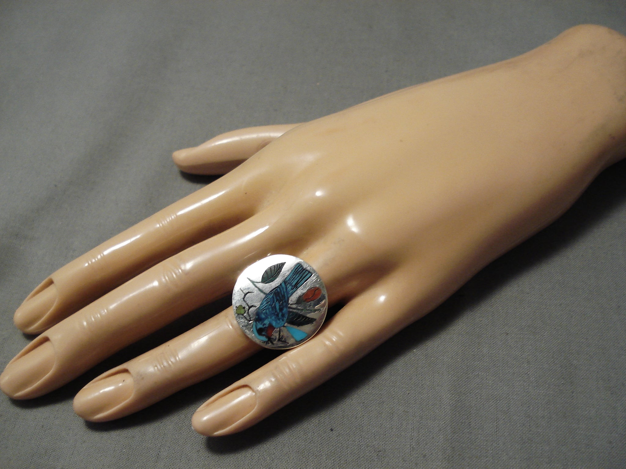 Up for sale is this striking Zuni vintage silver ring having an inlay bird of turquoise, coral, gaspeite and jet on a handcarved silver round with a handcarved quadruple silver rail band that reduces at the back! Very Unique! The ring face measures around 7/8" x 7/8". Signed by Zuni artist, Harlan Coonsis. The ring size is around 8. Sterling silver, marked. Sturdy 10 grams.