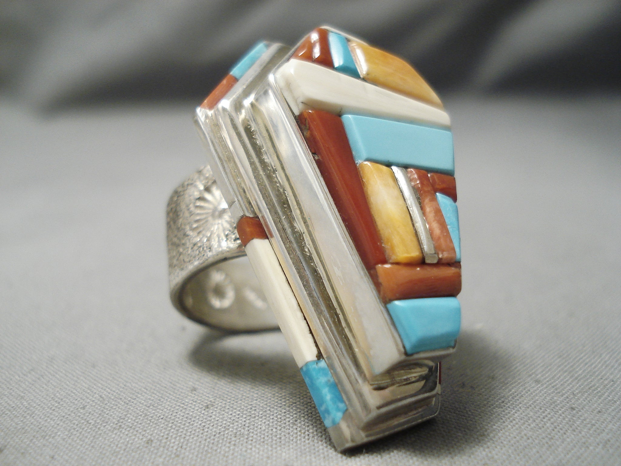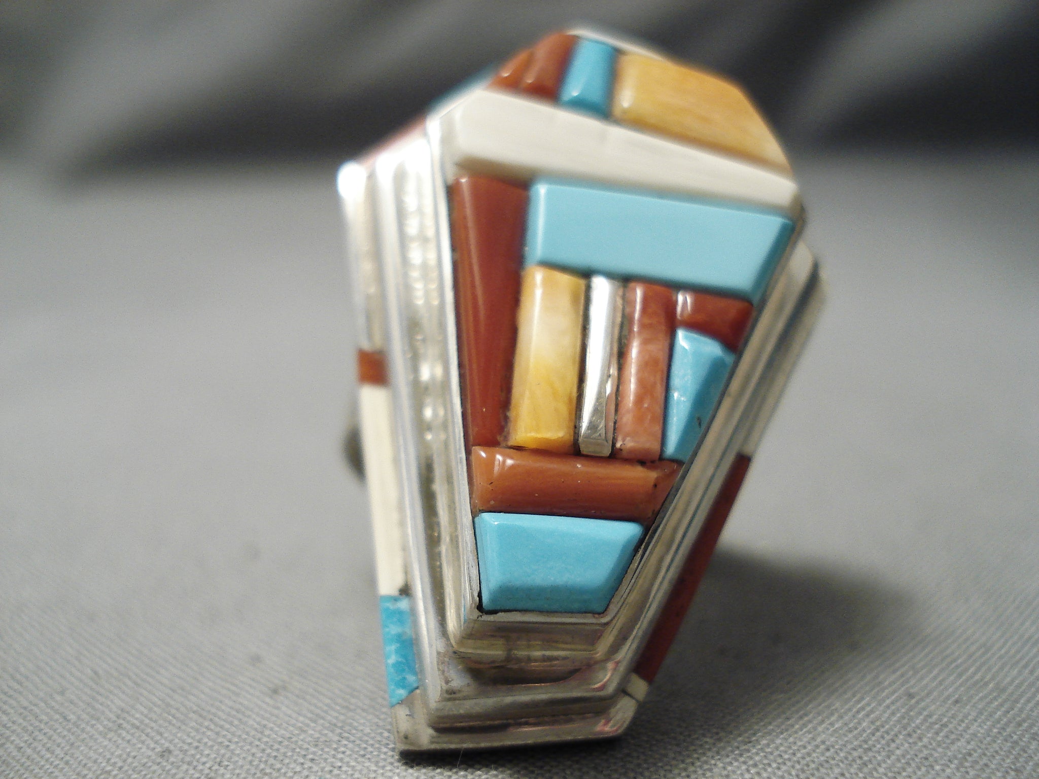Native American Important Inlay Master Navajo Turquoise Coral Sterling Silver Inlay Ring