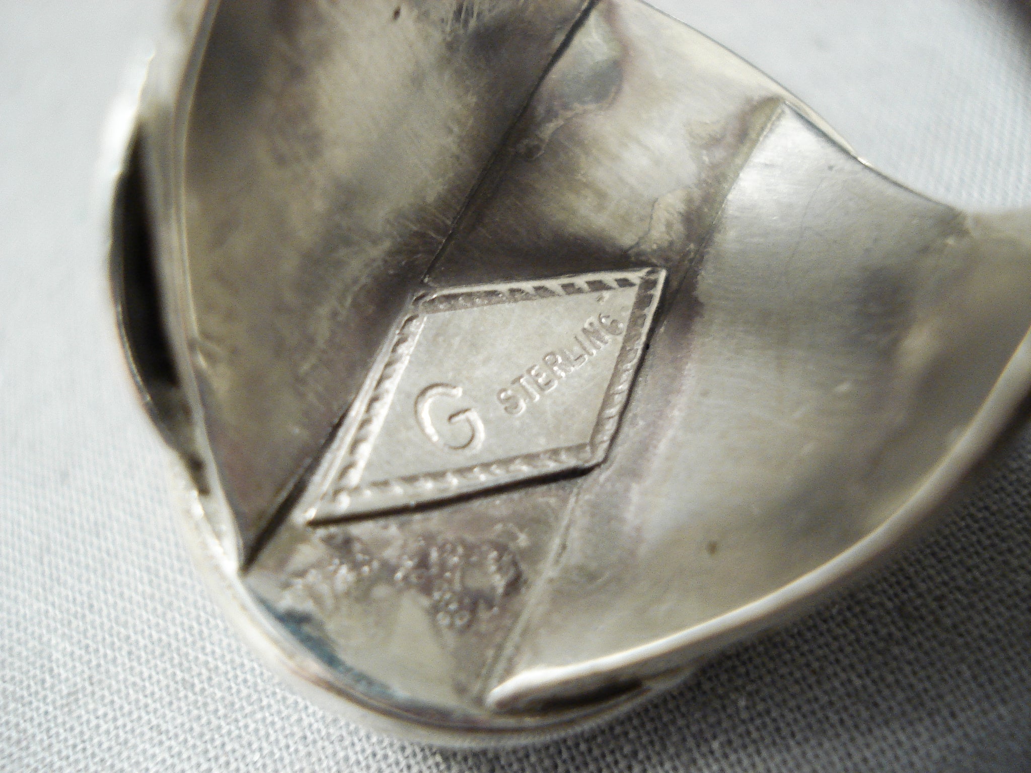 This is an amazing Mexican hand carved stone large mens silver ring handmade by the very famous artist, Francisco Gomez. This outstanding ring contains an impeccable hand carved Jasper bear stone. The intricacy of the design is absoutely incredible. Surrounding the stone are wave works with accenting large hand carved silver leaves a t the sides. Wrapping around the wonderful double silver shank are amazing stampings. The center stone measures around 1" x 7/8". The ring face measures around 1-1/8" x 7/8". Signed by Mexican artist, Francisco Gomez. The ring size is around 12. Sterling silver, marked. Sturdy 21 grams.